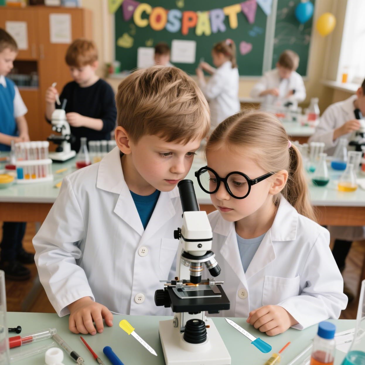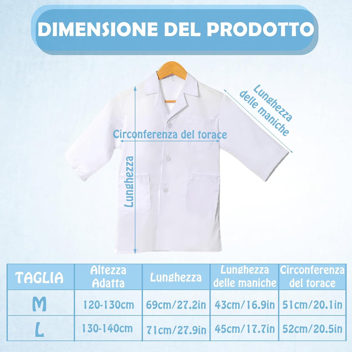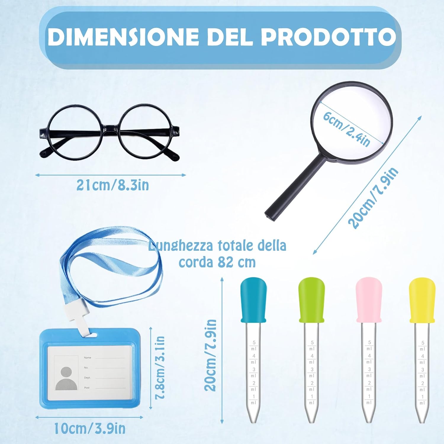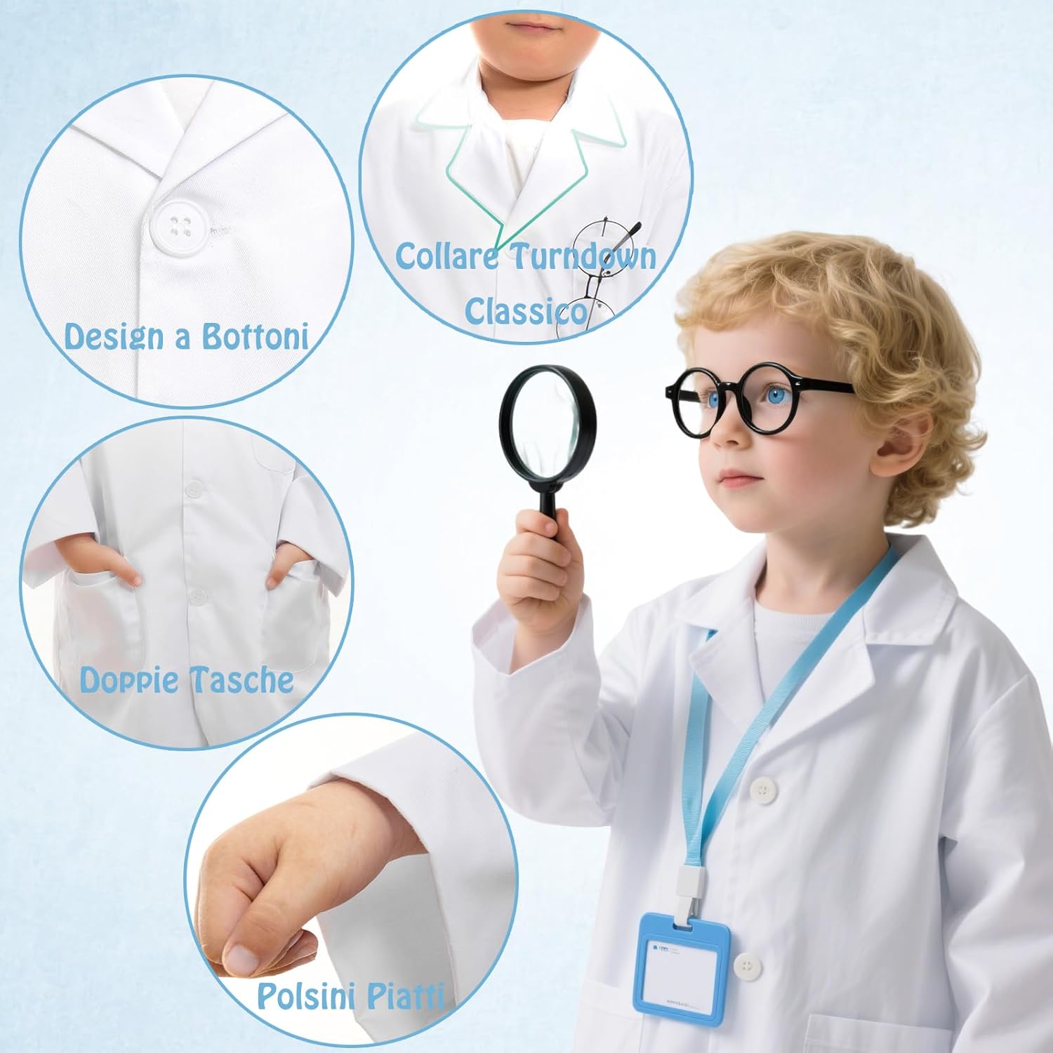 Descrizione prodotto Ricca configurazione, ripristina la scena della ricerca scientifica: il set include 1 camice da laboratorio unisex in cotone bianco, con scheda di lavoro, montatura per occhiali, lente d'ingrandimento portatile e 4 contagocce colorati. Il set completo di attrezzature aiuta i bambini a diventare piccoli scienziati/medici e a immergersi nell'esplorazione dei misteri scientifici. Applicabile a più scene, stimola il potenziale di crescita: adatto per feste in maschera a scuola, feste di Halloween, giochi di ruolo a tema, esercitazioni in classe di scienze e altre scene, aiuta i bambini a esercitare il pensiero logico e la creatività nel gioco e illumina la scienza, la medicina e altre materie. Istruzioni di sicurezza Solo per uso esterno, non mettere gli accessori in bocca. Si raccomanda che i bambini di età inferiore ai 6 anni utilizzino il prodotto sotto la supervisione di un adulto. Servizio Clienti: La vostra soddisfazione è la nostra massima priorità! Offriamo prodotti di alta qualità e un servizio clienti attento: per qualsiasi domanda o dubbio, non esitate a contattarci e vi serviremo con tutto il cuore. Consigli per l'Acquisto: 1. Odore iniziale: a causa del processo di produzione, potrebbe verificarsi un leggero odore dopo l'apertura. Si prega di riporre in un luogo ventilato per asciugare per eliminare l'odore. 2. Lavaggio e manutenzione: Riutilizzabile e lavabile a mano. Si consiglia di asciugare naturalmente ed evitare stiratura e candeggio. 3. Differenza di colore: A causa delle differenze tra i monitor, il colore visualizzato potrebbe essere leggermente diverso dal prodotto reale. 4. A causa della misurazione manuale, potrebbe esserci una deviazione di 1-5 mm. Si prega di assicurarsi che non vi dispiaccia prima di fare offerte. Avviso di sicurezza Contiene piccoli oggetti, tenere lontano dalla portata dei bambini.