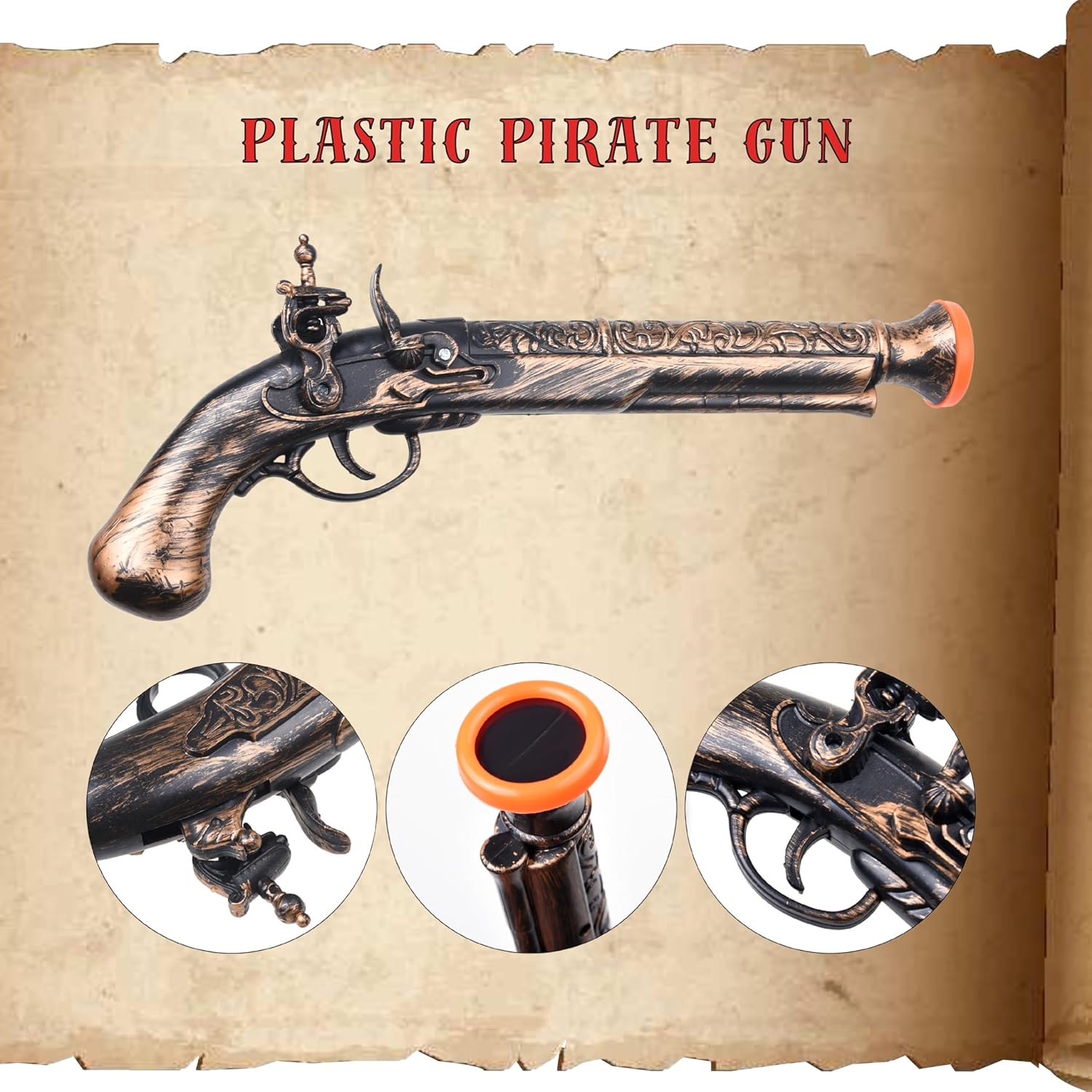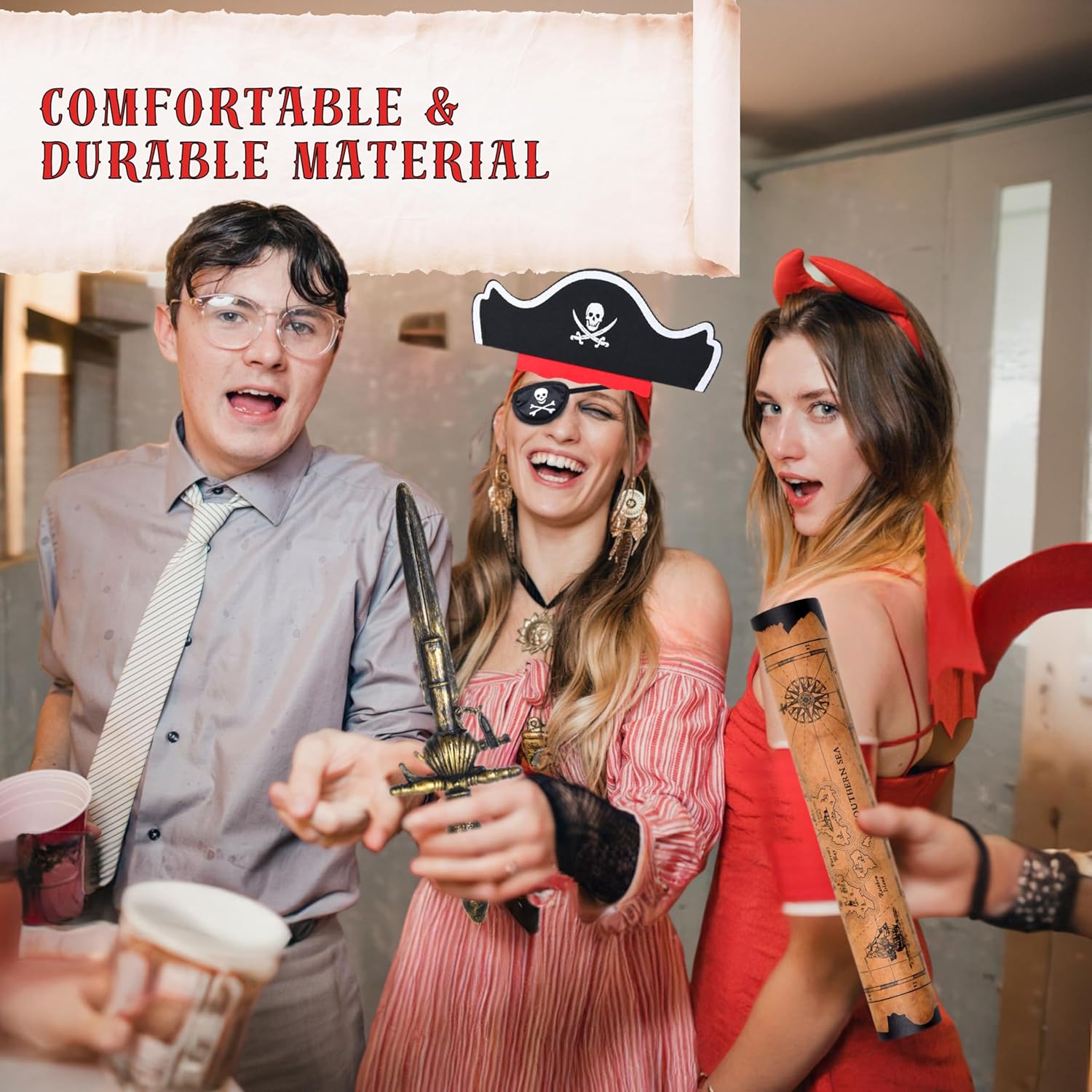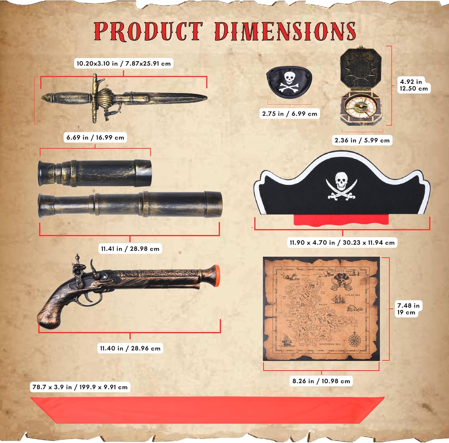 Accessori Completi per il Costume da Pirata: Questo set include 1x Telescopio, 1x Bussola, 1x Benda per Occhio da Pirata, 1x Pistola di Plastica da Pirata, 1x Spada di Plastica da Pirata, 1x Cappello da Pirata, 1x Cintura da Pirata, 1x Mappa del Tesoro adatto per ragazzi, ragazze, adolescenti e adulti. Costume da pirata ideale per bambini, costume da pirata per ragazzi, regali per feste da pirata, giocattoli da pirata, decorazioni per feste da pirata, forniture per feste da pirata, costume da pirata per bambini, costume da pirata per donna, costume da pirata per ragazze e costume da pirata per uomini. Accessori Ispirati ai Pirati Vintage: Una collezione ideale per migliorare e completare l'abbigliamento per feste di compleanno a tema pirata e costumi da marinaio. Il telescopio è regolabile da 6,69" (16,9 cm) a 11,41" (28,9 cm). La bussola misura 2,36" x 2,36" (5,9 cm) (LxL). La cintura da pirata è di 78,7" x 3,9" (200 x 10 cm) (LxL), e la benda per occhio nera misura 3,34" (8,5 cm) (L). La pistola di plastica misura 11,4" (29 cm) (L) e la spada di plastica è lunga 10,2" (26 cm) (L). Lavorazione di Alta Qualità: Realizzati con materiale di plastica resistente, il telescopio e la bussola sono progettati con l'aspetto simile all'originale. Le bende per occhi da pirata per adulti e bambini e il cappello da pirata sono realizzati in feltro di alta qualità mentre la cintura da pirata è realizzata in morbido materiale tessile. Con la pistola di plastica e la spada di pirata in mano, la pistola emette un suono simile a un colpo di pistola quando attivata. La mappa del tesoro assomiglia a un pergamena invecchiata con illustrazioni intricate e linee sbiadite. Eventi a Tema Cosplay Halloween e Feste: Il cannocchiale e la bussola fanno una deliziosa combinazione con qualsiasi abbigliamento da festa a tema. La cintura da pirata, il cappello da pirata, le bende per occhi da pirata per bambini e la benda per occhio da pirata sono perfette decorazioni da pirata e sicuramente attireranno l'attenzione e ruberanno la scena in qualsiasi raduno. Si prega di notare che il telescopio, la bussola, la spada da pirata, la pistola da pirata NON sono funzionali ma sono ottime aggiunte ai costumi e agli abiti per uomini e donne. Ideale Regalo da Pirata e Motivo Classico: Perfetto per feste a tema pirata, compleanni, produzioni teatrali scolastiche, festività di Halloween, balli in maschera, carnevali e qualsiasi altra occasione a tema pirata, questo set di costumi promette divertimento e eccitazione senza fine come decorazioni per rappresentazioni scolastiche, presentazioni teatrali, raduni retrò e feste. Costume da pirata ideale per ragazze e ragazzi e accessori da pirata per bambini, accessori da costume da pirata e accessori da pirata per donne.