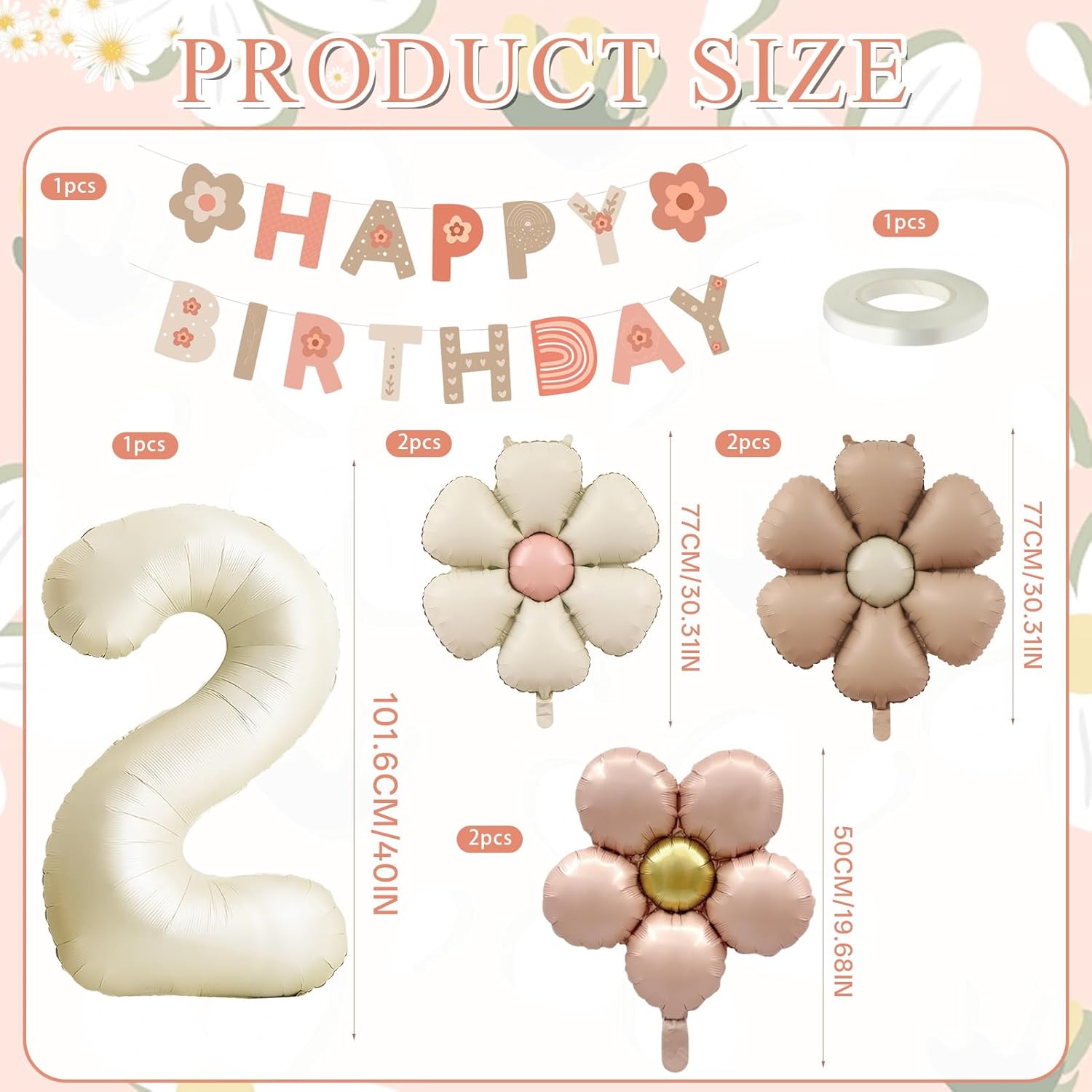 【Set di palloncini per compleanno a forma di margherita per bambina di 2 anni】: include 6 palloncini in foil a forma di margherita, 1 palloncino in foil con il numero 2 e 1 festone di buon compleanno, per un totale di 8 palloncini. Esprimi il tuo amore per la tua bambina con delicati fiori e trasforma il suo primo compleanno in una romantica festa floreale! 【Tema margherita】: questa decorazione con palloncini per bambina presenta palloncini in foil a forma di margherita. Basta soffiarci sopra e sei margherite sbocceranno all'istante! Crea un'atmosfera di compleanno fresca e incantevole e regala alla tua bambina un anniversario da ricordare! 【Decorazioni per compleanno per bambina di 2 anni】: un set per feste di compleanno progettato specificamente per bambine di 2 anni. Gli iconici palloncini in foil con il numero "2", abbinati a un delicato festone di compleanno e palloncini in foil a forma di margherita, creano una scena ispirata a Instagram e catturano i momenti di crescita della tua bambina. 【Combinazione di colori da sogno marrone e beige】: l'elegante combinazione di colori marrone e beige crea un look sognante e delicato. Che tu stia organizzando una festa a tema foresta, una festa a tema principessa o una semplice festa, si integrerà perfettamente e aggiungerà un tocco di eleganza all'ambiente! 【Adatto a diverse decorazioni per feste】: ti offriamo le decorazioni fatate più colorate, sognanti e adorabili per i compleanni dei bambini. Che si tratti di una festa di compleanno per bambine, una festa in giardino, un baby shower, una festa a tema principessa o qualsiasi altra celebrazione, è perfetta per te!