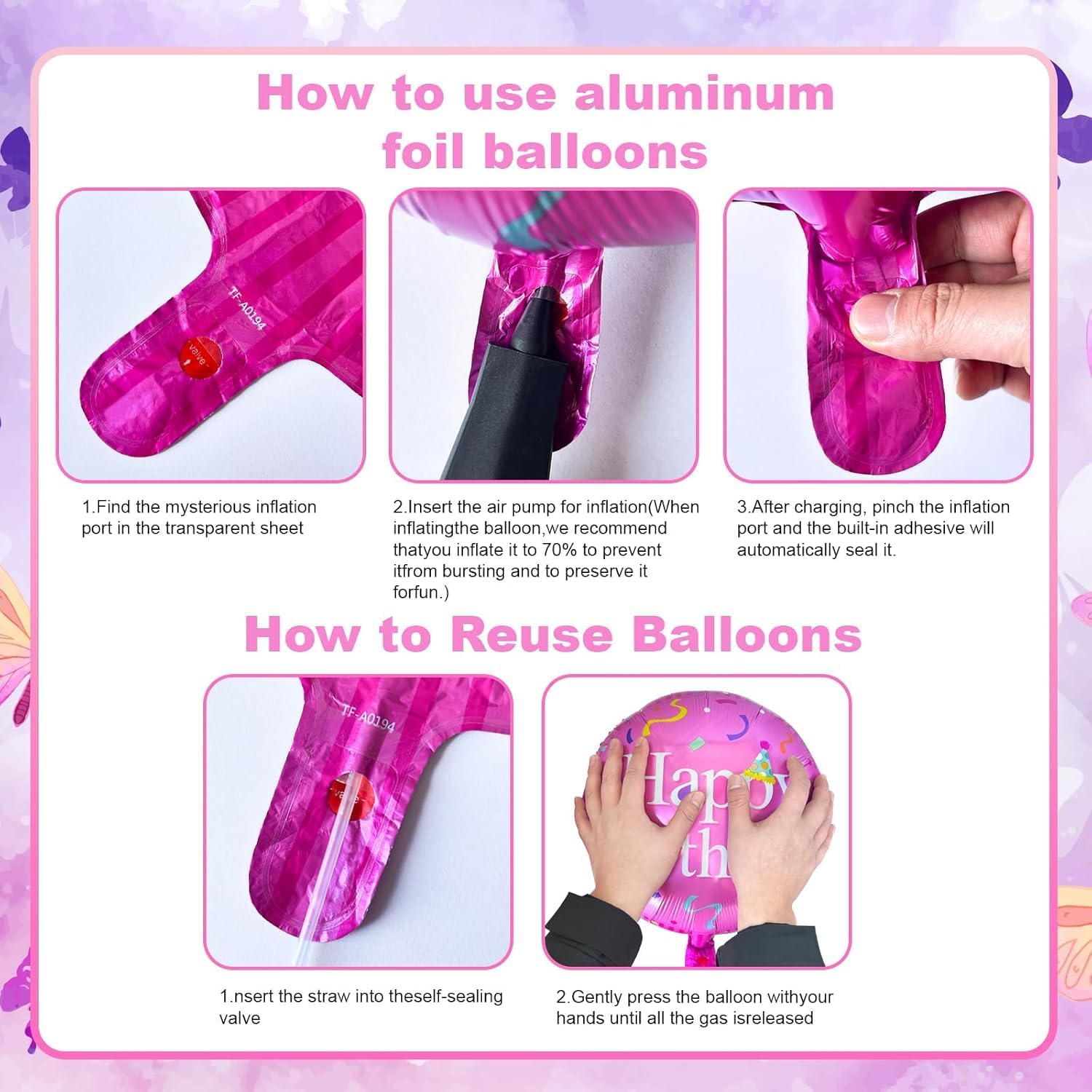 【Set di palloncini rosa】Riceverai 8 palloncini rosa, tra cui 1 palloncino con numero, 2 palloncini a forma di cuore, 1 palloncini a forma di cuore a quadri, 2 palloncini a forma di fiocco e 2 palloncini rotondi. 【Materiali di alta qualità】I palloncini per il compleanno delle bambine sono realizzati in alluminio di alta qualità, con colori vivaci, resistenti allo sbiadimento e alle rotture, e riutilizzabili. 【Design raffinato】Il set di palloncini per il compleanno delle bambine è realizzato in tonalità rosa e comprende palloncini a forma di cuore, fiocco, cerchio, numero e altre forme, in grado di creare un'atmosfera da festa romantica e da sogno. 【Facile da usare】Una volta gonfiati, i palloncini per il compleanno delle bambine si sigillano automaticamente premendo l'apertura e possono essere riempiti con elio o aria, risparmiando tempo e fatica. 【Diverse occasioni】Il set di palloncini rosa è adatto per feste di compleanno, decorazioni festive, anniversari, feste a tema e altre occasioni. Sono disponibili diversi palloncini con numeri per soddisfare le esigenze di diverse fasce d'età.