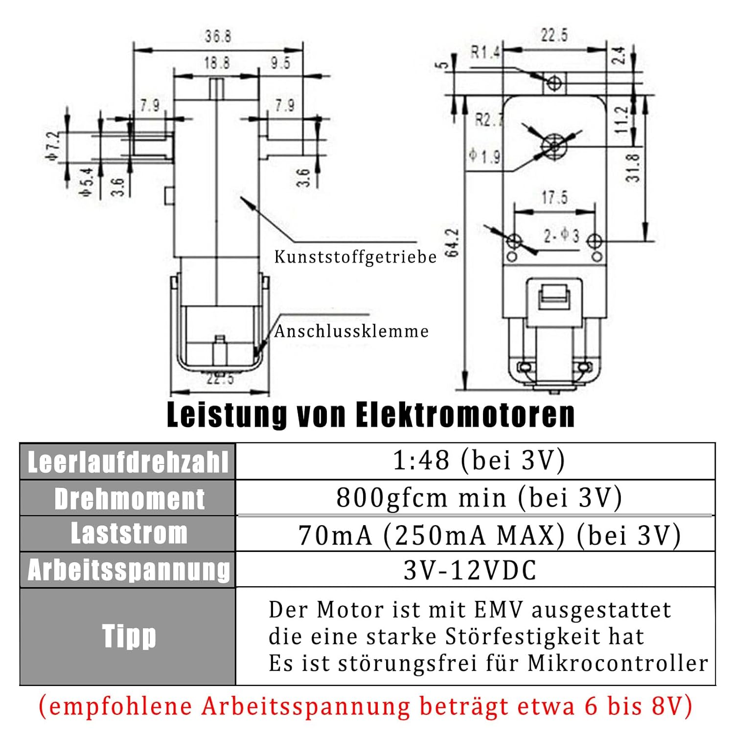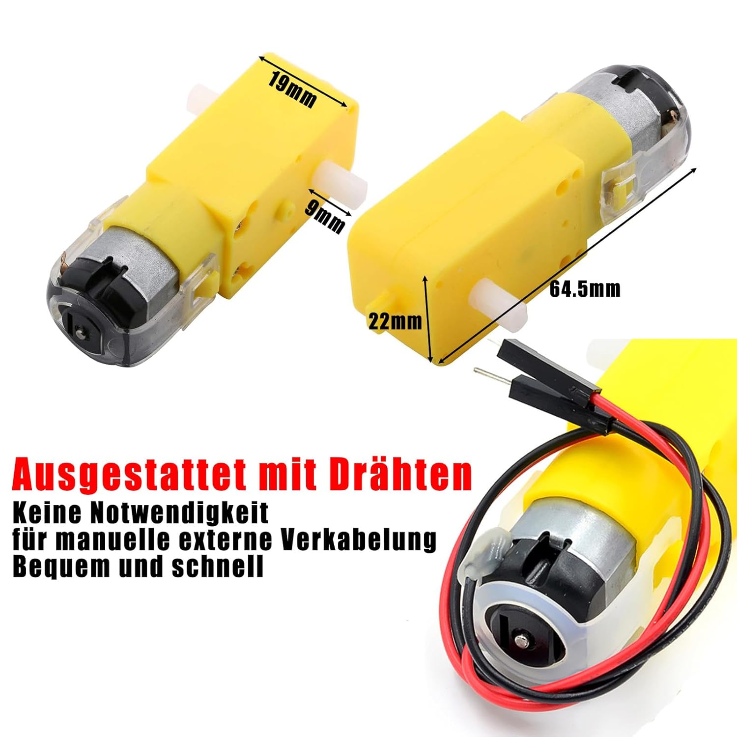 Caratteristiche del prodotto: motore 1:48 TT per robot di movimento ha capacità anti-interferenza (la lunghezza della linea è di circa 20 cm) Tensione di esercizio: 3 V-12 VDC (la tensione di lavoro consigliata è di circa 6 fino a 8 V), corrente di carico: 70 mA (250 mA max) (a 3 V) Materiali di alta qualità: industria di precisione, materiali di alta qualità Scenari applicabili: uso per prodotti di giocattoli elettrici come prodotti elettronici di ricerca scientifica, corpo umano elettrico robot, fucile giocattolo a bolle d'aria, auto giocattolo a trazione integrale, giocattolo per aerei, prodotti a vibrazione, ecc La confezione include: 8 motoriduttori GERUI TT DC con pre-cablato (suggerimento: questo prodotto è disponibile in due versioni: con e senza fili. Si prega di distinguere attentamente tra loro)