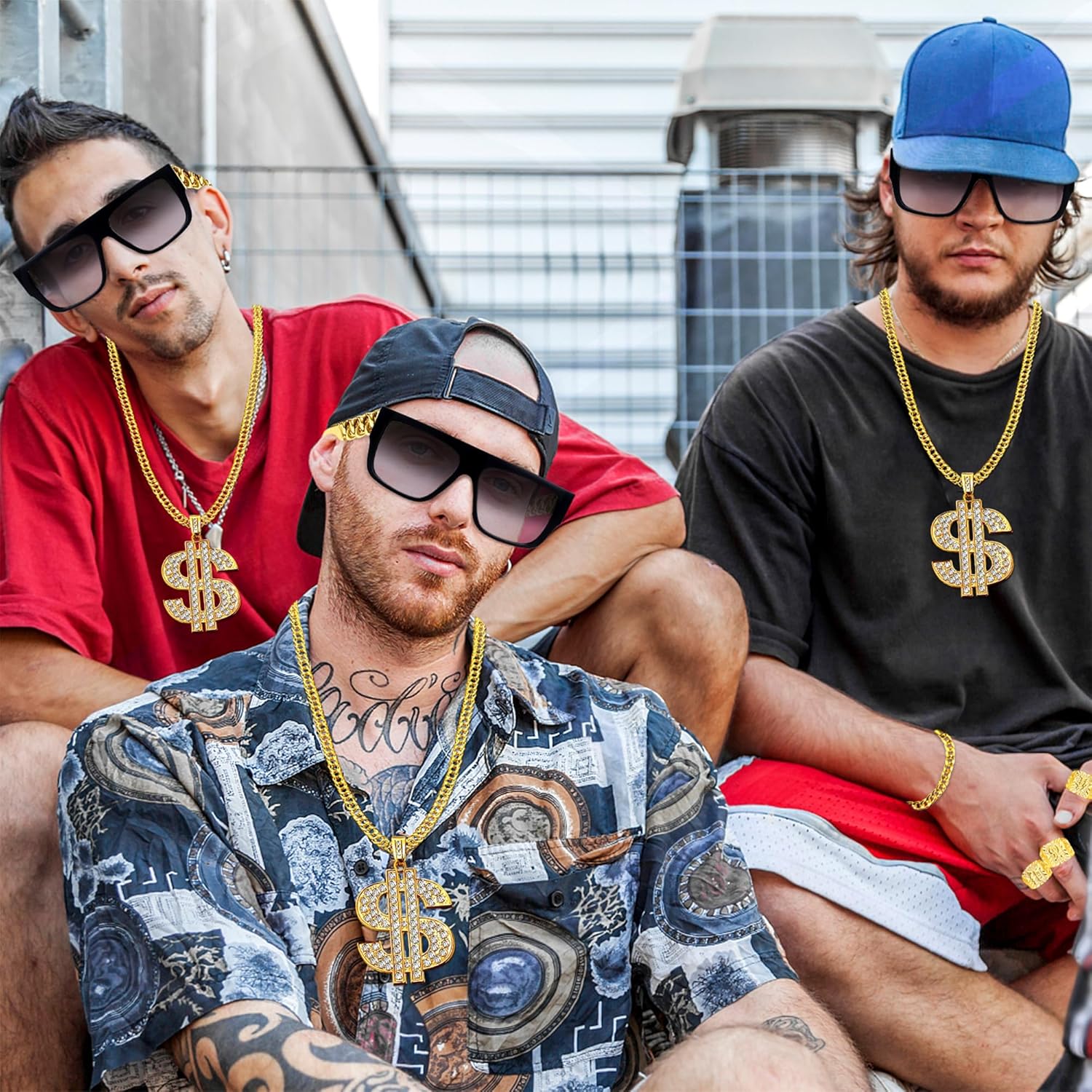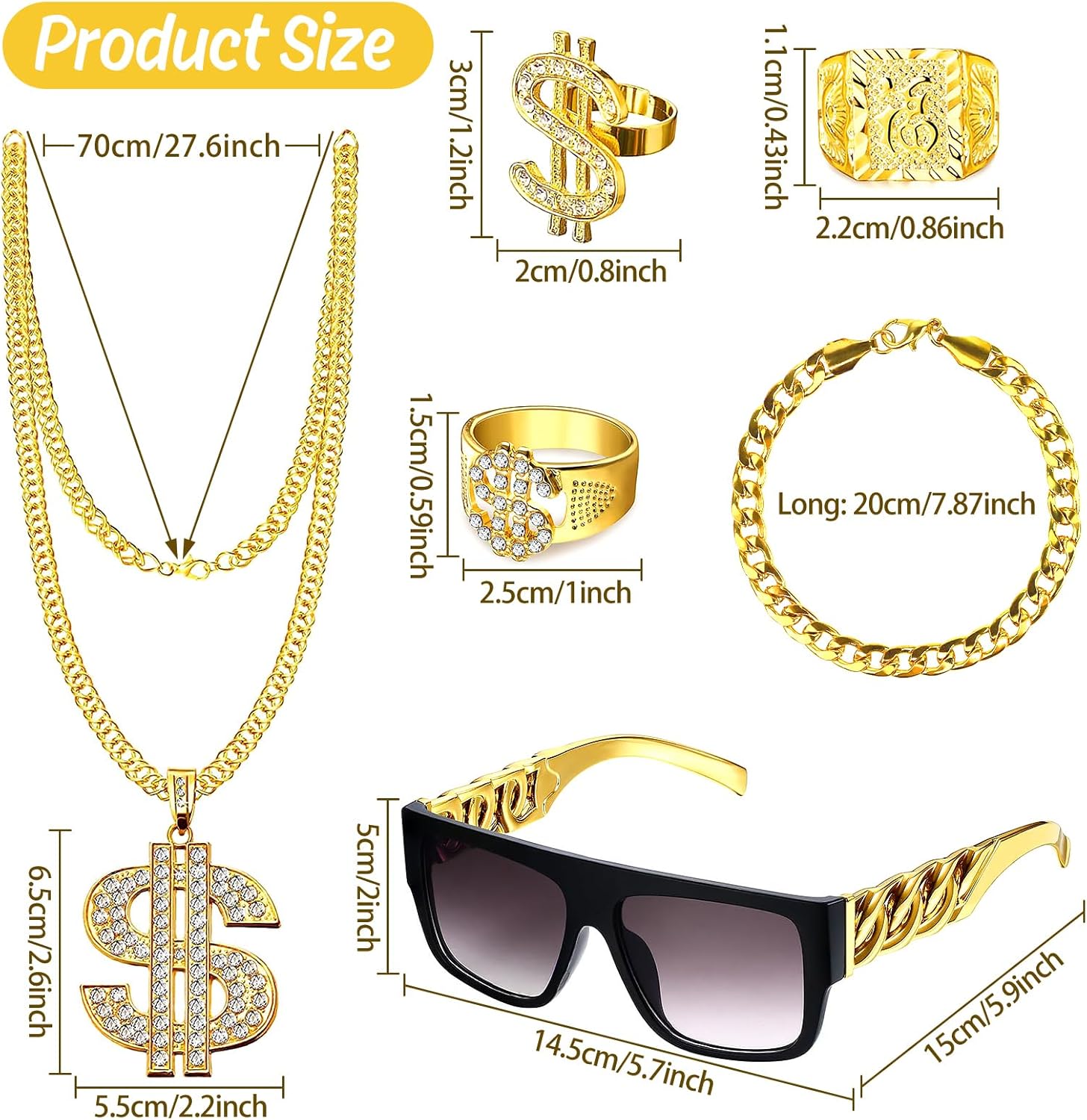 Vorteile: ✅ Alles dabei, was man für den Look braucht: Im Set enthalten sind u. a. zwei verschiedene Ketten (eine mit Dollarzeichen), Sonnenbrille, mehrere auffällige Ringe und weitere Accessoires. Man braucht nichts mehr extra zu kaufen – ideal für ein kurzfristiges Kostüm. ✅ Optisch laut und auffällig: Gerade im Partylicht oder auf Fotos kommt das goldene Zubehör sehr gut rüber. Die Dollarzeichen-Kette, die grobe Gliederkette und die großen Siegelringe sehen aus der Distanz beeindruckend protzig aus – genau wie gewollt. Auch die Sonnenbrille passt perfekt zum Thema. ✅ Leicht und angenehm zu tragen: Da alles aus Kunststoff besteht, ist es superleicht. Die Ketten und Ringe stören auch bei längerem Tragen nicht. Kein Metall, das anläuft oder kratzt. ✅ Ideal für Karneval, Fasching, JGA oder Comedy-Verkleidungen: Das Set funktioniert für viele Rollen: 80er/90er-Rapper, überzeichneter Zuhälter, Gangster-Parodie, Trash-Ikone – mit einem passenden Mantel und Hut ist das Outfit in 5 Minuten komplett.
