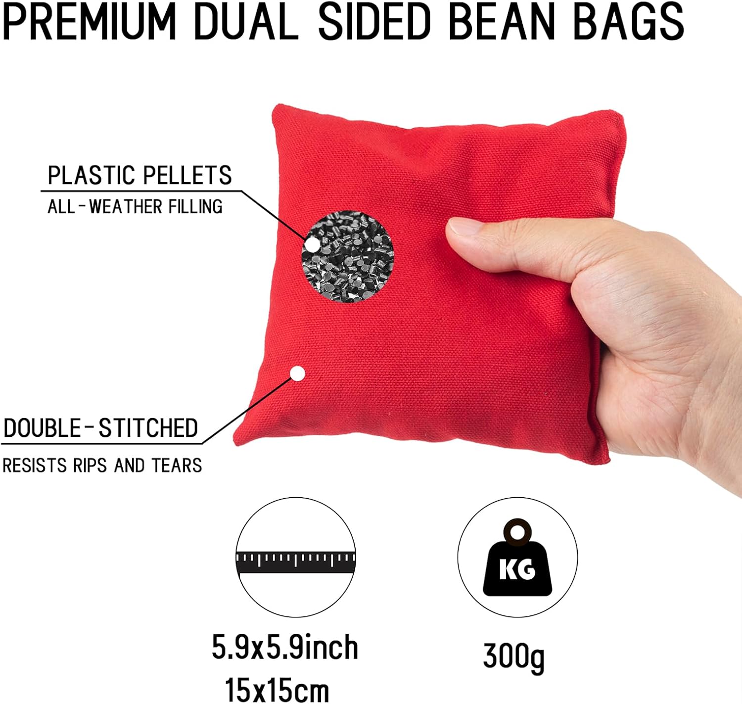 Dimensioni e peso regolamentari e sacchetto di stoccaggio: Dimensioni regolamentari (15x15cm) e peso standard (10-11 once) di ogni sacco da cornhole professionale. Il set di 8 sacchi da cornhole regolamentari include una pratica borsa per riporre il set e portarlo al parco o alle feste Materiale durevole: I nostri sacchetti di cornhole di qualità superiore sono realizzati in tela resistente, con eccellente resistenza allo strappo, durata e resistenza all'usura. Perfetto per qualsiasi tipo di gioco di lancio di sacchi di fagioli (erba, ghiaia, cemento).Hanno una bella sensazione di tocco facile da afferrare e lanciare e godere del gioco originale cornhole con i tuoi amici Resistente alle intemperie: I nostri sacchi di mais resistenti alle intemperie sono riempiti con pellet di plastica, rendendoli resistenti alle intemperie e alle creature. Potete giocare al vostro gioco di lancio di sacchi di fagioli all'aperto in qualsiasi momento. E anche se vengono conservati per lungo tempo, non ammuffiranno Perfetto per tutte le età: Ottimo per adulti e bambini che amano giocare a corn holes in occasione di feste, barbecue nel cortile, feste di fine anno, riunioni e qualsiasi altra occasione Cosa si ottiene: Set di 8 sacchi per cornhole, 1 borsa per il trasporto. La vostra soddisfazione è il nostro inseguimento incessante. Se c'è qualche problema con i nostri sacchetti di cornhole, si prega di contattarci, dobbiamo provare il nostro meglio per trattare con esso. Vi auguriamo di giocare felicemente e di avere una buona vacanza