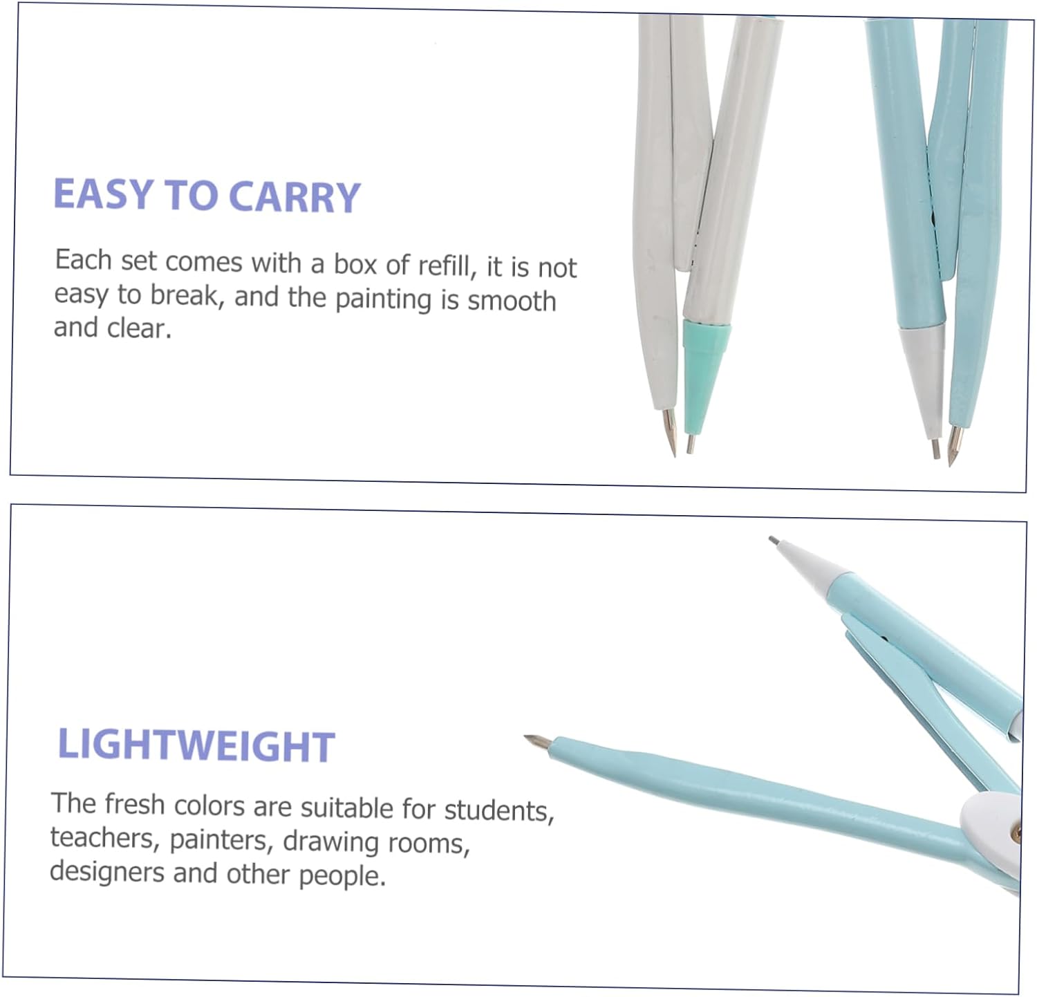 Compasso da disegno: uno strumento per disegnare che ti offre grande comodità. Bussola per geometria per studenti: ci sono quattro set in totale e ogni set contiene una scatola di ricariche per soddisfare le tue esigenze di lavoro e studio. Forniture per ufficio e scuola Bussola portatile: per matematica, geometria, arte, design, disegno tecnico e altri campi, materiale da disegno Sussidi didattici per la matematica: l'impugnatura della bussola è antiscivolo, quindi puoi tenerla comodamente e usarla facilmente. Disegno di cancelleria per bussola per studenti: l'uso di materiali non lo rende facile da piegare e deformare. cerchio di disegno