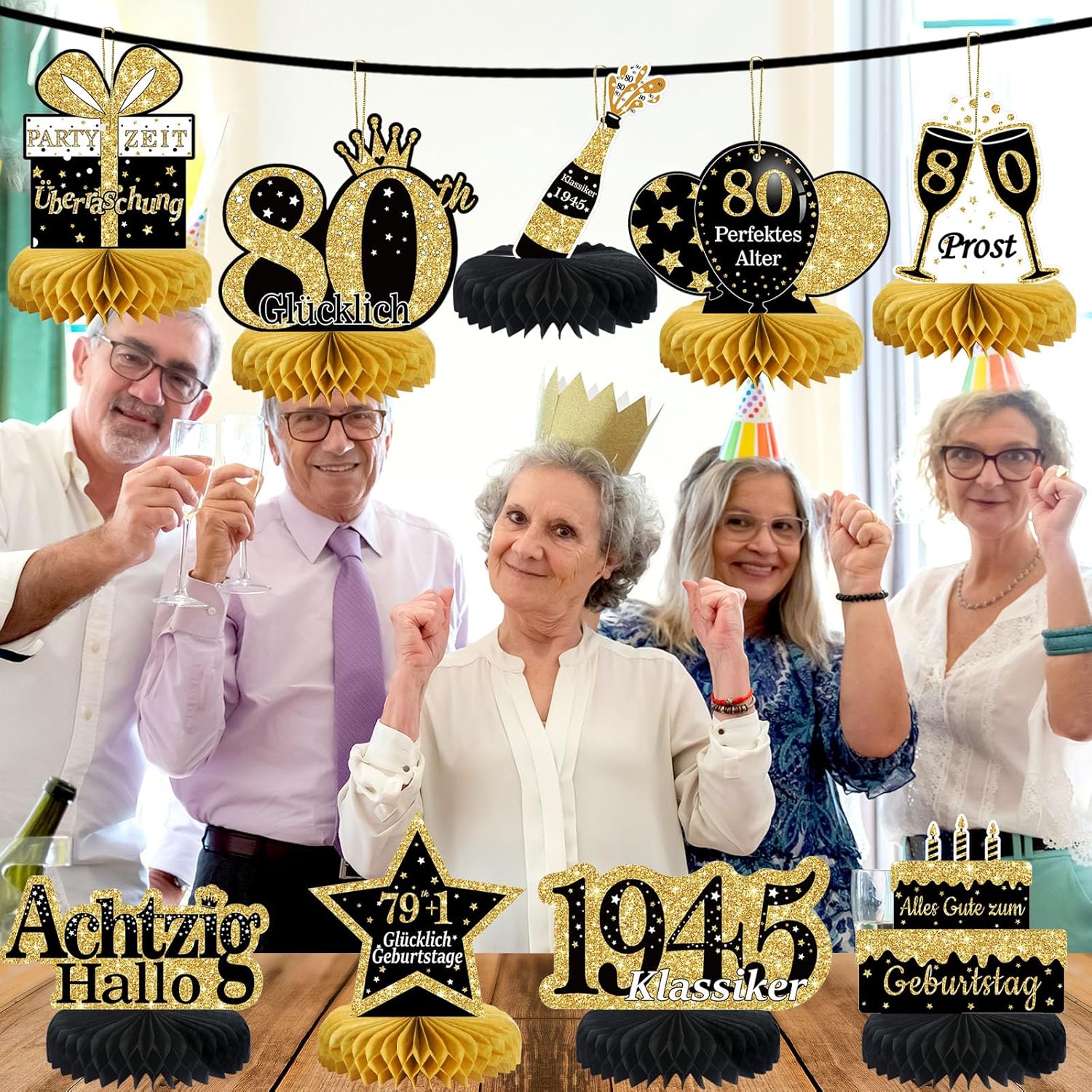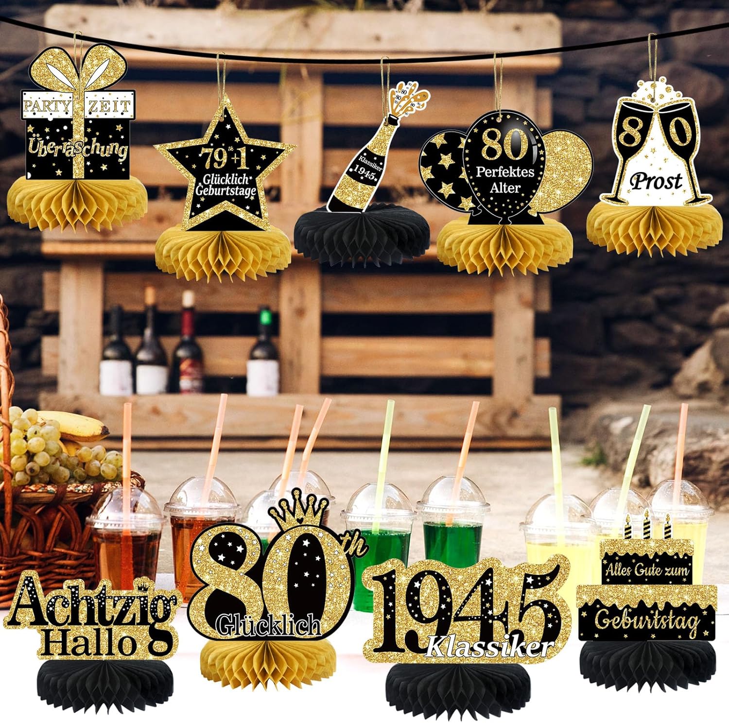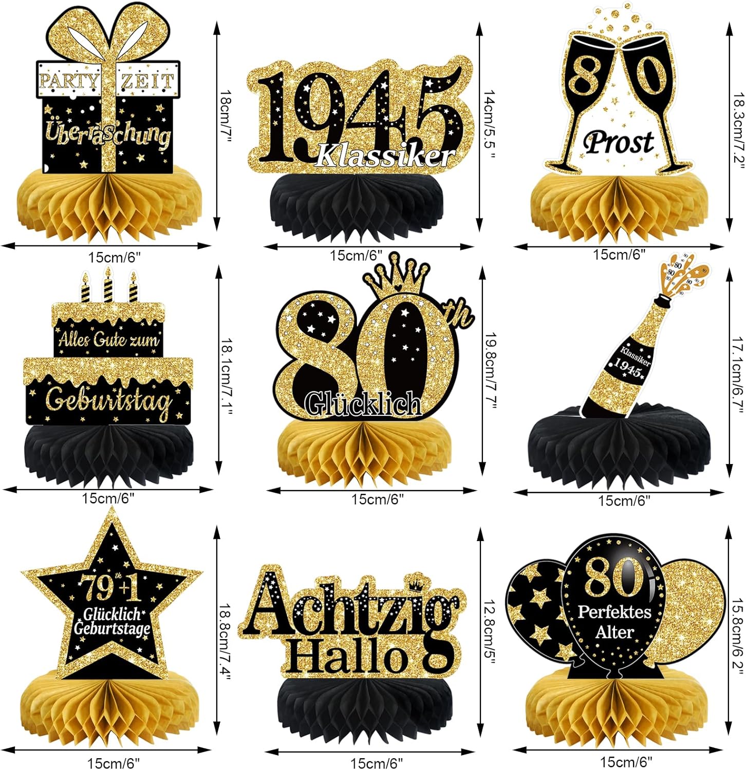 80° compleanno, da uomo, 9 pezzi, a nido d'ape, colore nero, dorato, centrotavola per compleanno, 80° compleanno, 80° compleanno, decorazione per donne e uomini, regali di compleanno (tedesco)