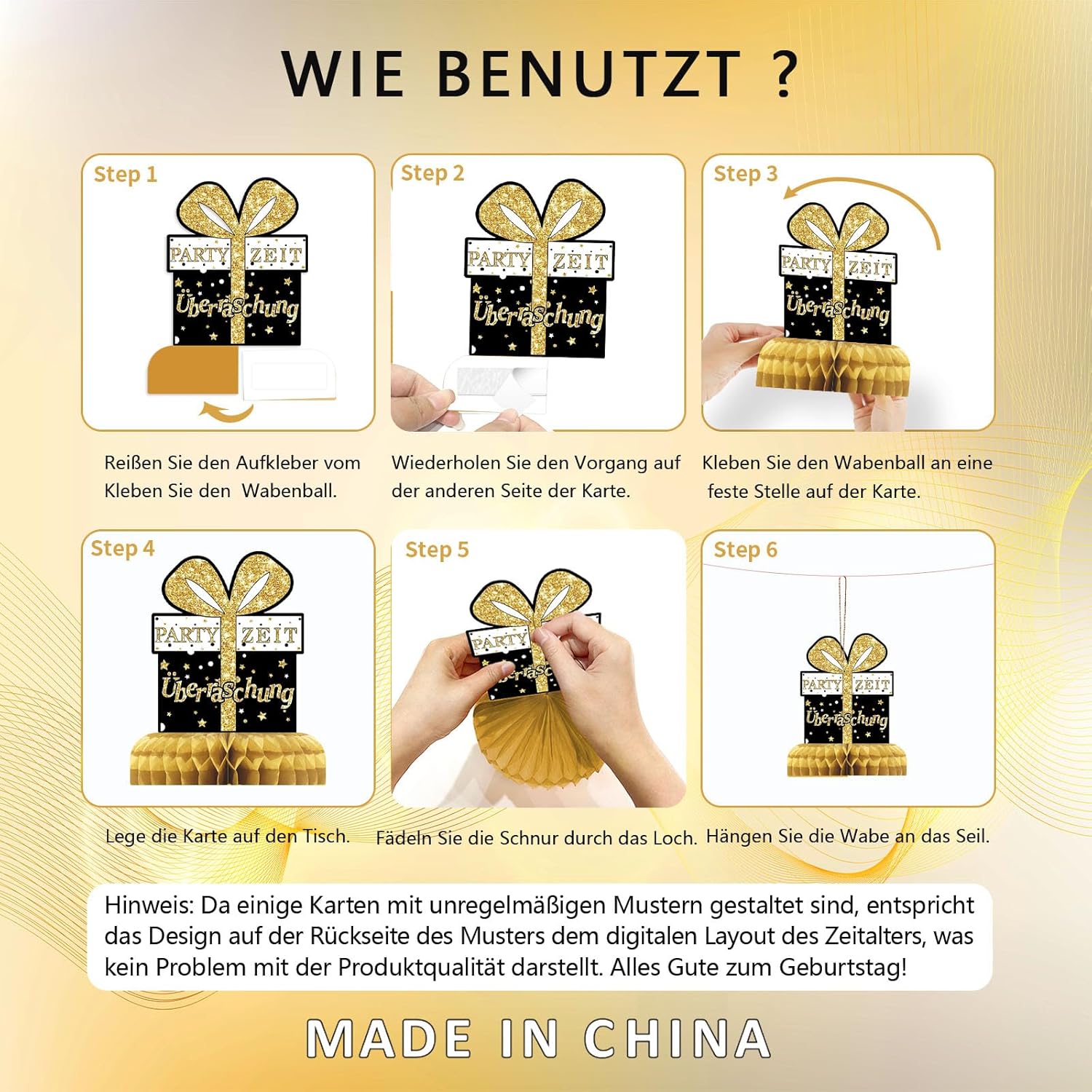 [Riceverai] - 9 decorazioni da tavolo a nido d'ape per donne e uomini (versione tedesca), contiene 9 lavagne di cartone con motivo e 9 baccelli di carta (4 neri e 5 dorati), nonché collari abbinati. Queste eleganti decorazioni da tavolo per l'80° compleanno sono sufficienti per decorare la tua festa a tema. [tema 80 anni] - Le decorazioni per il centrotavola per l'80° compleanno utilizzano una stampa fronte/retro e un design dorato nero retrò e la superficie è stampata con molti elementi correlati, come "sorpresa", "Saluto 80", "Buon compleanno", "Ciao ottanta" e altri testi, nonché palloncini, stelle e altri motivi. [Facile da montare] - Molto facile da assemblare. Fase 1: rimuovere l'adesivo della sfera a nido d'ape. Fase 2: fissare la sfera a nido d'ape in un punto fisso sulla scheda.Fase 3: ripetere sull'altro lato della scheda.Passaggio 4: infine posizionarlo sul tavolo.Passaggio 5: passare il filo attraverso il foro.Passo 6: appendere il nido d'ape alla corda. [Materiale di alta qualità] - Realizzato in cartone di alta qualità, stampa chiara, leggero e durevole, non sbiadisce facilmente. I corpi decorativi da tavolo per l'80° compleanno sono robusti, atossici e inodori, una buona scelta per i vostri 80 anni. Decorazioni di compleanno è. [Decorazioni di compleanno perfette] - Perfetto come 80° Decorazioni di compleanno per donne e uomini. Puoi posizionarle su un tavolo per la decorazione o appenderle con il cordoncino abbinato. È un'ottima scelta per la tua festa di compleanno. Crea un'atmosfera allegra e sorprendente per te.