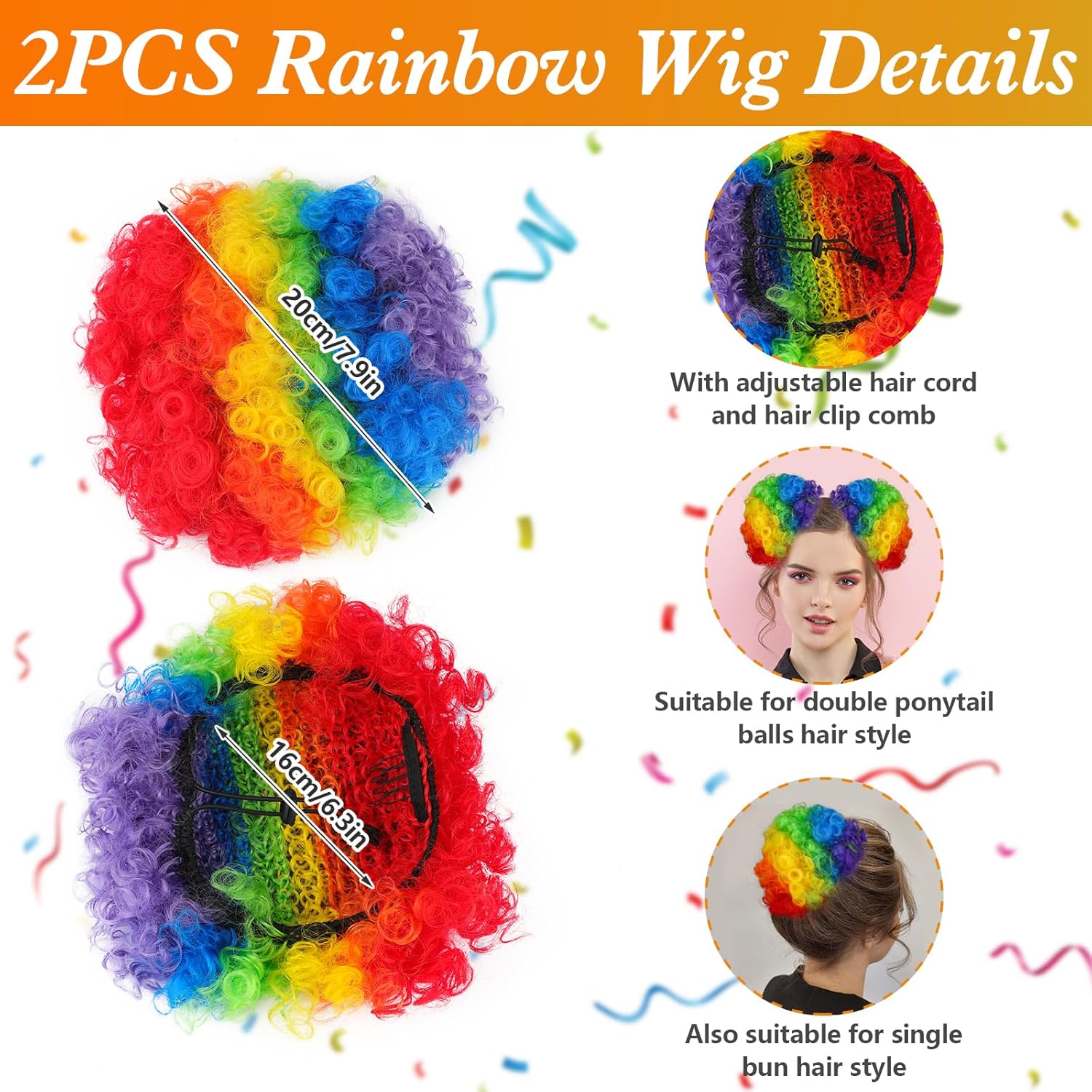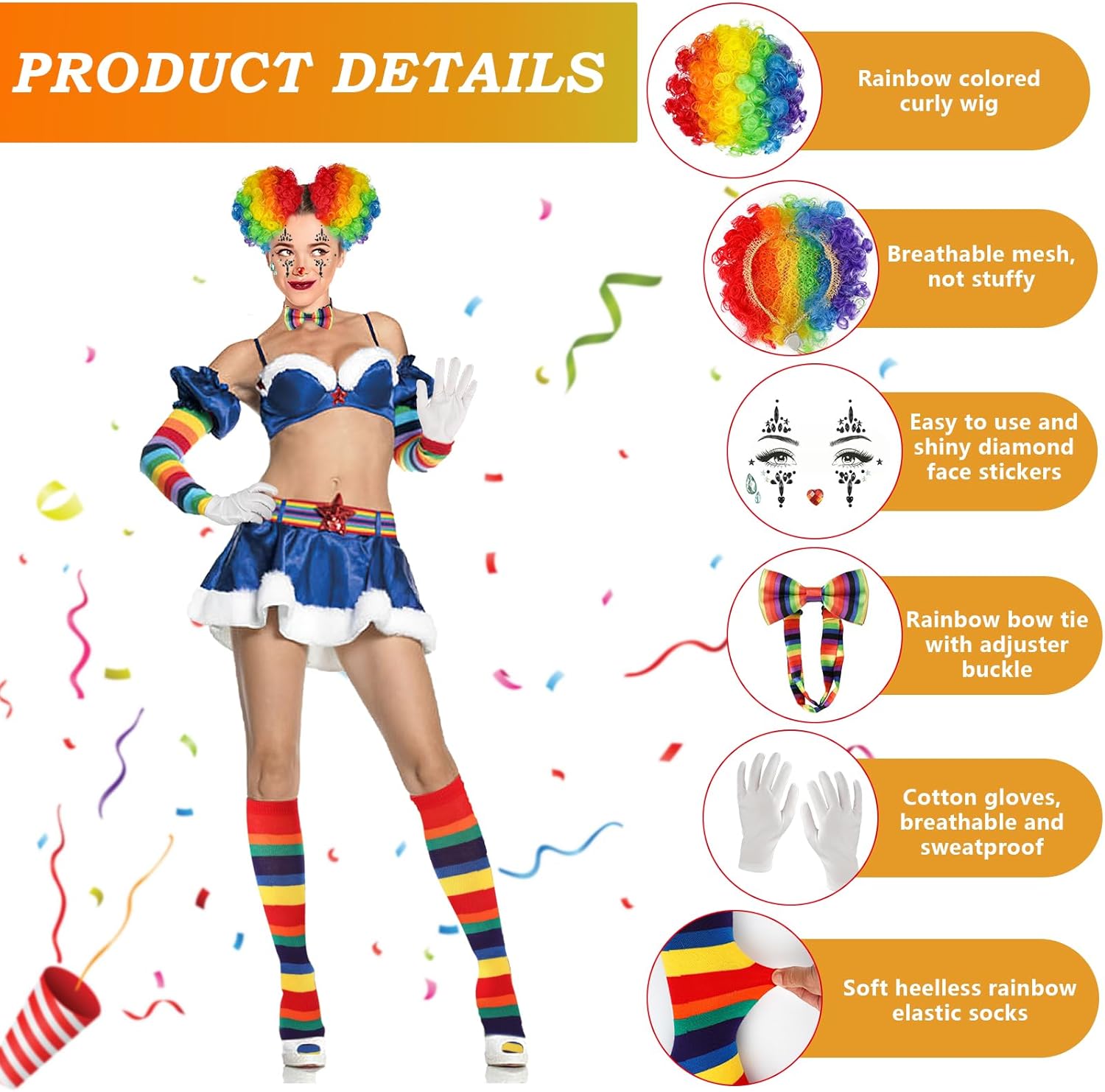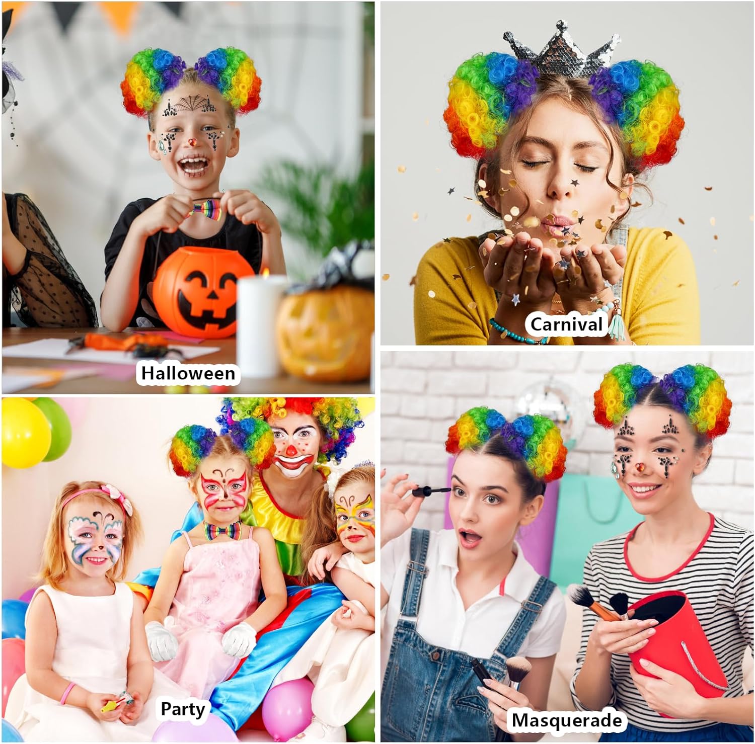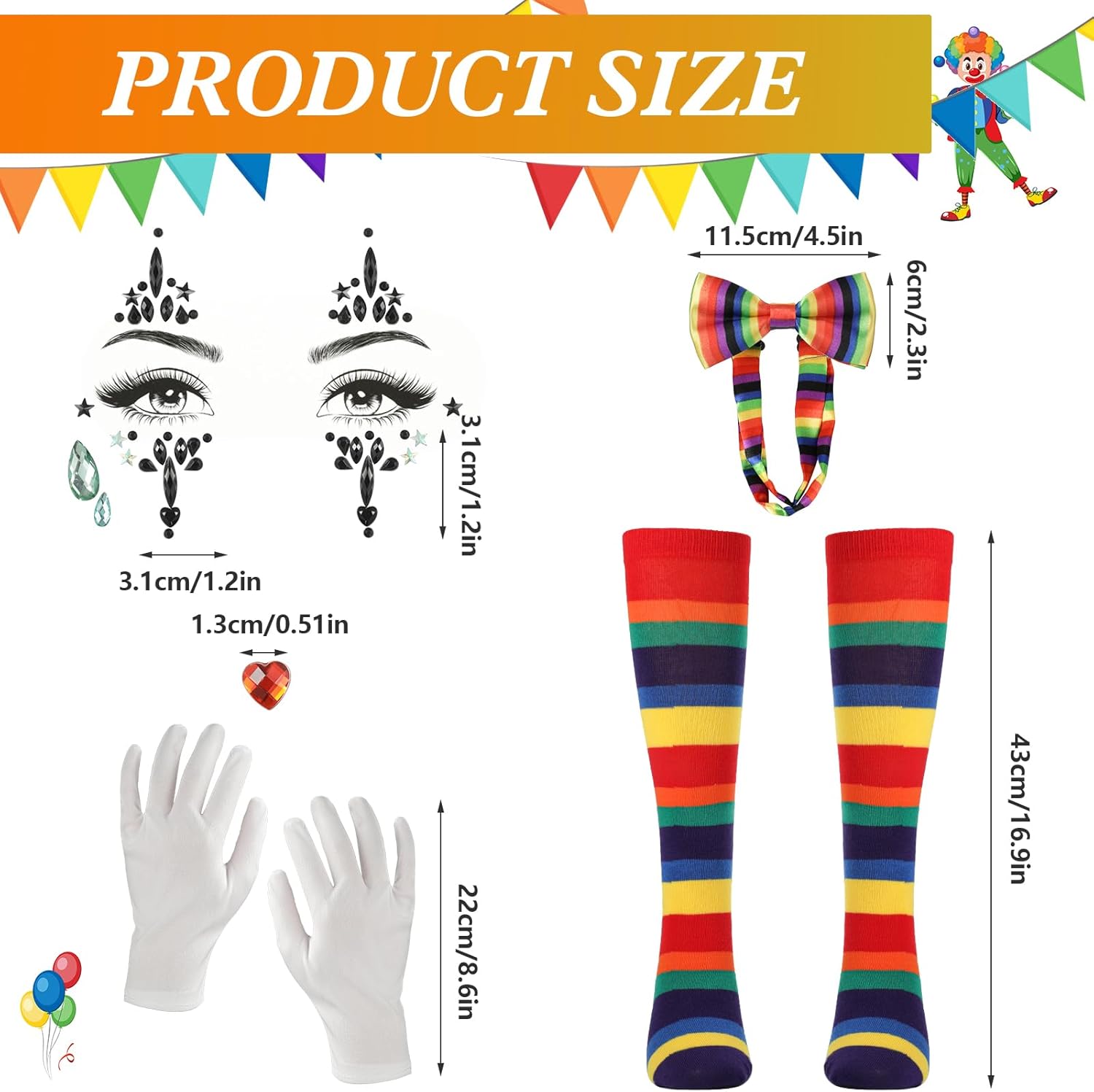 product arrived just as advertised loved the face gems they were super easy to apply got lots of compliments the clown hair buns have a built in clip and adjustable tie, was a bit fiddly but they stayed on all night
