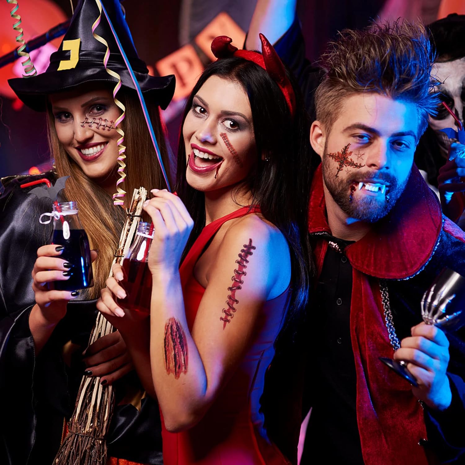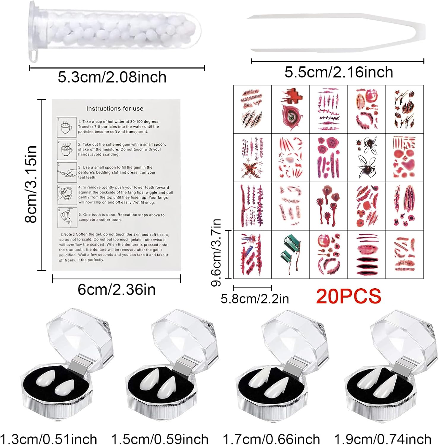 Set di denti da vampiro: questa morsa spaventosa è disponibile in 4 misure, 13 mm, 15 mm, 17 mm e 19 mm, 20 tatuaggi temporanei, 1 tubetto di gel dentale da 5 g, 1 manuale di istruzioni (lingua italiana non garantita), 1 pinzetta per soddisfare le diverse esigenze del cosplay. Alta qualità: questi denti succhiasangue per Halloween sono realizzati in resina di alta qualità, atossici, inodori, igienici, ecologici e realistici, possono essere utilizzati a lungo, sono rimovibili, comodi da indossare e non danneggiano la pelle della bocca. Aspetto realistico: gli adesivi spaventosi per tatuaggi di Halloween non possono essere lavati durante l'applicazione. Le false cicatrici di sangue durano bene per tutta la festa. Questi tatuaggi temporanei cicatrici e denti da vampiro sono un'ottima aggiunta al tuo abbigliamento da vampiro, rendono il tuo abbigliamento più realistico e creano un'atmosfera terrificante. Come usare i denti da vampiro: immergere le particelle di guttaperca in acqua calda di 80-100 gradi per sciogliere le perline bianche di colla, estrarre una quantità ragionevole e premere all'interno della protesi (le perle si raffreddano rapidamente, quindi devono essere maneggiate rapidamente). Ampia applicazione: i denti da vampiro di Halloween sono ideali per giochi di ruolo da vampiro, lupo mannaro, zombie e anche come accessori per costumi cosplay. Sono anche i migliori regali per gli amici per Halloween e Natale.