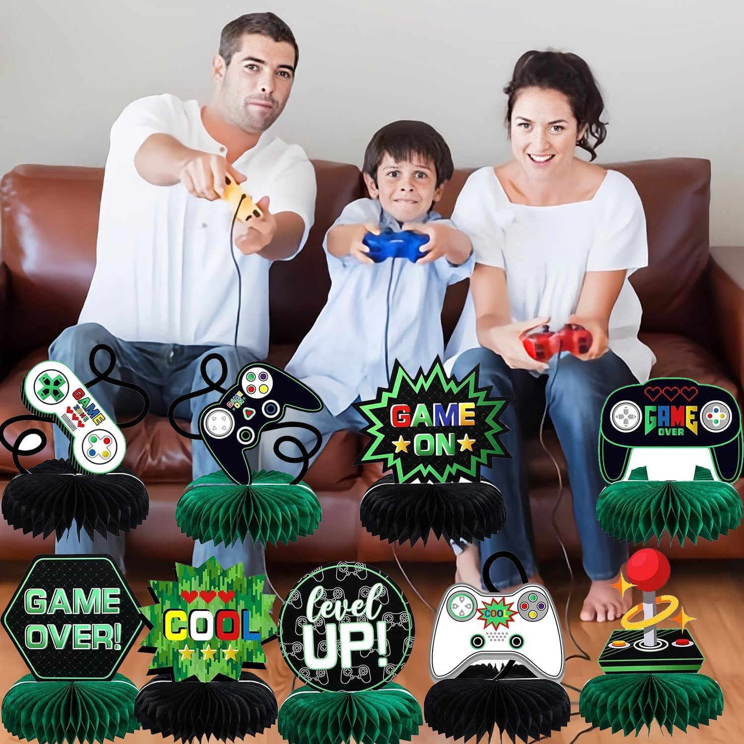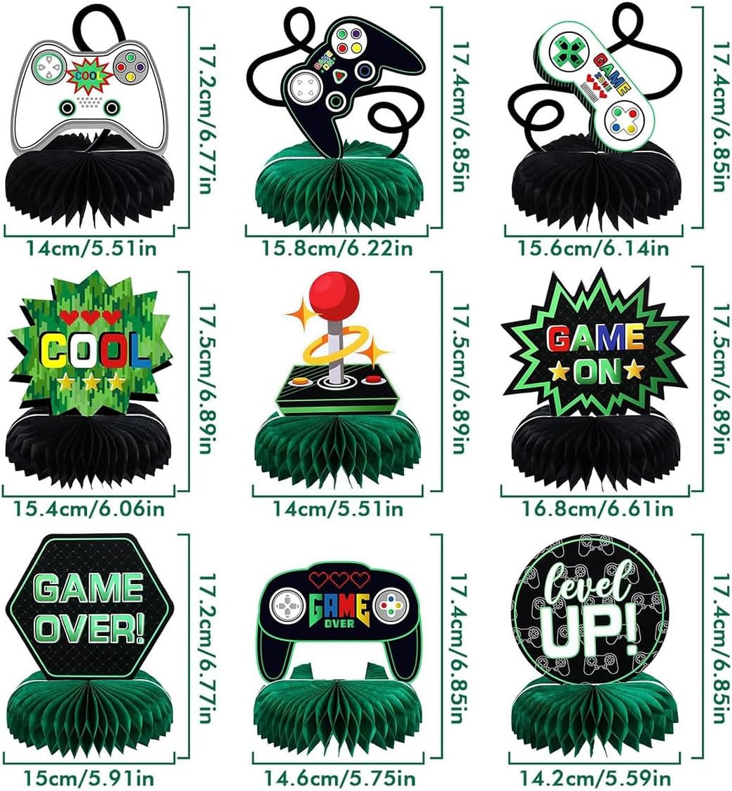 Materiale di alta qualità: le decorazioni a nido d'ape sono realizzate in carta, dopo il processo di stampa digitale, il colore del prodotto è di lunga durata e luminoso, sicuro, affidabile, forte e durevole, riutilizzabile. Design creativo: queste bomboniere sono piene di elementi per videogiochi, come le parole "Start the Game" e "Upgrade" e il motivo della maniglia. Facile installazione: centrotavola 3D a nido d'ape, basta tirare la carta mobile bianca sul cartone al centro e inserire una graffetta per creare una delicata e bella decorazione a nido d'ape. Ampiamente applicabile: adatto per feste di compleanno, feste in maschera, feste a tema videogiochi, eventi di gioco, riunioni di famiglia, feste in giardino all'aperto, giochi di ruolo e oggetti di scena per prestazioni scolastiche. Ampia quantità: riceverai un totale di 9 decorazioni per feste di gioco in diversi disegni; una varietà di quantità e stili, sufficienti per soddisfare le tue esigenze quotidiane e altre occasioni.