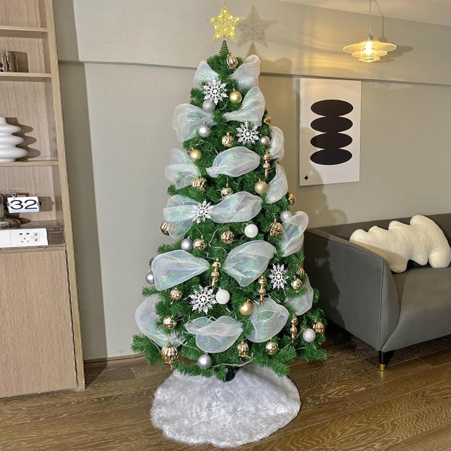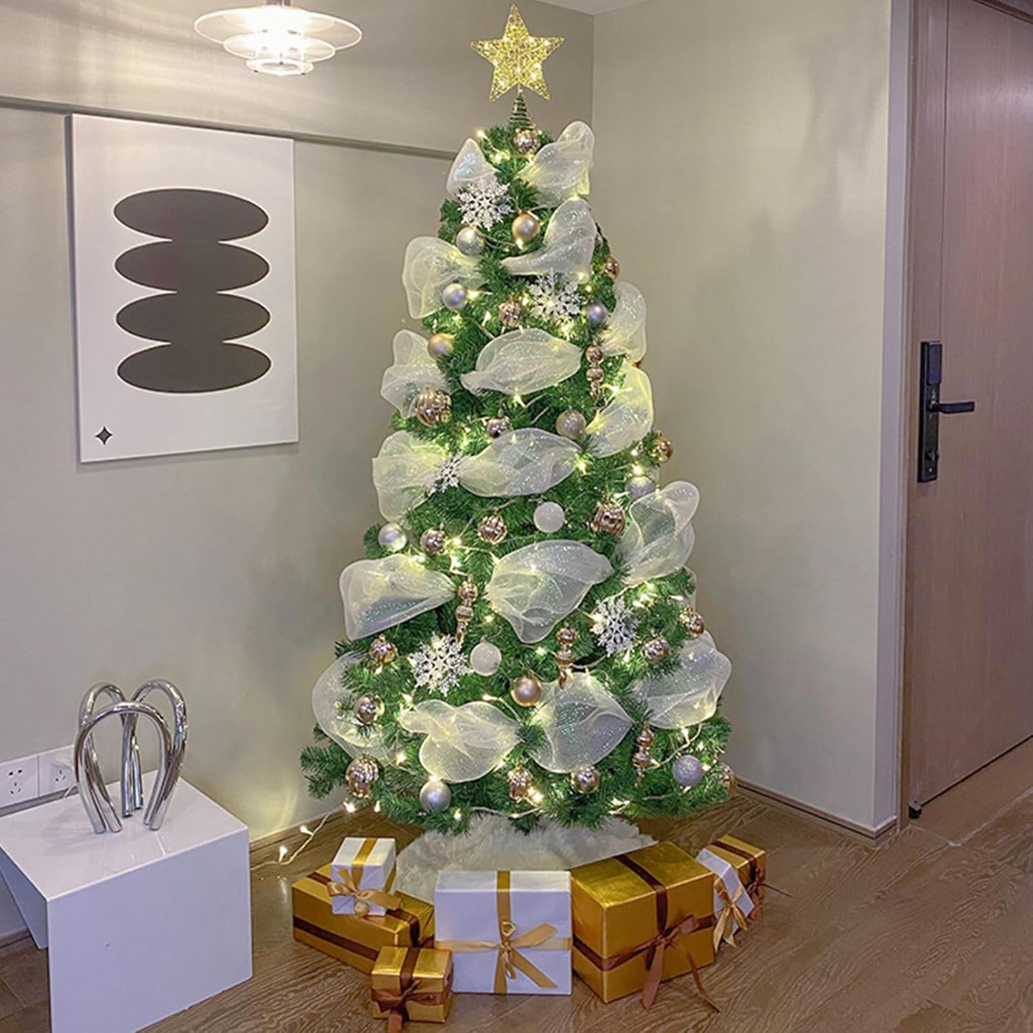 Occasioni adatte: questo nastro in rete di poliestere non è adatto solo per decorazioni natalizie e per la casa, ma anche per molte occasioni importanti, come matrimoni, cerimonie di laurea e così via, creando eleganza e per queste occasioni da usare o conservare: il rotolo di nastri glitterati è pieghevole e flessibile, e puoi usare le forbici per tagliarlo facilmente nella lunghezza o nella forma desiderata Ampie applicazioni: è possibile utilizzare il nastro decorativo in rete per decorare alberi di Natale, ghirlande o mazzi di fiori, per rendere più bello Riceverai 1 rotolo di nastro natalizio a rete larga, che può essere applicato per decorare il tuo albero di Natale o altri oggetti; il nastro largo in rete di Natale è abbondante per soddisfare le tue varie esigenze decorative Pratico questo nastro metallico in rete di poliestere è che può mantenere la lucentezza del nastro, non sbiadisce o si rompe facilmente, pratico e da usare, fornendo un uso a lungo termine