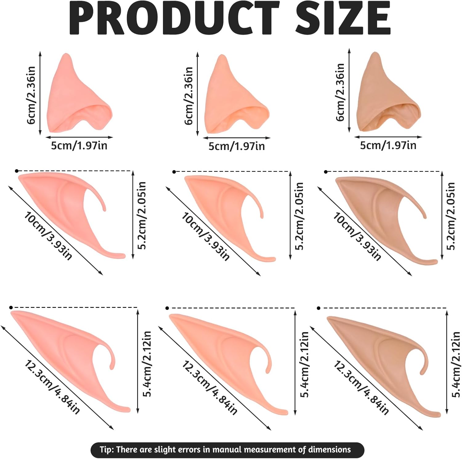 Tre colori e dimensioni a scelta: scegli tra chiaro (giallo chiaro), rosa (rosa scuro) e scuro (colore della pelle del caffè) e tre misure (6,5 cm x 5 cm, 10 cm x 5 cm, 12,5 cm x 5,5 cm), per trovare la vestibilità perfetta e il look desiderato con orecchie da elfo in lattice per bambini e adulti. Materiale in lattice di alta qualità: le orecchie da elfo sono realizzate in lattice flessibile, durevole e delicato sulla pelle, che si adatta comodamente e dura a lungo anche in caso di uso intensivo. Versatile: ideali per cosplay undici ears fate, Halloween, carnevale, feste di Natale, servizi fotografici o giochi di ruolo quotidiani: queste coppie di orecchie da fata sono l'accessorio perfetto per ogni occasione Facile da usare: le fate a undici adulti sono facili da posizionare e tenere saldamente all'orecchio. La colla per ciglia può essere utilizzata per una maggiore tenuta durante le attività faticose (venduta separatamente). Ampia gamma di utilizzi: il set contiene 9 cuffie per bambini (3 paia in ogni colore e dimensione), in modo da poter giocare diversi ruoli con amici e familiari o provare diversi look.