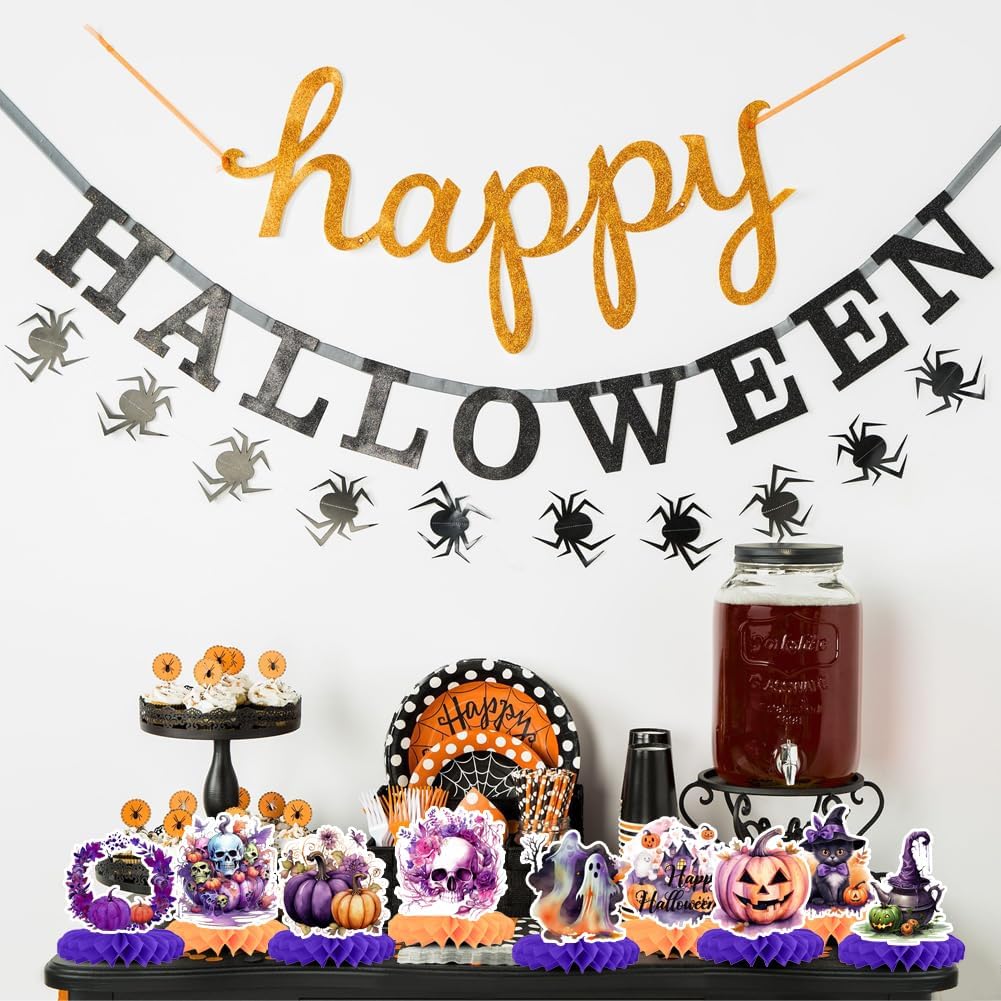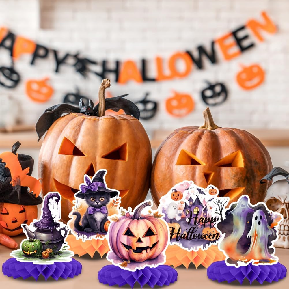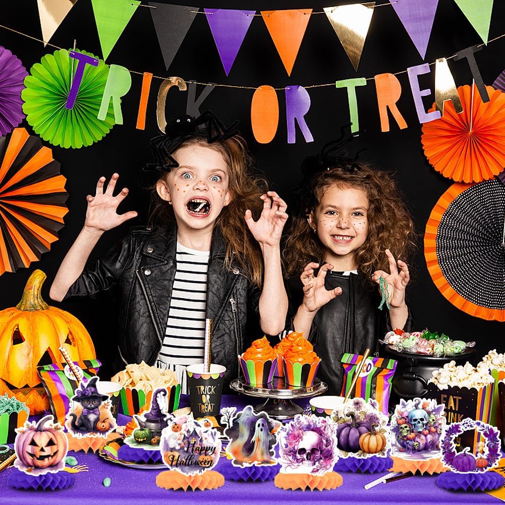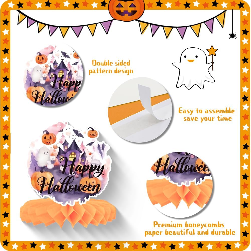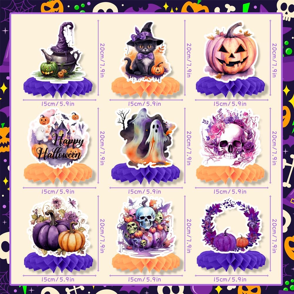 Set di centrotavola per Halloween - 9 decorazioni da tavola per feste di Halloween, quantità sufficiente per aggiungere ciondoli a tutte le feste di Halloween a tema e attirare l'attenzione degli ospiti Pieni di atmosfera di Halloween: questi centrotavola per Halloween sono progettati con molti elementi orribili, come gatto nero, castello viola, teschio, zucca malvagia, fantasma e così via, adottano viola e arancione come colori principali per renderli più eccitati Facile da montare: le decorazioni da tavola di Halloween sono facilmente finite, basta strappare l'adesivo del nido d'ape, attaccare sull'area fissa della carta, quindi aprire la palla a nido d'ape, ripetere l'operazione sull'altro lato della carta Materiale di qualità: gli ornamenti da tavolo a zucca sono realizzati in cartoncino spesso e robusto, su entrambi i lati con stampe trasparenti, possono essere piegati e aperti facilmente, comodi da usare Ampie applicazioni: la decorazione per feste di Halloween può essere applicata per casa, aula, hotel, bar, casa infestata, negozio, tavolo da pranzo, tavolo da dessert e ovunque tu voglia