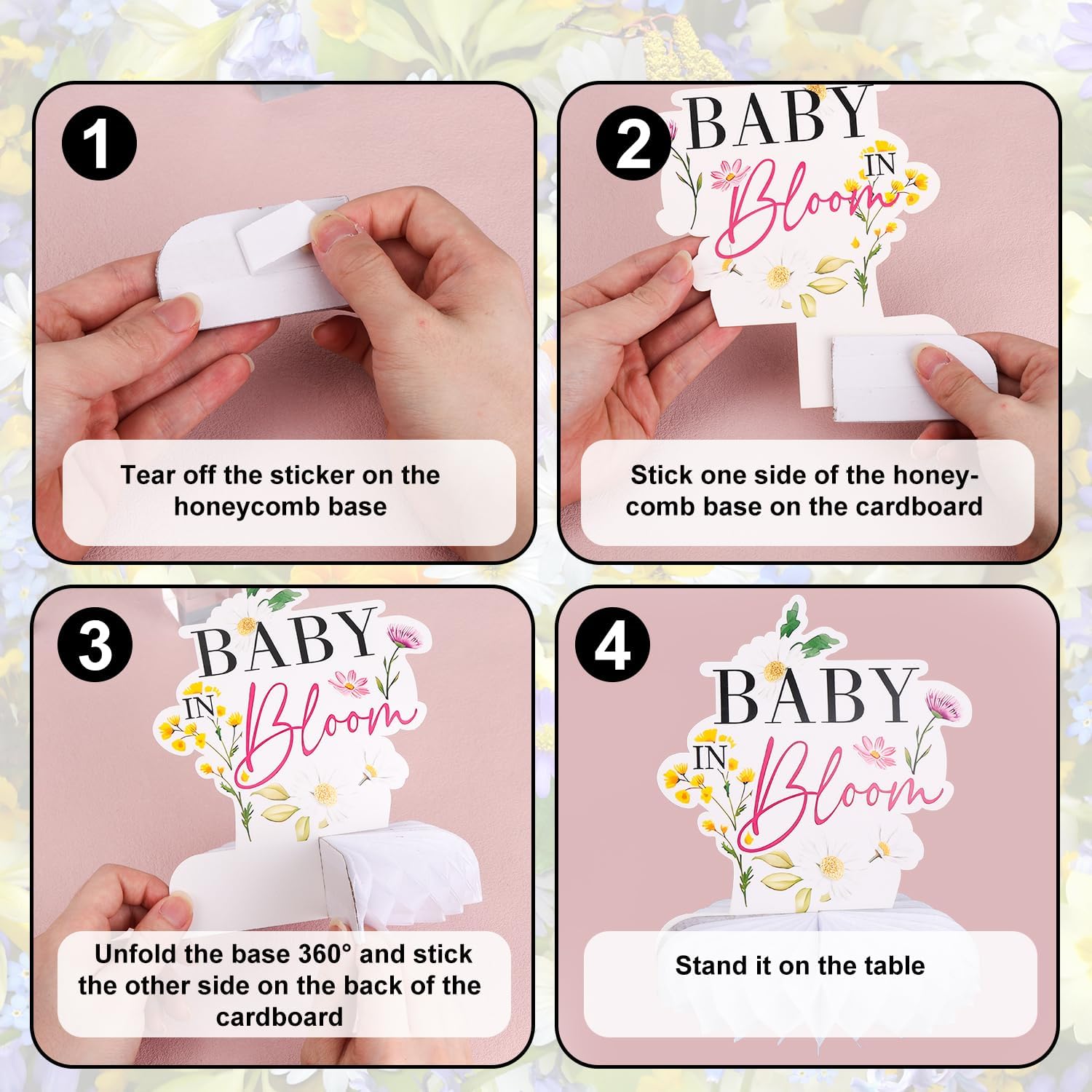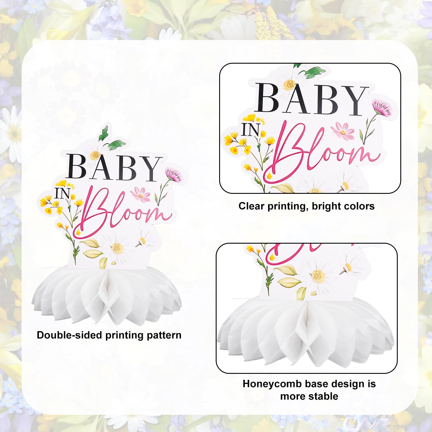 Contenuto del prodotto: riceverai 9 centrotavola a nido d'ape, tra cui 9 basi a nido d'ape.Per dimensioni specifiche, fare riferimento alle immagini del prodotto. Materiale di qualità: questo centrotavola di fiori selvatici è realizzato in cartone spesso, che non è facile da deformarsi.È anche stampato a doppia faccia con colori ricchi e non si sbiadirà dopo essere stato posizionato a lungo. Design speciale: questa decorazione per baby shower è stampata con motivi floreali su entrambi i lati, con un effetto gradiente colorato;Il fondo adotta un design tridimensionale a nido d'ape per migliorare la stabilità dell'ornamento, in modo che possa resistere saldamente sul tavolo e creare facilmente una decorazione per feste. Facile da usare: non sono necessari strumenti, è possibile posizionare il centrotavola di fiori direttamente dopo aver disimballato il pacchetto.Alcuni componenti richiedono semplicemente spiegare la struttura a nido d'ape e possono essere conservati e riutilizzati dopo la decorazione. Ampia applicazione: questo topper da tavolo floreale può essere usato come decorazione da tavolo a tema di benvenuto per bambini, composizione per atmosfera per feste di compleanno, decorazione di proposito fotografico;Può anche essere usato come abbellimento del desktop per la casa ed è adatto a una varietà di scene di stile.