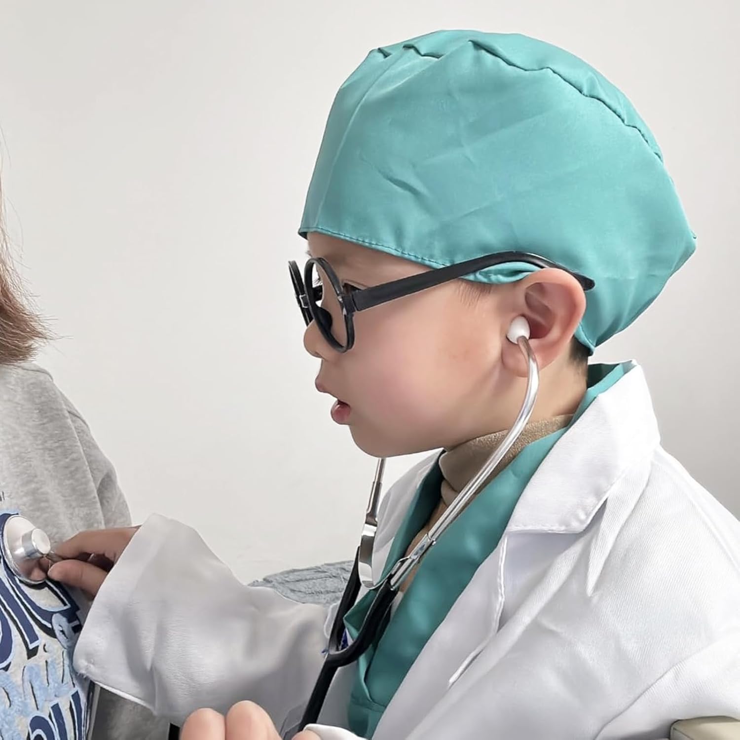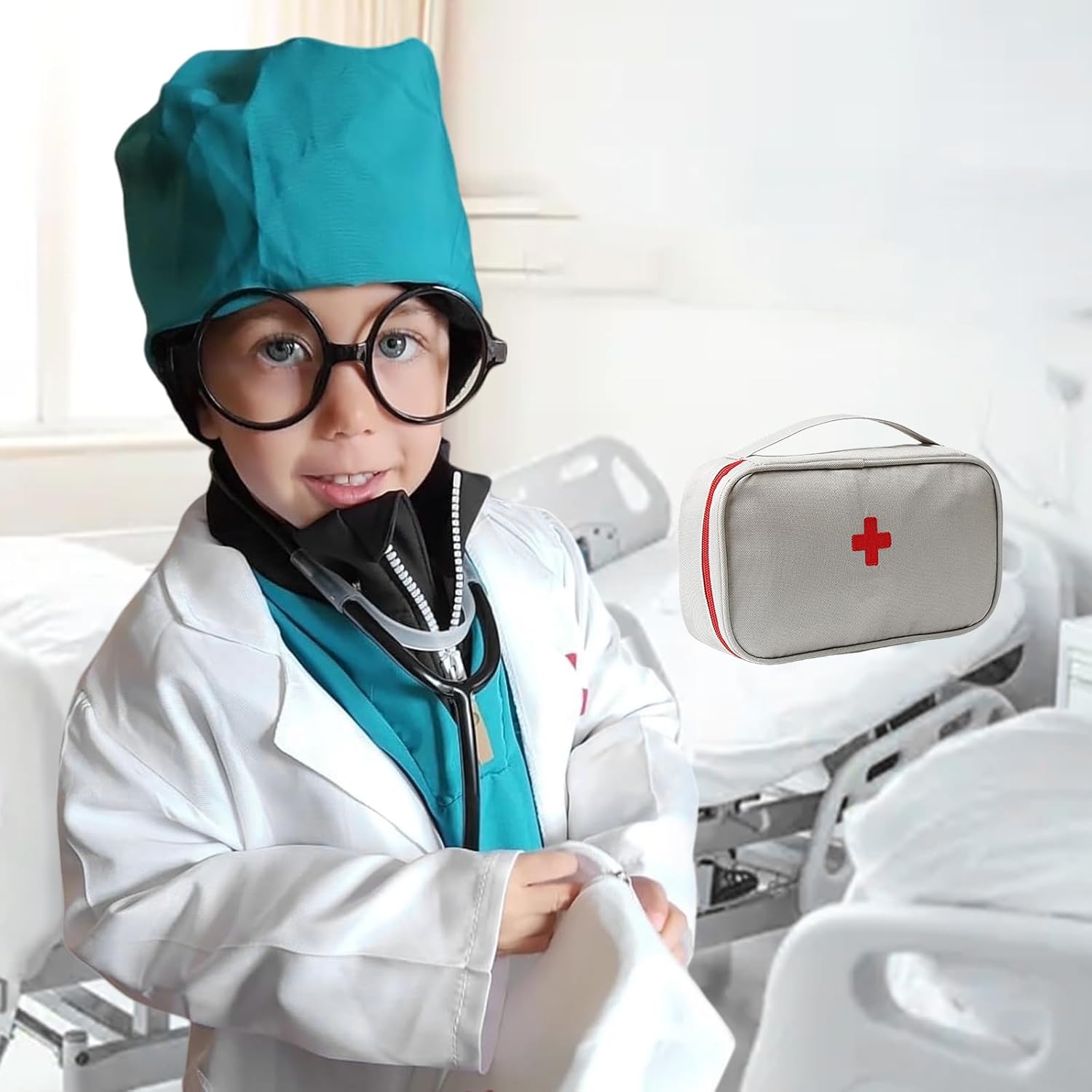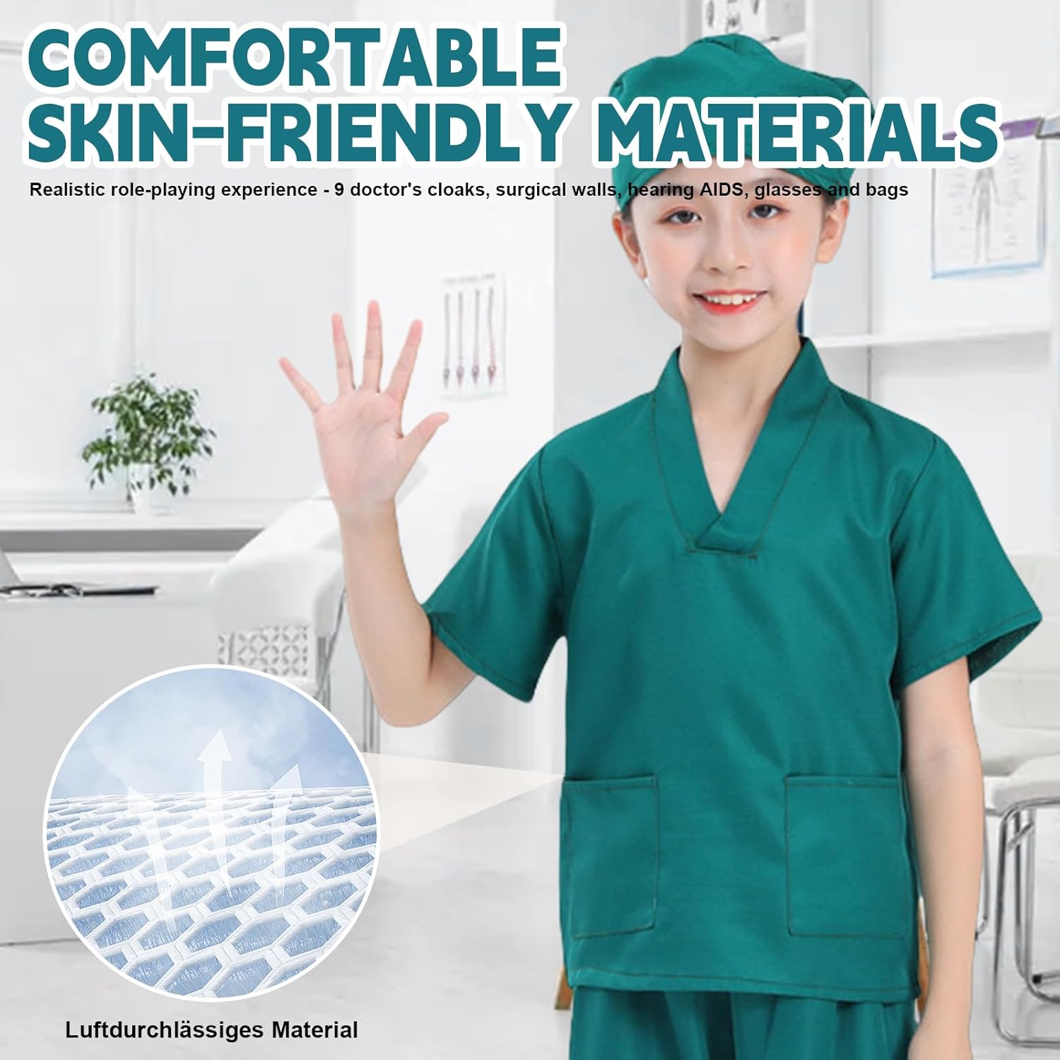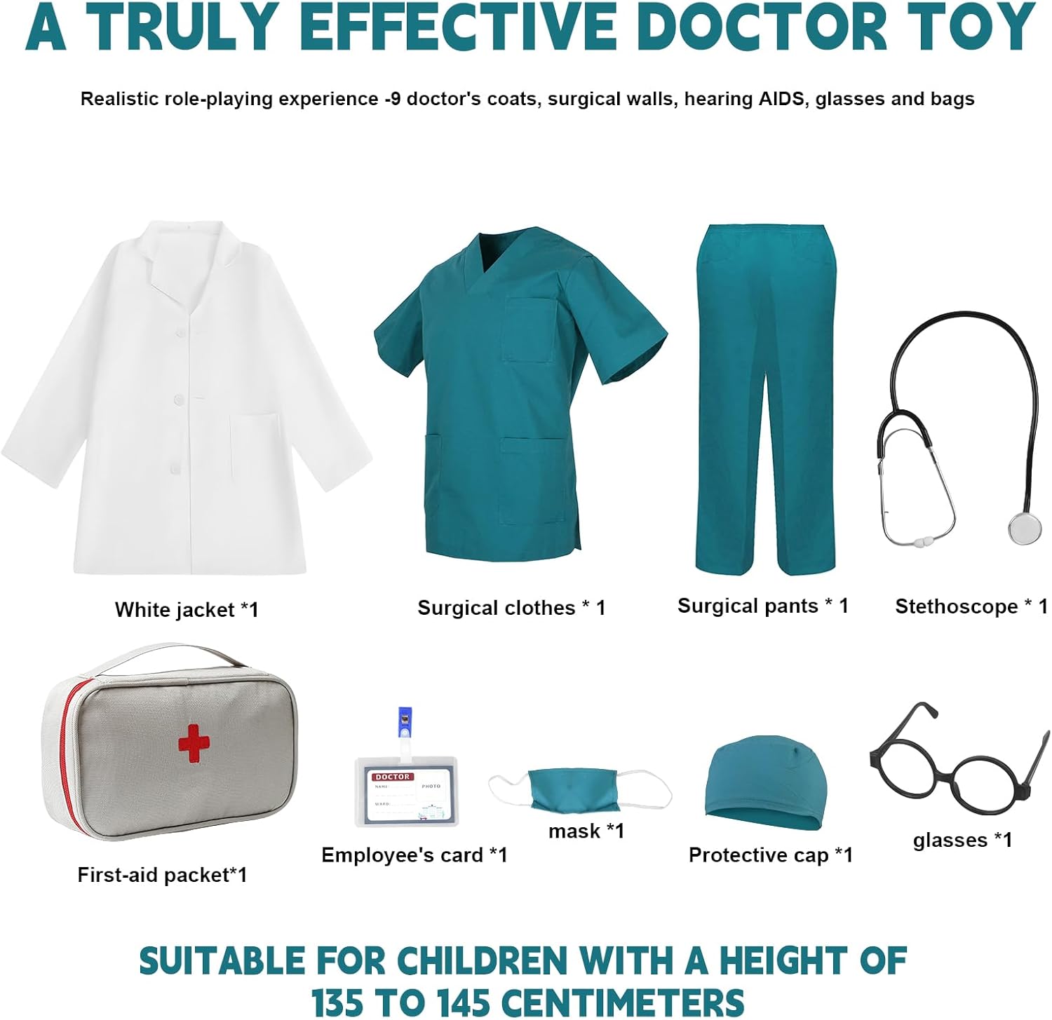 Set medico completo: il costume da medico di alta qualità per bambini contiene tutti gli accessori per giochi di ruolo realistici. Il camice medico per bambini è realizzato in poliestere traspirante con stampe tascabili dettagliate, mentre il costume per bambini convince grazie agli accessori medici. Materiali di alta qualità: il camice medico bianco per bambini è realizzato in materiale resistente e delicato sulla pelle. La fascia elastica in vita garantisce un comfort perfetto. Tutte le parti del camice medico per bambini sono resistenti allo scolorimento e lavabili, ideali per un divertimento duraturo. Dettagli realistici: questo costume da medico per bambini convince con accessori autentici come stetoscopio, targhetta per il nome e maschera chirurgica. Il costume da medico per bambini favorisce l'immaginazione e rende ogni piccolo dottore orgoglioso del suo abbigliamento realistico. Stimola la fantasia: il camice medico per bambini stimola la creatività e migliora le abilità sociali. Perfetto per giochi di ruolo, che forniscono ai bambini conoscenze mediche di base e rafforzano la loro autostima. Versatile: perfetto per i bambini per visitare il giorno della carriera, carnevale, giorno di scuola, feste in costume o ospedale, ecc. È anche una grande esperienza lavorativa per i bambini. . Il costume da medico per bambini è il regalo perfetto per aspiranti medici ed entusiasma sia i ragazzi che le ragazze.
