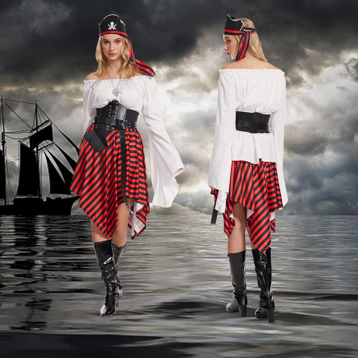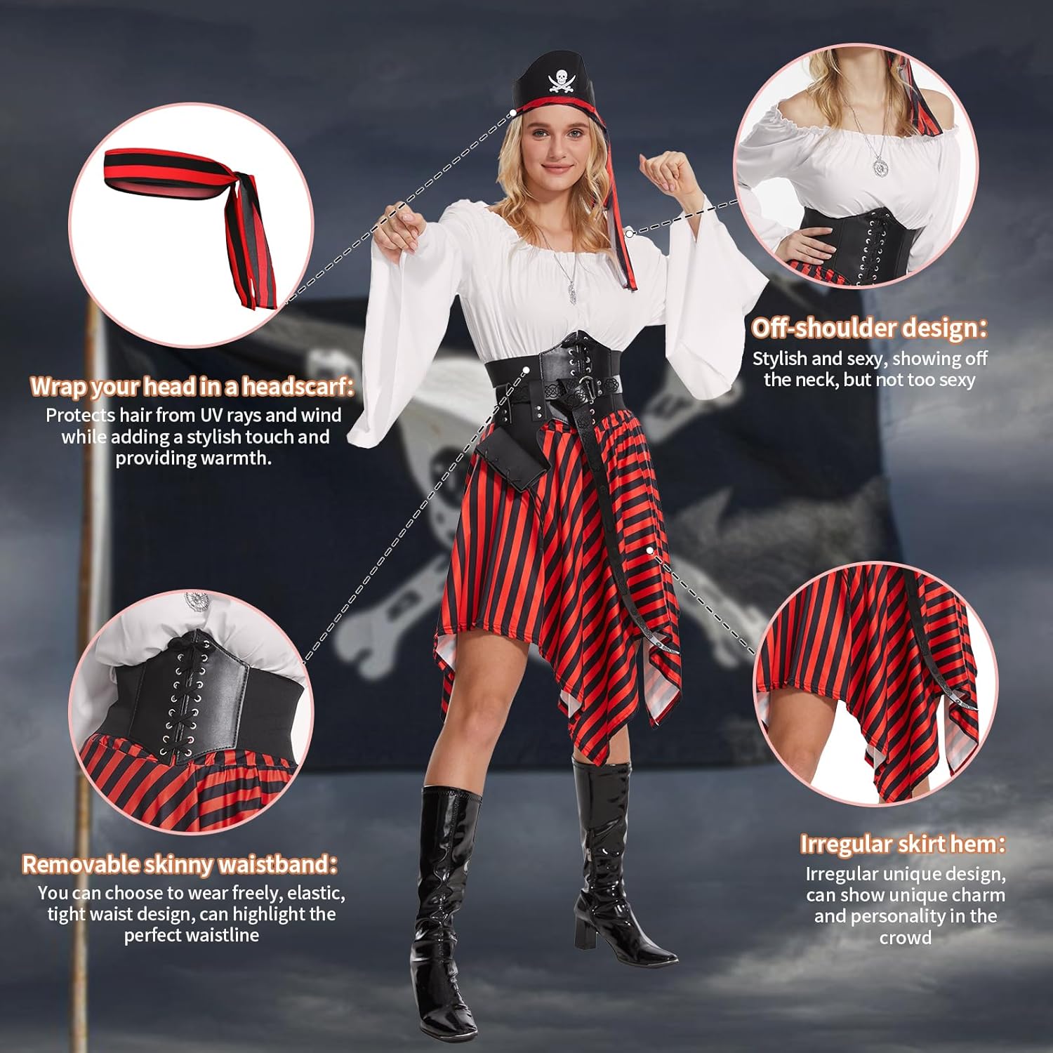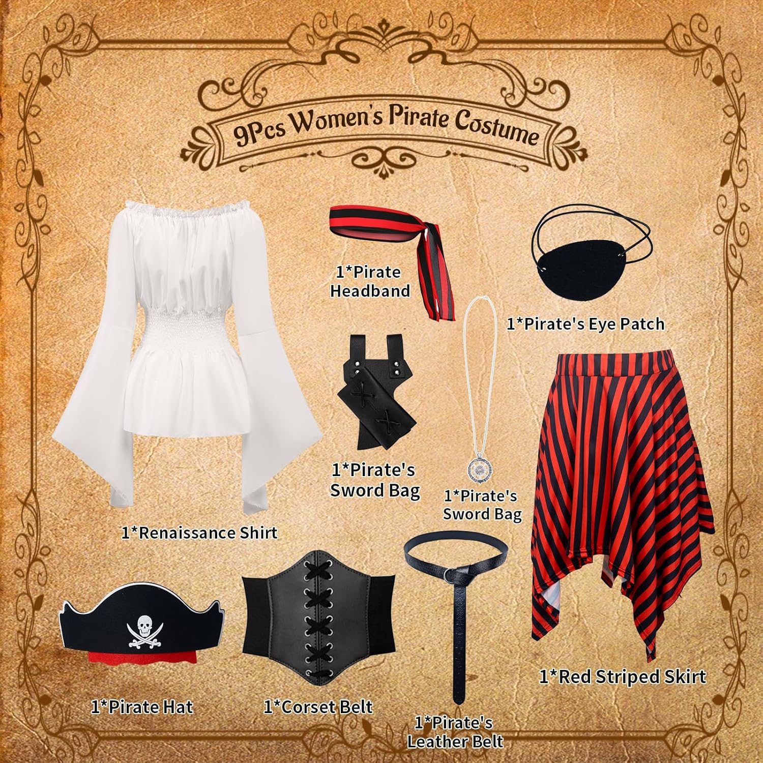 Descrizione prodotto Il pacchetto include: 1 x top rinascimentale, 1 x cintura corsetto, 1 x gonna pirata a righe rosse e nere, 1 x foulard a righe, 1 x benda per gli occhi da pirata, 1 x fondina per spada in pelle, 1 x bussola e 1 x cintura lunga in pelle per le tue esigenze di festa o cosplay. Avviso di sicurezza NO