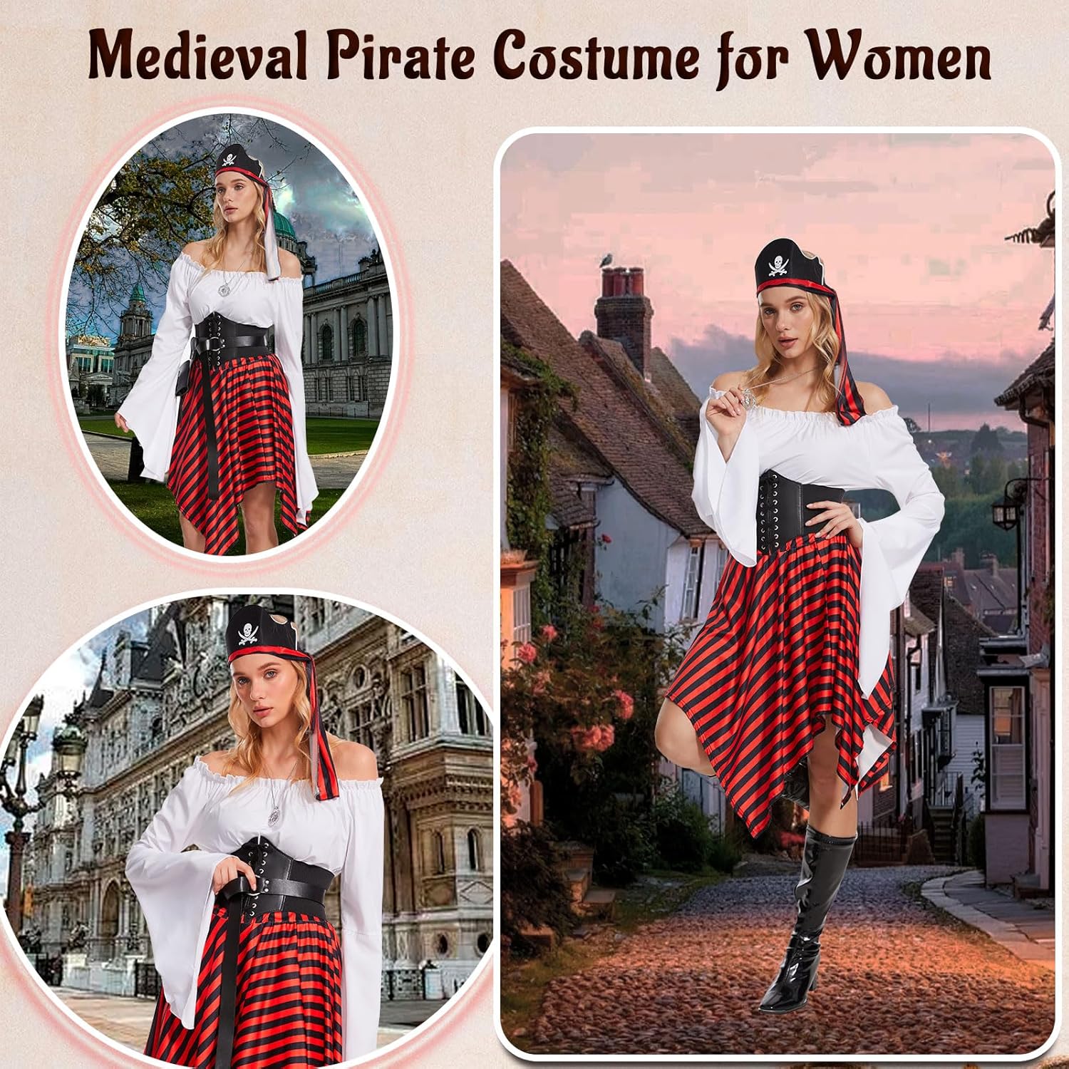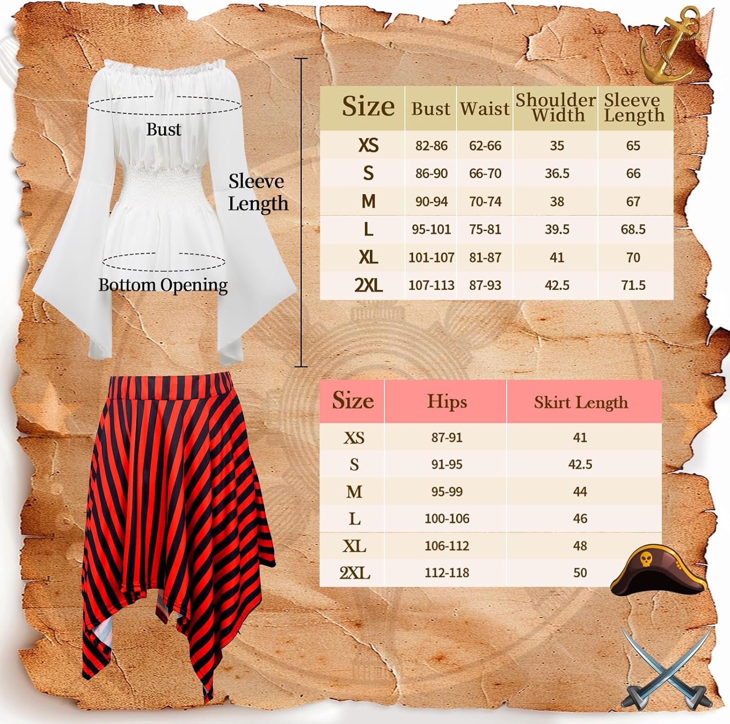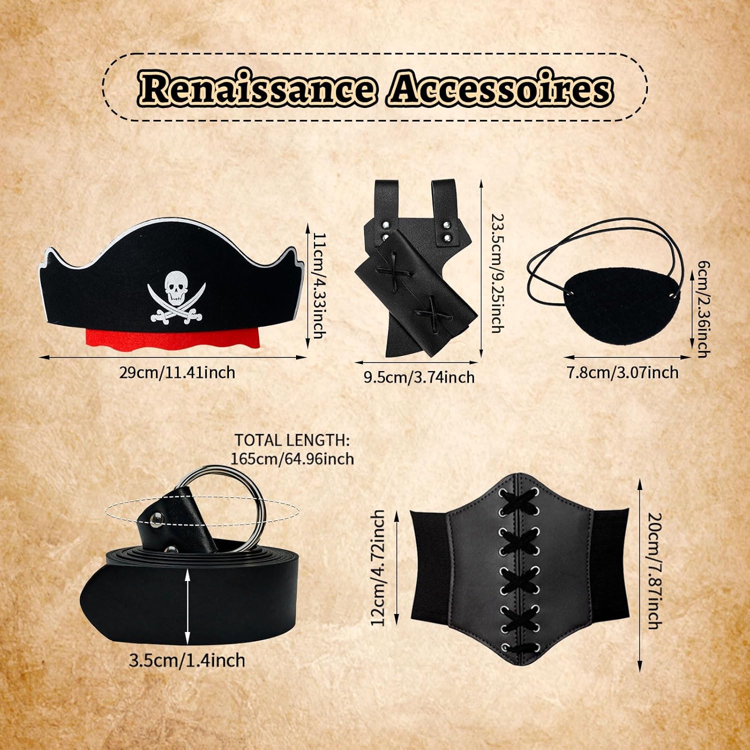 Descrizione prodotto Il pacchetto include: 1 x top rinascimentale, 1 x cintura corsetto, 1 x gonna pirata a righe rosse e nere, 1 x foulard a righe, 1 x benda per gli occhi da pirata, 1 x fondina per spada in pelle, 1 x bussola e 1 x cintura lunga in pelle per le tue esigenze di festa o cosplay. Avviso di sicurezza NO