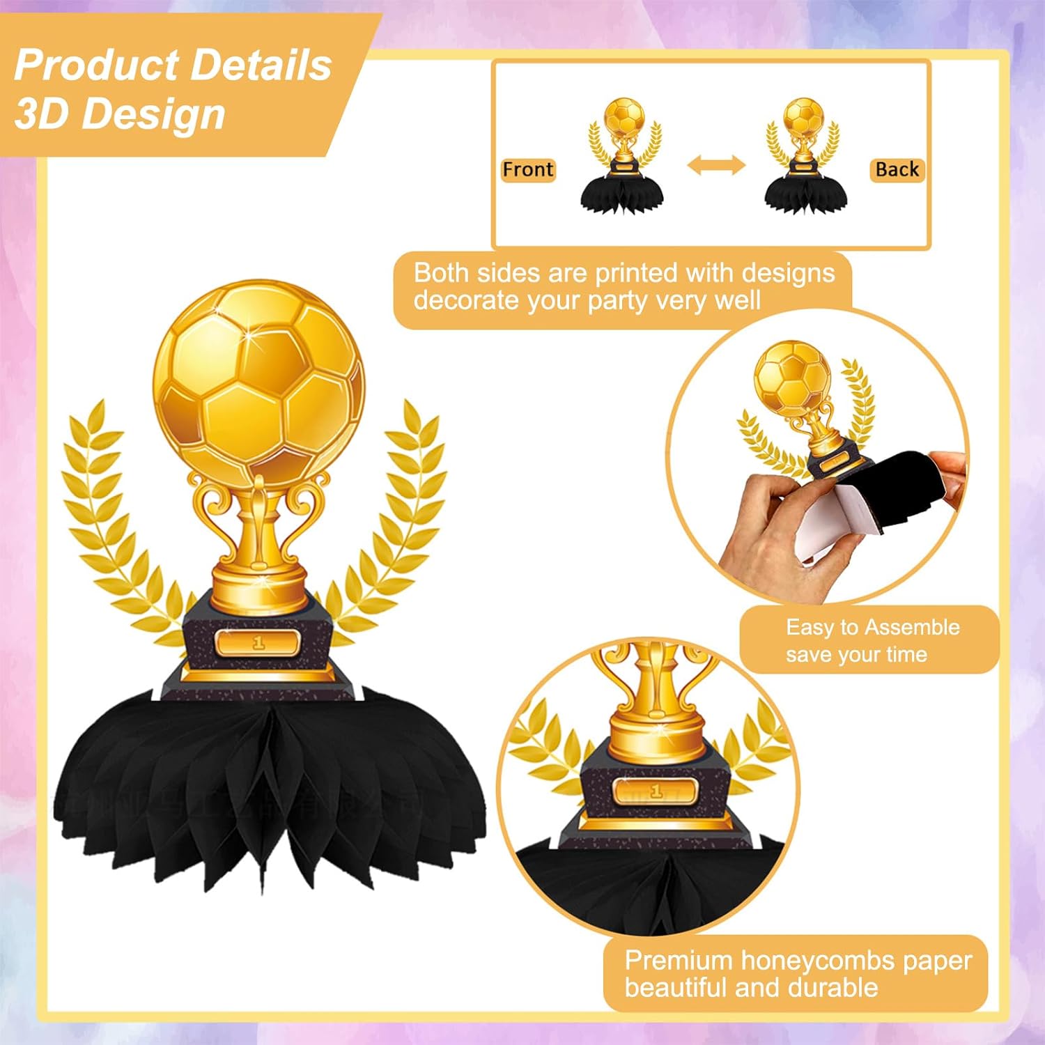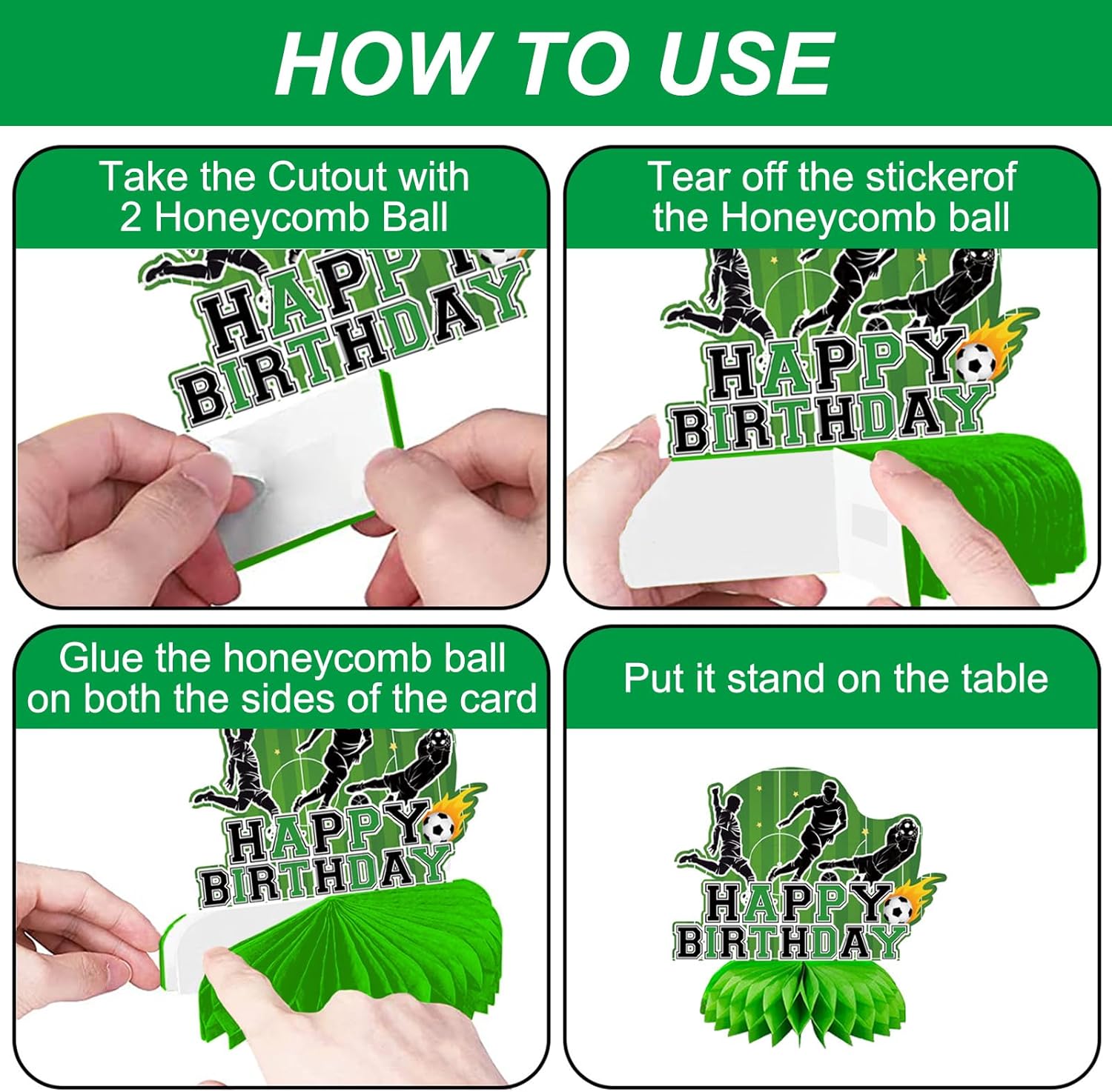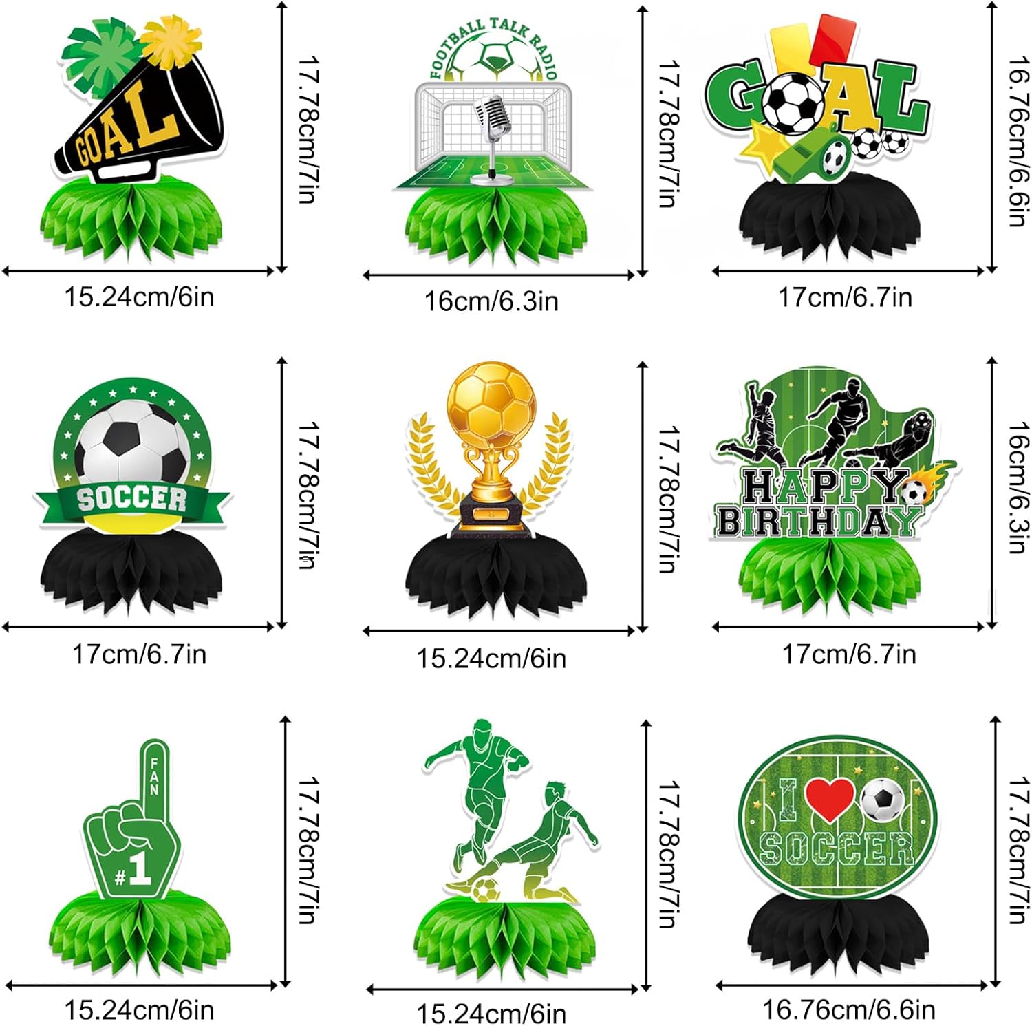 Il set include: Riceverai 9 centrotavola a forma di pallone da calcio, sufficienti per decorare più tavoli o distribuiti in tutto il locale per un aspetto coeso. Materiali: Realizzati in carta resistente, questi centrotavola sono leggeri ma robusti, il che garantisce che rimangano intatti per tutta la durata dell'evento. I centrotavola a nido d'ape a forma di pallone da calcio di alta qualità offrono resistenza e aggiungono un tocco dinamico all'arredamento della tua festa. Design 3D: La costruzione 3D aggiunge profondità e interesse visivo ai tuoi tavoli, creando un'atmosfera festosa per gli ospiti. Che tu stia organizzando una festa per ragazzi o per tifosi di calcio, queste decorazioni con temi di calcio e calcio offrono il modo perfetto per infondere un'atmosfera emozionante al tuo evento. Decorazioni a nido d'ape a forma di pallone da calcio: Ogni centrotavola è realizzato a forma di pallone da calcio utilizzando carta a nido d'ape per un aspetto realistico e strutturato. Basta aprire ogni pezzo e fissare la base per creare il centrotavola. Decorazioni da tavolo versatili: La natura versatile del set gli consente di fungere da centrotavola accattivante per qualsiasi tavolo, aggiungendo un tocco dinamico e fungendo da elemento di attrazione in tutte le tue feste a tema calcio.