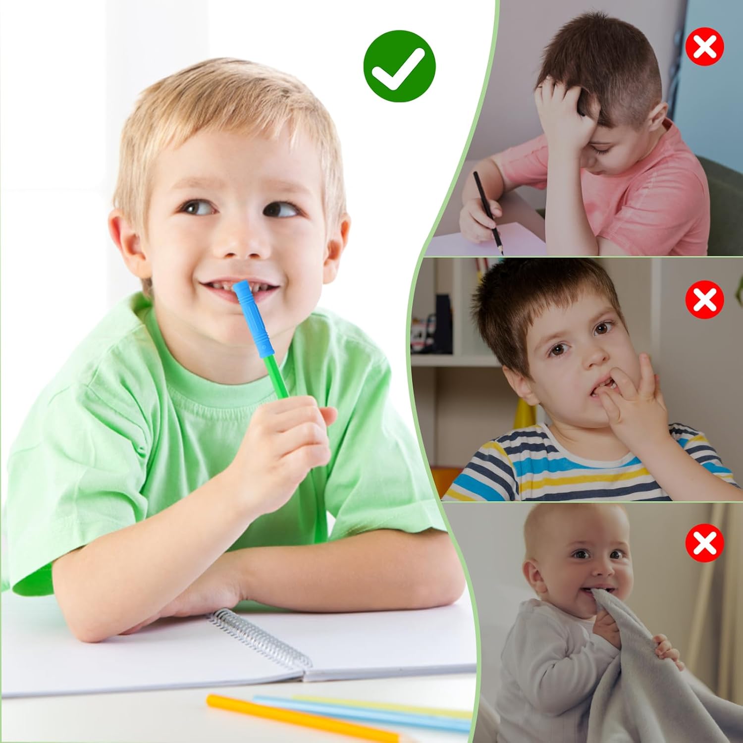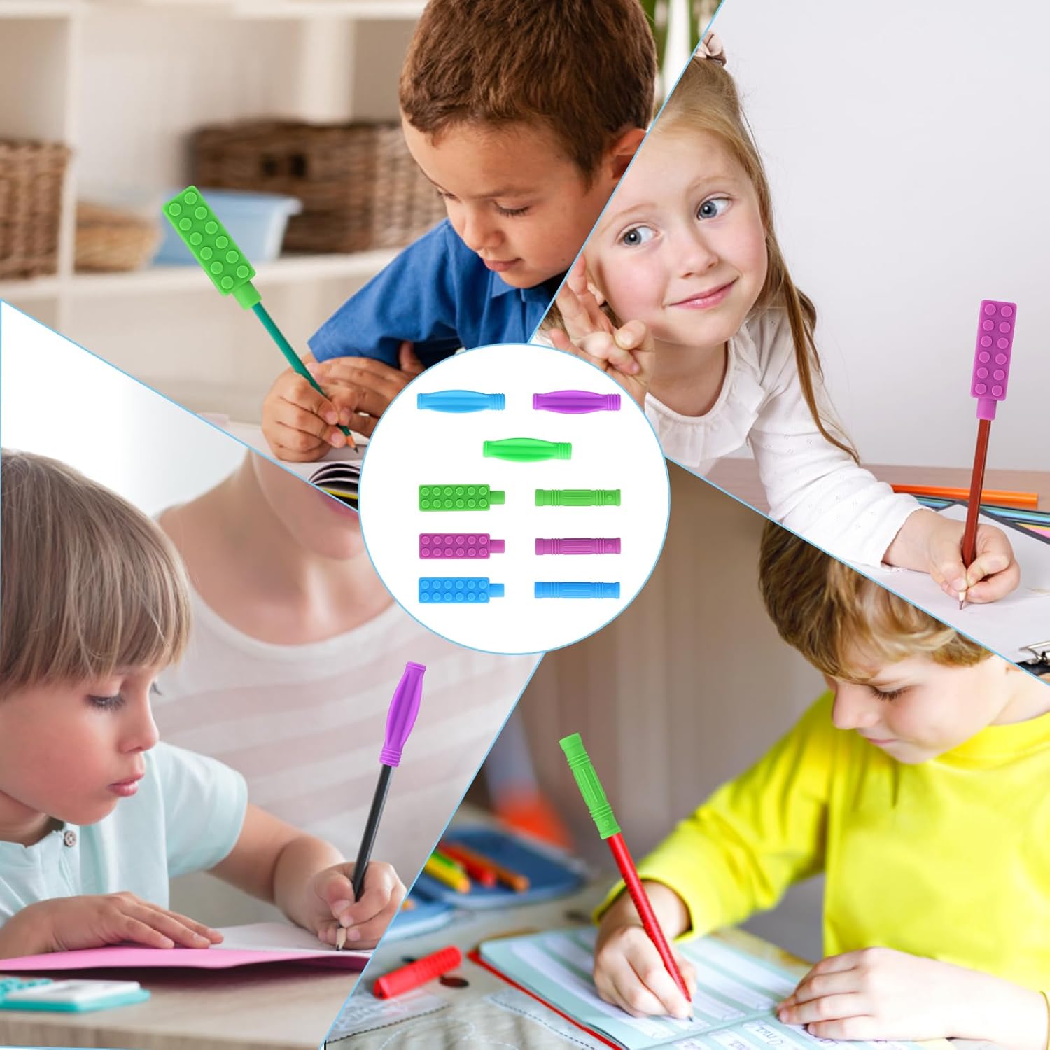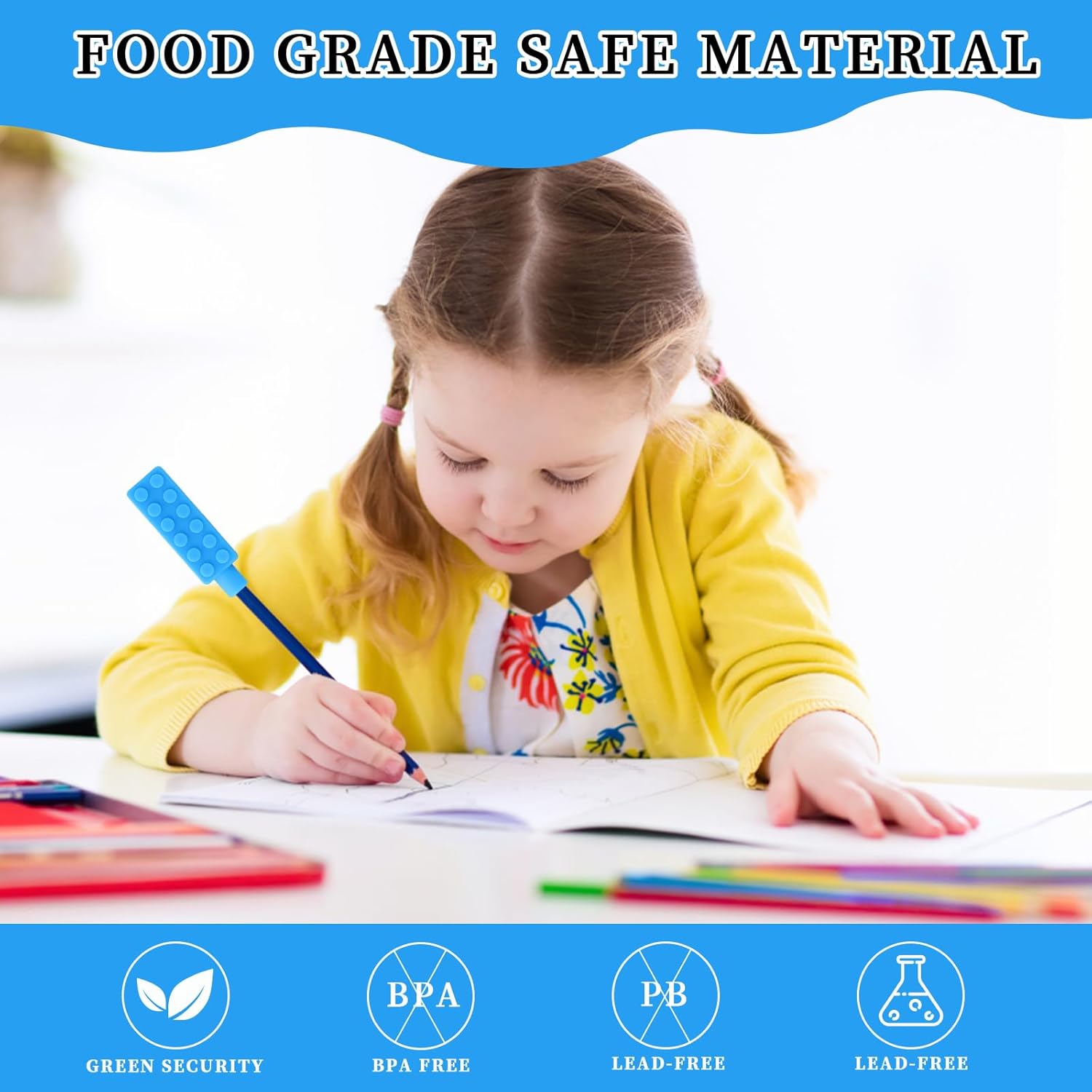 Soddisfazione sensoriale ispirata: sono forniti con 9 topper per matite masticabili, ognuno con 3 forme distinte e una serie di colori accattivanti: Blu+Viola+Verde/Rosso+Blu+Verde. Misurando circa 6,5 cm x 1 cm, 6,5 cm x 1,2 cm, 6,5 cm x 1,3 cm o 6,5 cm x 2,3 cm, queste meraviglie ergonomiche offrono una presa comoda e aderente, progettata per la massima soddisfazione dell'utente. Materiale di alta qualità: i nostri topper per matite masticabili sono realizzati in silicone alimentare e sicuri da masticare. Ideali per i più piccoli che non riescono a resistere a mordicchiare tutto ciò che hanno a portata di mano, soddisfano le esigenze uniche dei bambini con autismo e non solo. Illumina l'apprendimento con un colorato sollievo dall'ansia: trasforma la scrittura e il disegno in un'esperienza ipnotizzante con questi giocattoli sensoriali da masticare dai colori vivaci. Accattivanti e giocosi, affascinano i bambini di tutte le età, in particolare quelli che hanno difficoltà a stare fermi o a concentrarsi durante lunghe sessioni di studio o lavoro. Pulizia senza sforzo per masticare: basta lavarli a mano con acqua e sapone o metterli in lavastoviglie per rimuovere senza sforzo qualsiasi sporcizia accumulata. Questa facile manutenzione assicura che i tuoi topper per matite masticabili siano puliti e pronti per l'uso quotidiano. Soluzioni sensoriali versatili: i nostri topper per matite soddisfano diverse esigenze sensoriali. Ideali sia per bambini che per adulti, sono un'aggiunta perfetta a qualsiasi kit di strumenti sensoriali, favorendo la concentrazione, il rilassamento e l'autoregolamentazione.