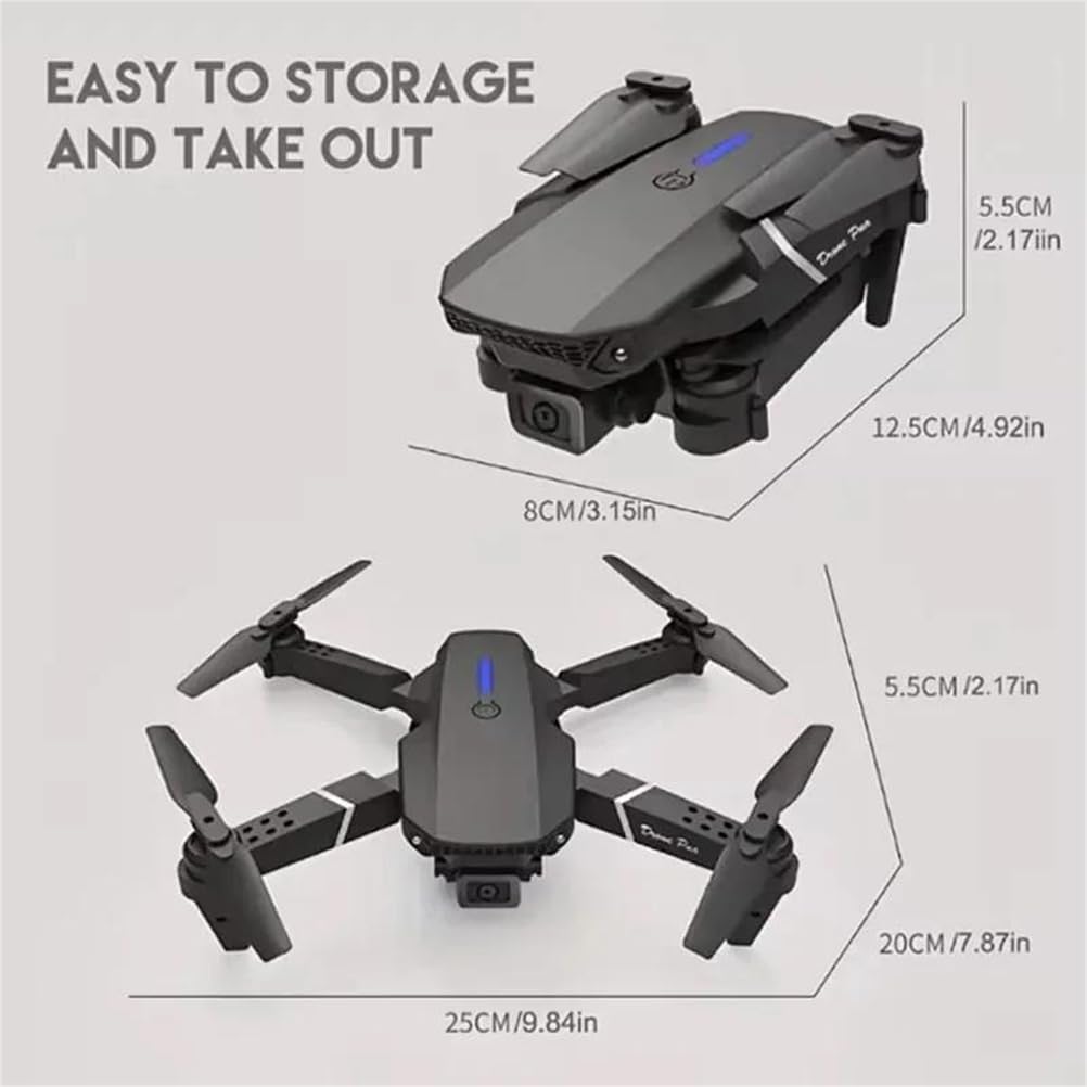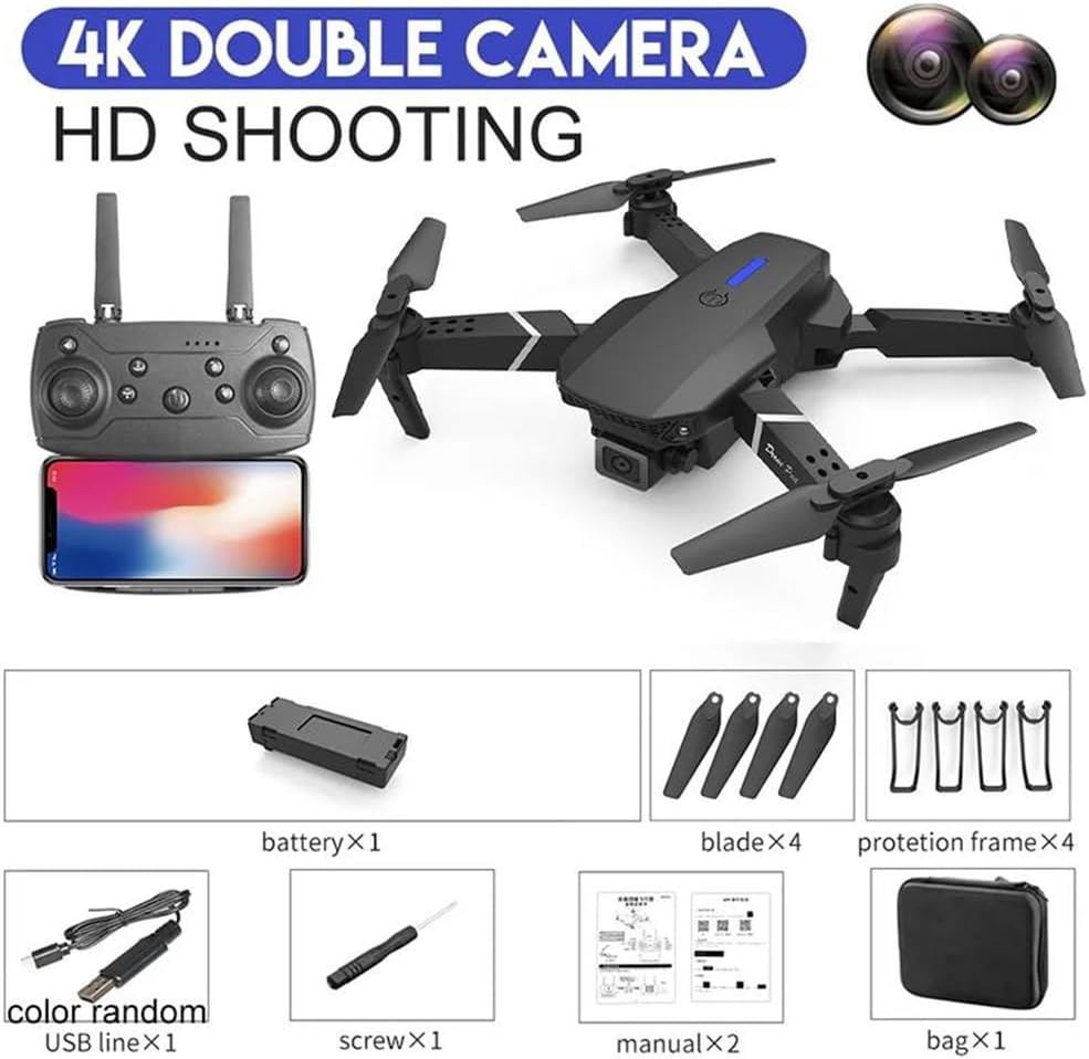 [Sblocca splendide viste aeree in 4K]Scopri la fotografia aerea di livello professionale con il drone QJ E88Pro **4K**. La sua **fotocamera 4K HD** cattura **video** cristallini (fino a 4096*2160) e vanta un ampio **campo visivo** di 90°, perfetto per catturare paesaggi ampi. Goditi il funzionamento **FPV** in tempo reale tramite l'app intuitiva sul tuo smartphone. [Compagno d'avventura ultra-portatile e pieghevole]Progettato per l'avventura, il **drone RC pieghevole** E88Pro si trasforma in un drone compatto (12,5*8*5,5 cm) per un facile trasporto nello zaino. Apri rapidamente le braccia per il decollo e goditi fino a 12 minuti di **tempo di volo** grazie alla sua batteria da 1800 mAh. Il **drone RC** perfetto per i viaggi e il divertimento all'aria aperta. [Volo stabile e controllo facile per tutti i piloti]Domina il cielo senza sforzo! Il drone con telecamera E88Pro è dotato di modalità di mantenimento dell'altitudine e di un giroscopio a 6 assi** per un'eccezionale stabilità in volo. Il suo intuitivo controllo a **4 canali** e la distanza di controllo remoto di 100 metri (2,4 GHz) lo rendono adatto a principianti e appassionati che cercano un'esperienza di volo con un drone FPV** stabile. [Volo FPV immersivo e controllo tramite app]Pilota come un professionista con il funzionamento FPV in tempo reale! Trasmetti video in diretta streaming direttamente sul tuo smartphone (si consiglia un display da 5,5") tramite Wi-Fi utilizzando l'app dedicata (supporta inglese/cinese). Il **telecomando** incluso (richiede 3 batterie AAA) offre una gestione precisa, rendendo questa **fotocamera drone** ideale per riprese dinamiche. [Ricco di funzionalità e certificato di sicurezza]Il **drone** professionale E88Pro è dotato di funzionalità essenziali: **faretti** luminosi e una **luce stroboscopica** per la massima visibilità, stabilizzazione ottica dell'immagine per riprese più fluide e certificazioni (CE/FCC/RoHS) per sicurezza e conformità. Un fantastico **regalo** per adolescenti (14+) e adulti che si avvicinano al mondo della **fotografia aerea**.