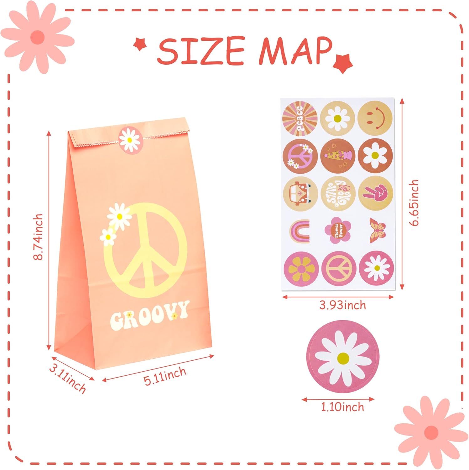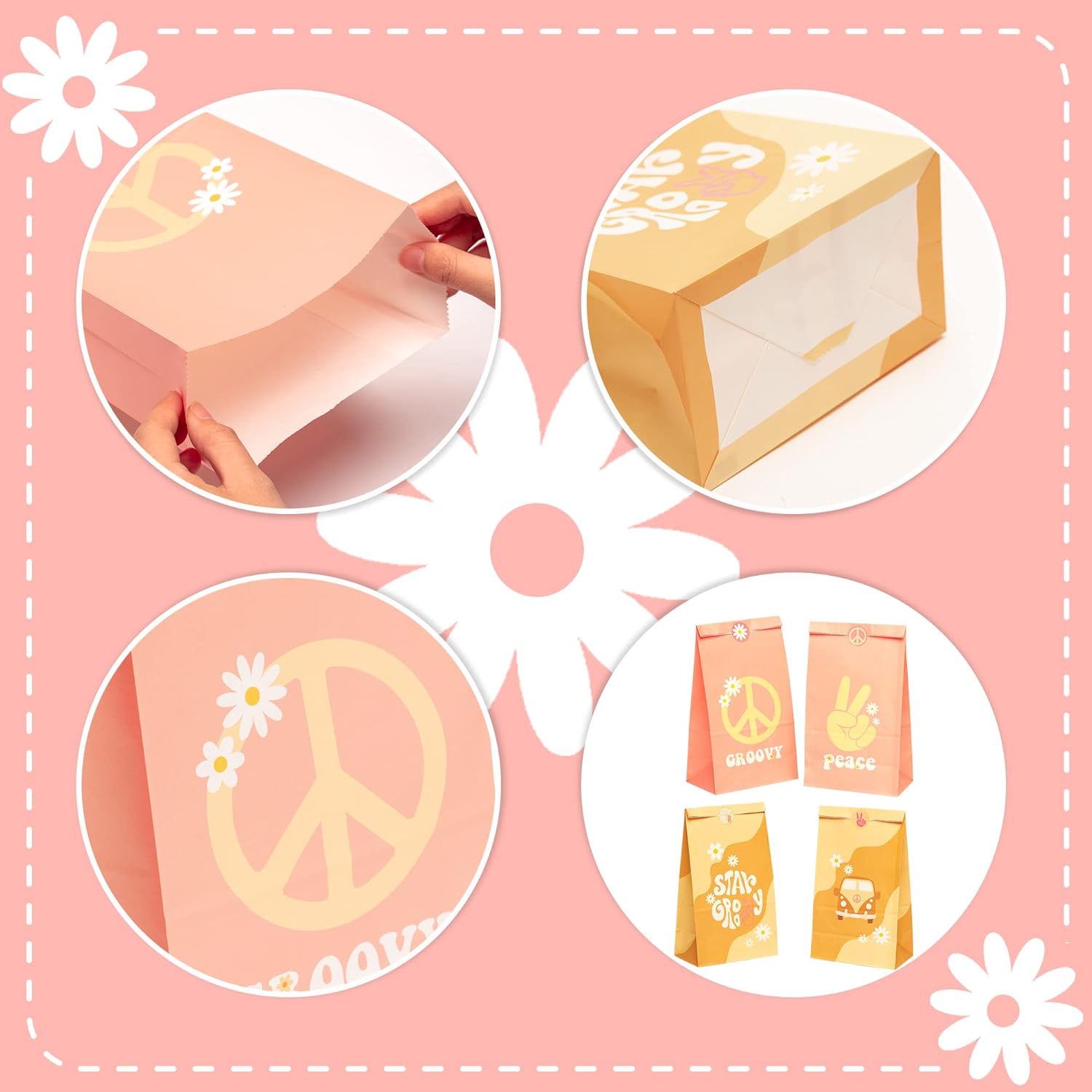 GROOVY PARTY BAG FAVORS BAG: La nostra festa favorisce la stampa di borse con un fantastico design retrò hippie boho, affascinante e vibrante. Sacchetti di carta retrò fantastici E la dimensione della borsa è 13 (lunghezza) * 7,5 (larghezza) * 23 cm (altezza), adatta per conservare snack, biscotti, dolcetti e piccoli giocattoli come regalo per gli amici. CONFEZIONE: La confezione contiene 24 sacchetti regalo in due diverse fantasie e 2 fogli di fantastici adesivi a tema. Gli adesivi hippie alla moda servono per sigillare i sacchetti dei dolcetti e proteggere le bomboniere. Questo set può soddisfare le tue esigenze di trasporto e distribuzione di regali ai tuoi ospiti. MATERIALE DI ALTA QUALITÀ: I nostri sacchetti per feste sono realizzati in buona carta, con una superficie spessa e liscia, che non sbiadisce, non ha odore, è inodore, portatile, durevole e riutilizzabile. È molto sicuro per riporre snack e articoli per feste e puoi anche piegarlo per un secondo utilizzo. AMPIA APPLICAZIONE: Questa borsa da festa per ampie applicazioni come borse regalo, per molte occasioni come feste di compleanno fantastiche, feste hippie retrò anni '60, baby shower a tema arcobaleno boho, campeggio estivo, matrimoni, riunioni di famiglie/amici ecc. Credo che possa sorprendere gli ospiti della tua festa! SERVIZIO CLIENTI TEMPESTIVO: Se i tuoi prodotti presentano problemi di qualità o quantità con il nostro prodotto, non esitare a contattarci. Il nostro team di supporto alle vendite risolverà questo problema online! La tua felicità è davvero importante per noi!