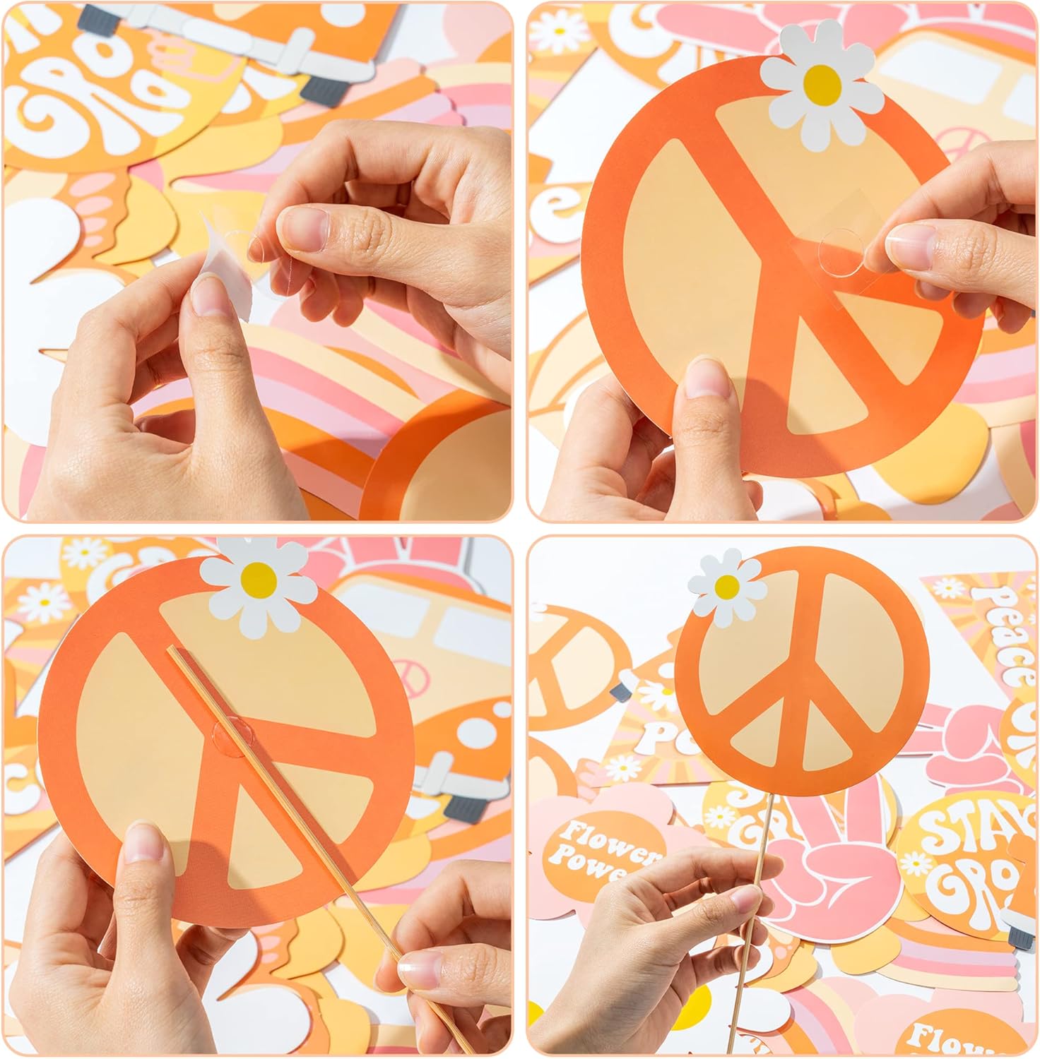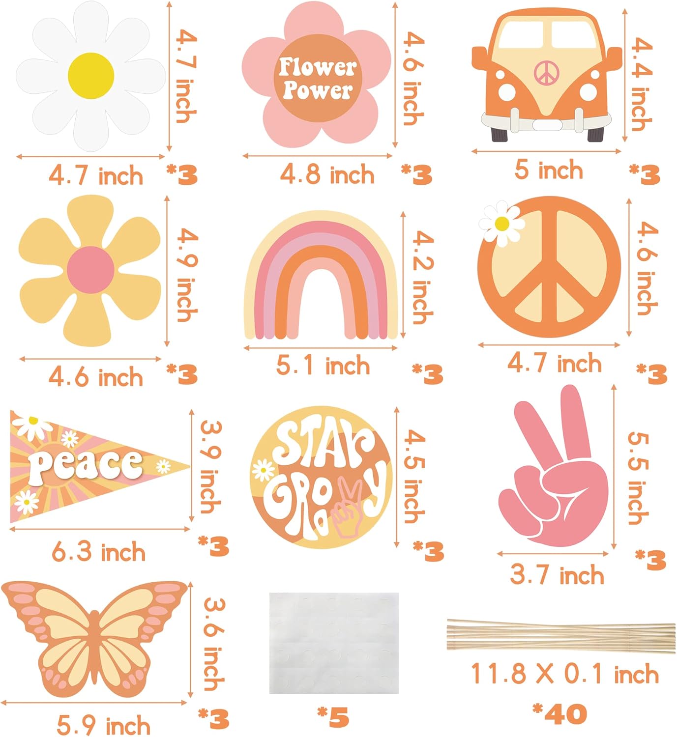 Pacchetto a tema Groovy: riceverai 40 bastoncini di bambù, 5 punti adesivi e 30 carte boho groovy in 10 diversi design arcobaleno, farfalla, margherita, bandiera della pace, "Star Groovy", "Flower Power", autobus retrò ecc. Una quantità sufficiente può soddisfare le esigenze della tua festa. Materiale: realizzato in materiale resistente e stampato su entrambi i lati, superficie morbida, riutilizzabile. La tecnologia di stampa digitale avanzata rende vivo il modello. Utilizzo: utilizzare la colla per incollare insieme la carta e i bastoncini di bambù. Riceverai graziosi centrotavola come decorazione Scena applicabile: è perfetta per feste a tema hippie bohémien, feste di compleanno, baby shower, feste scolastiche, matrimoni o altre feste importanti. Decorazioni colorate per le feste per creare una bellissima atmosfera di festa. Siamo qui per te: ci impegniamo a rendere piacevole la tua esperienza di acquisto. Se avete domande sul prodotto, non esitate a contattarci.