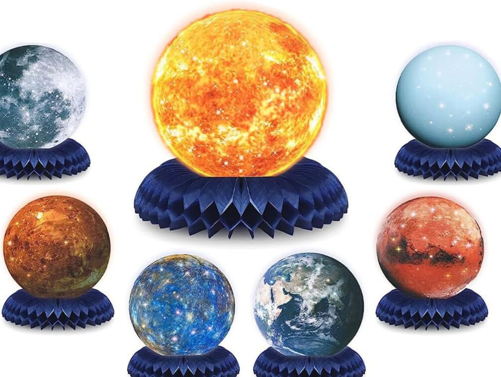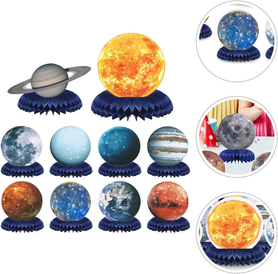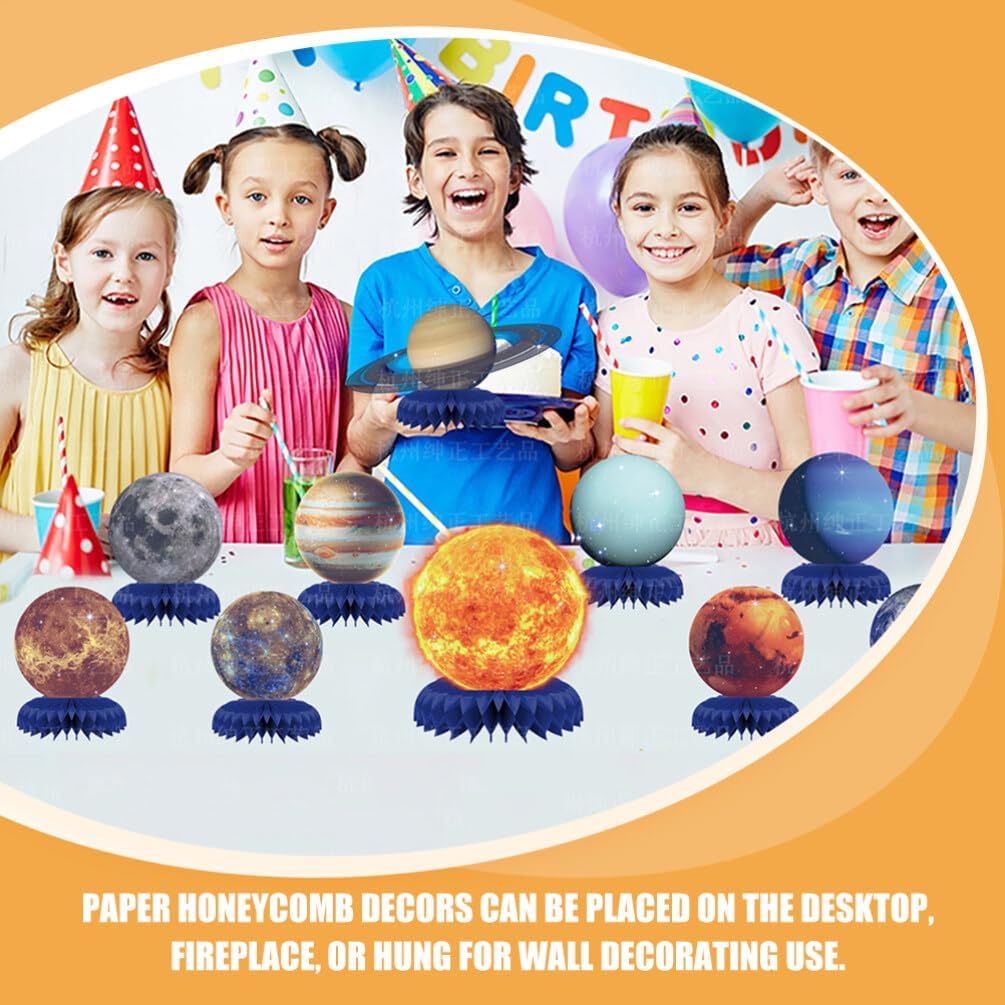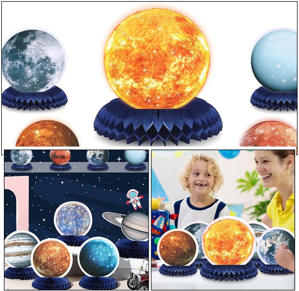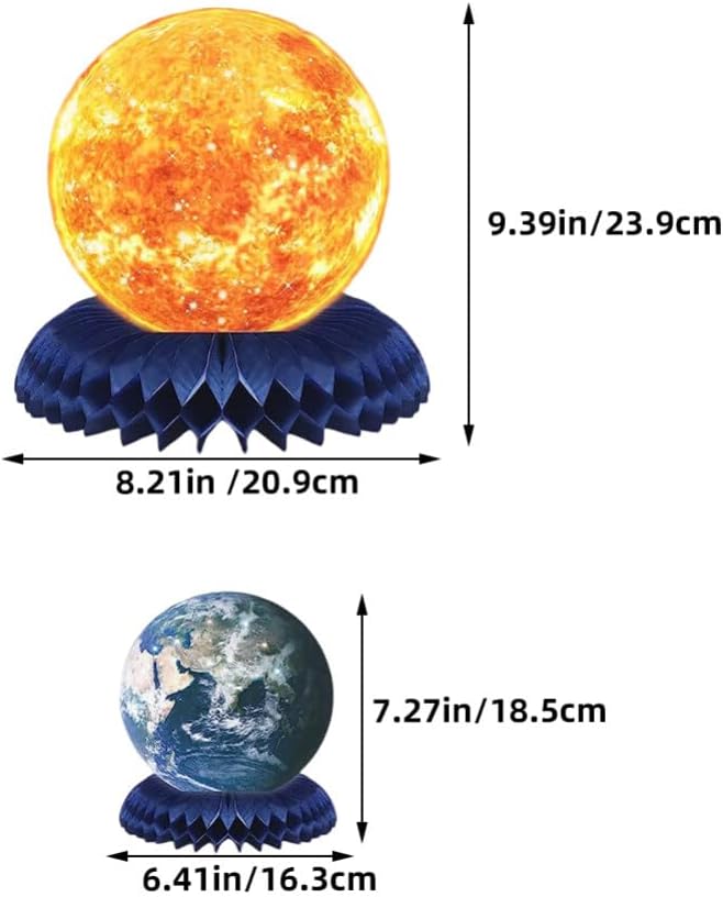 It comes with honeycomb look and light weight, easy to be placed on the desktop, floor and so on. This honeycomb table centerpiece adornment is ready to decorate the entire house, easy to create a cheerful party atmosphere. You can also use these centerpieces adorns to take more nice photos and leave unforgettable moments. This honeycomb centerpiece set is manufactured with paper material, practical for party scene layout. The honeycomb decor uses planet theme design to add fun to your party table decoration.