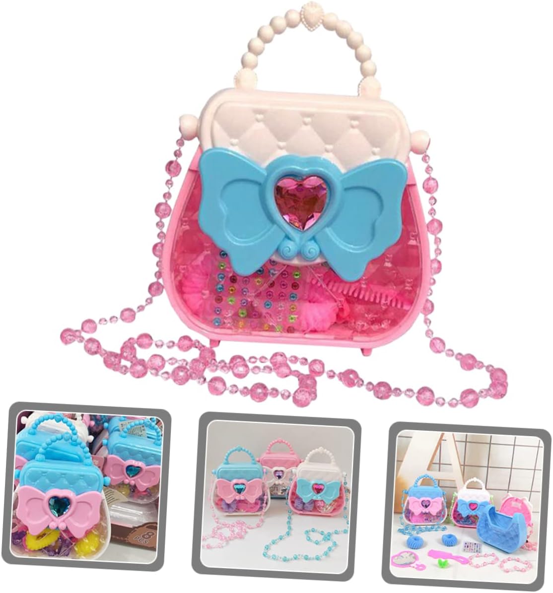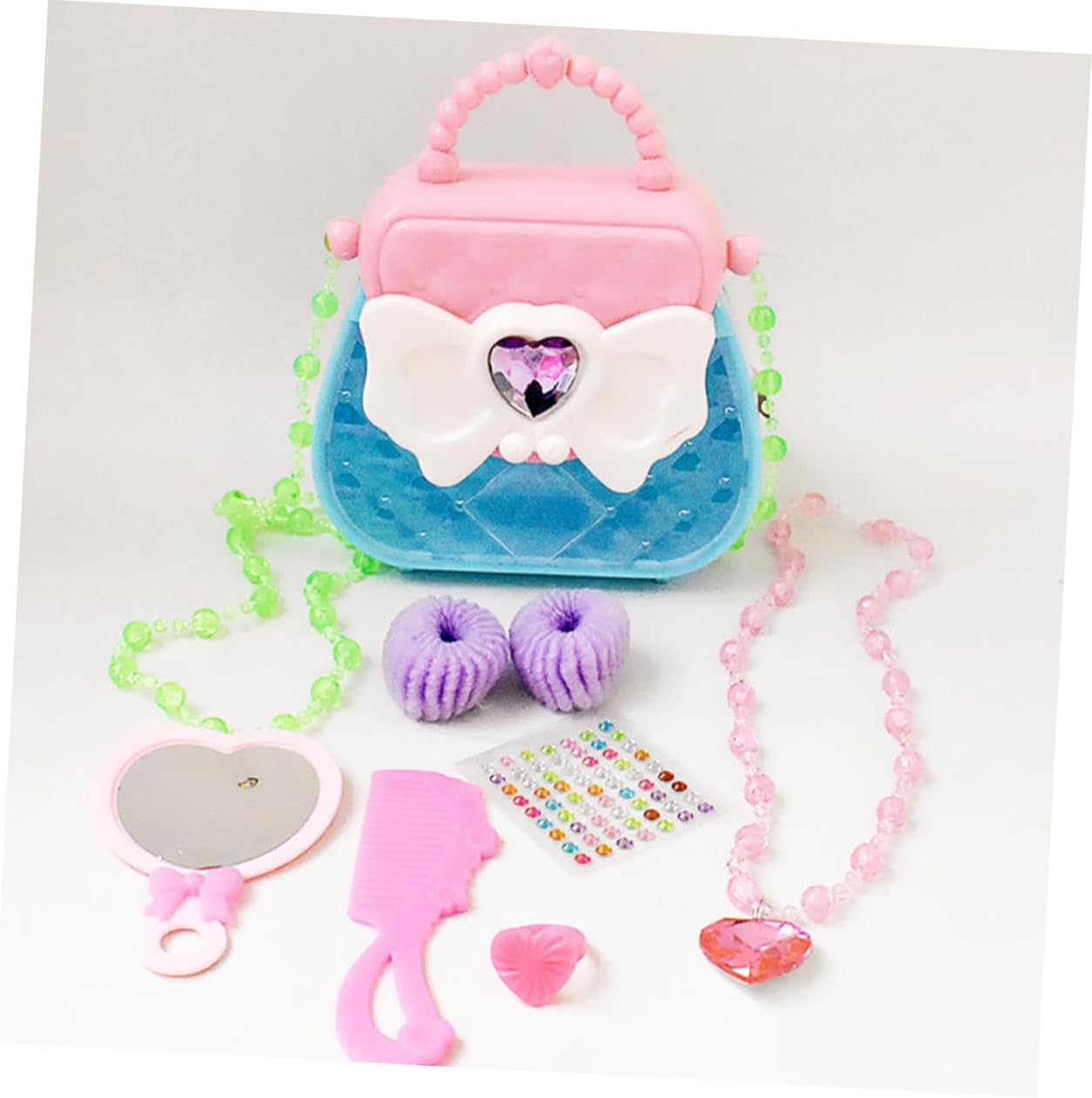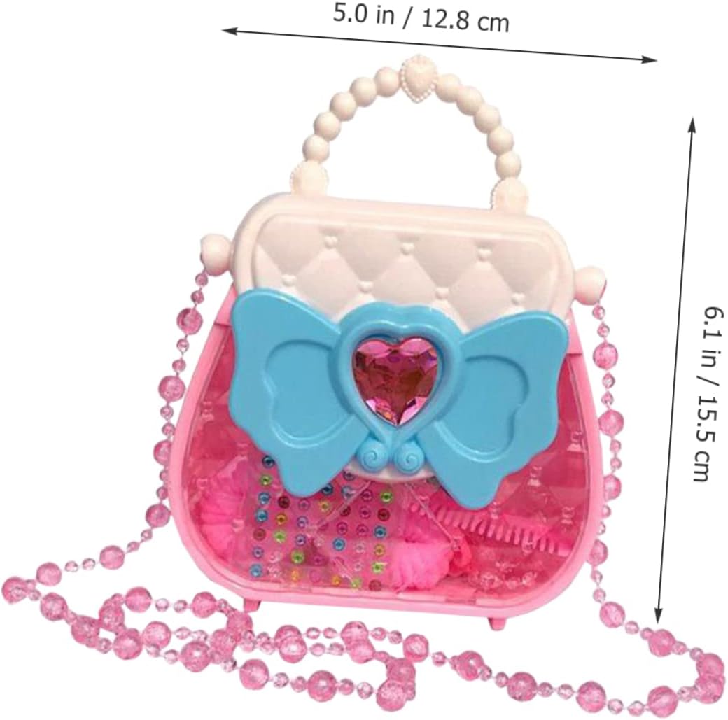 Finta di giocare: i giocattoli godono di una forte durata, che non è facile da deformare e rompere. Regalo per ragazza: design colorato, pratico per sviluppare capacità visive e capacità di coordinazione occhio-mano. Giocattoli da principessa: i bellissimi gioielli aggiungono sorpresa e divertimento alla ragazza. una borsa elegante brilla per rendere la tua principessa più visibile per strada. Kit per il trucco: giocattolo cosmetico perfetto per giochi di finzione, feste di compleanno, travestimenti e attività divertenti quotidiane per i bambini. Fornitura per ragazze: puoi inviarla ai bambini regalo di compleanno, ne saranno affezionati.