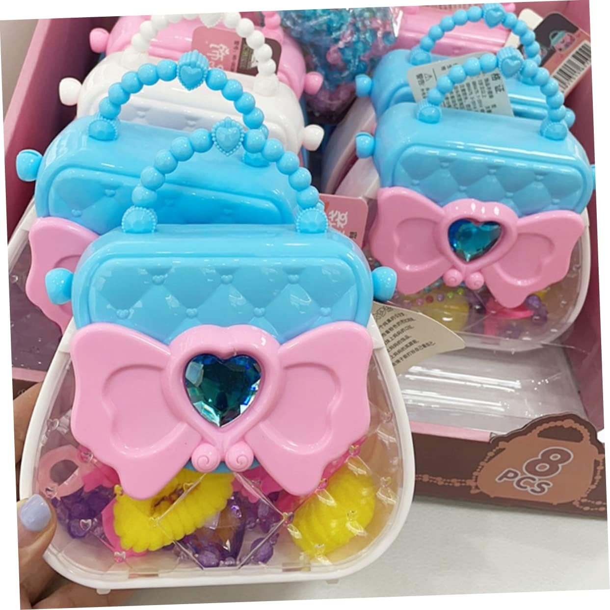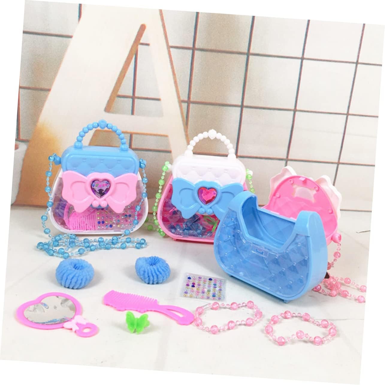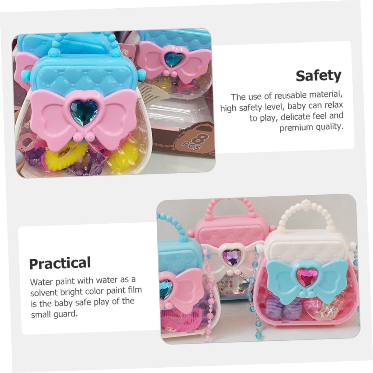 Finta di giocare: i giocattoli godono di una forte durata, che non è facile da deformare e rompere. Regalo per ragazza: design colorato, pratico per sviluppare capacità visive e capacità di coordinazione occhio-mano. Giocattoli da principessa: i bellissimi gioielli aggiungono sorpresa e divertimento alla ragazza. una borsa elegante brilla per rendere la tua principessa più visibile per strada. Kit per il trucco: giocattolo cosmetico perfetto per giochi di finzione, feste di compleanno, travestimenti e attività divertenti quotidiane per i bambini. Fornitura per ragazze: puoi inviarla ai bambini regalo di compleanno, ne saranno affezionati.