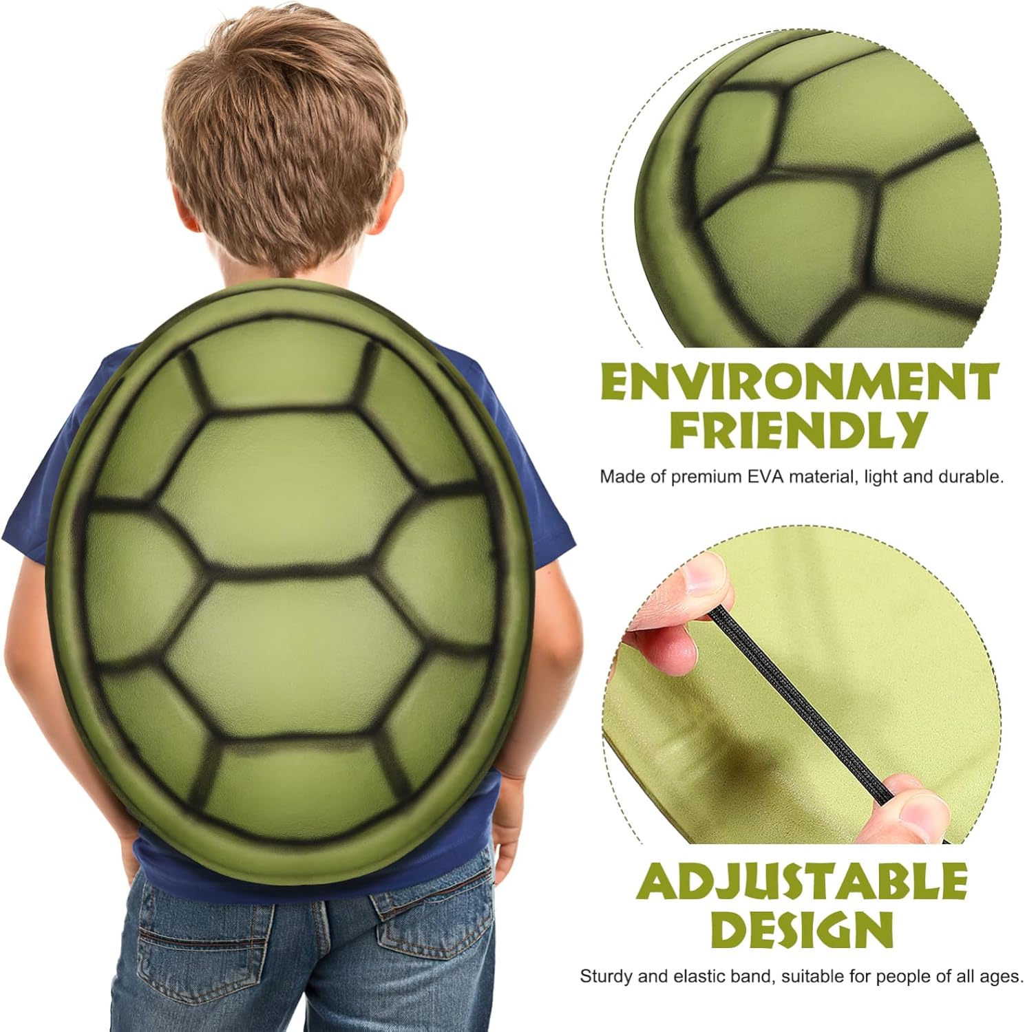 Guscio di tartaruga di HALLOWEEN: il guscio di tartaruga per bambini è realizzato in materiale EVA, sicuro, confortevole e delicato sulla pelle. Dimensioni: 44,00 x 38,00 x 4,00 cm. SERBATOIO PER TARTARUGA PER BAMBINI: giocattolo di scena cosplay TANK PER TARTARUGA. Leggero e traspirante, comodo da indossare sulla schiena. Il guscio della tartaruga è realizzato in materiale EVA, che non è facile da deformare e rompere, prolungandone notevolmente la durata. ZAINO TARTARUGA HALLOWEEN: lo zaino giocattolo con guscio di tartaruga Ninja EVA per bambini è leggero, non sbiadisce e facile da cambiare. Gli spallacci elastici possono essere facilmente posizionati sopra la spalla e si adattano a quasi tutti. Costumi COSPLAY con oggetti di scena in guscio di tartaruga: il divertente costume da tartaruga è adatto per feste, carnevali, balli in maschera o altre celebrazioni. Ad esempio, Halloween, Natale, feste, giochi di ruolo e altre occasioni possono migliorare notevolmente l'atmosfera festosa. GUSCIO DI TARTARUGA Abbigliamento, costumi di spettacolo: i costumi di Halloween cosplay di animali sono adatti per uso personale o per gli amici. Il guscio di tartaruga simulato può essere utilizzato come supporto per le prestazioni.