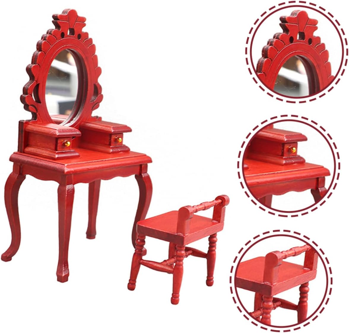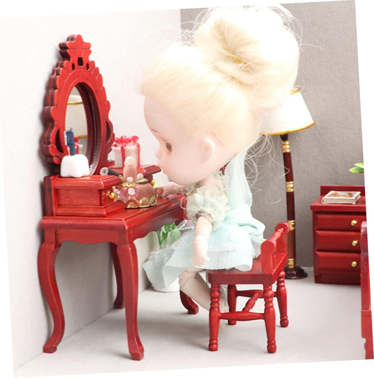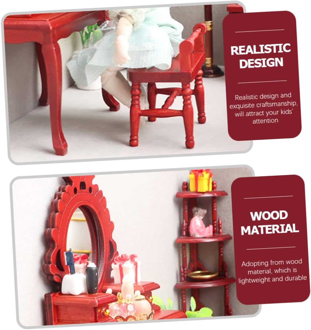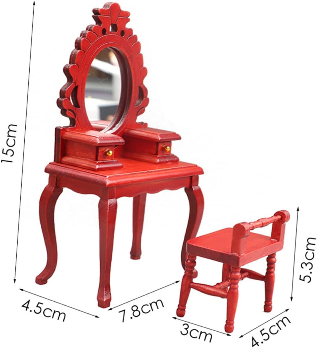Cassettiera: adatta per la casa in miniatura, un'ottima decorazione per la tua casa in miniatura, creando scene di vita colorate. Cassettiera per bambini: versatile ed elegante, può essere utilizzata come supporto per layout, supporto fotografico, accessorio per la decorazione della casa in miniatura. Toeletta: un importante accessorio per la mini casa e rende la tua mini camera da letto più attraente e reale. Decorazione del bagno in miniatura: toletta in legno in miniatura e design del modello di sgabello, realistico, liscio e sicuro con cui giocare. Mobili per la camera da letto: possono rendere più divertente il tuo fai da te, questa toletta e sgabello in miniatura rendono la tua piccola casa divertente e unica.