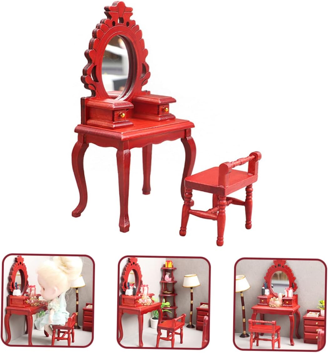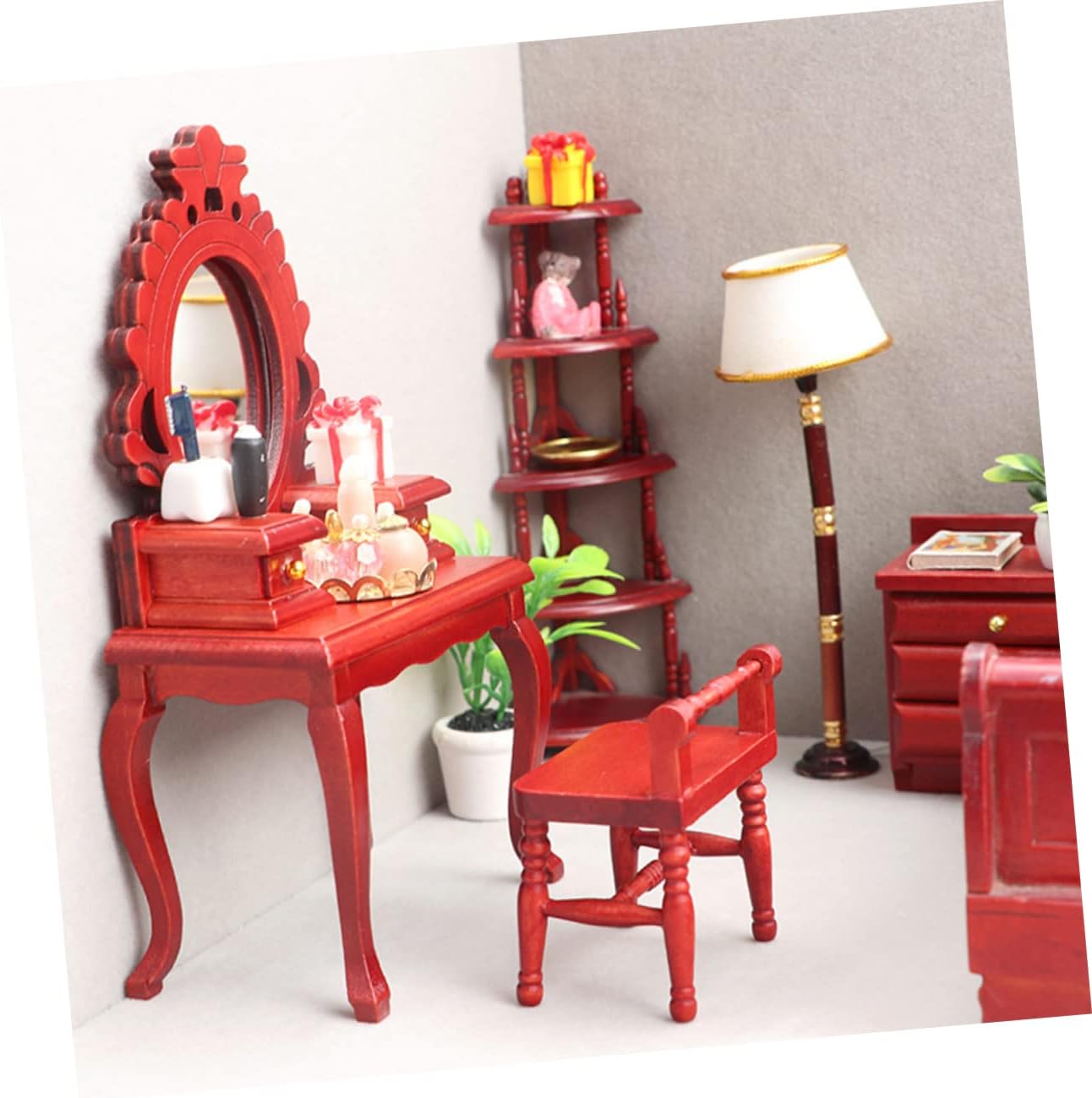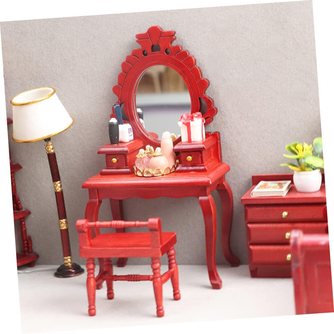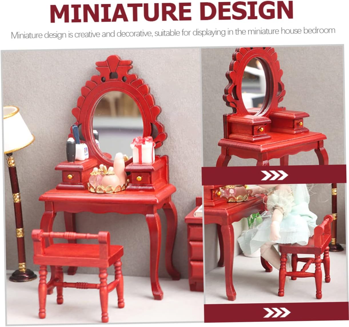 Cassettiera: adatta per la casa in miniatura, un'ottima decorazione per la tua casa in miniatura, creando scene di vita colorate. Cassettiera per bambini: versatile ed elegante, può essere utilizzata come supporto per layout, supporto fotografico, accessorio per la decorazione della casa in miniatura. Toeletta: un importante accessorio per la mini casa e rende la tua mini camera da letto più attraente e reale. Decorazione del bagno in miniatura: toletta in legno in miniatura e design del modello di sgabello, realistico, liscio e sicuro con cui giocare. Mobili per la camera da letto: possono rendere più divertente il tuo fai da te, questa toletta e sgabello in miniatura rendono la tua piccola casa divertente e unica.