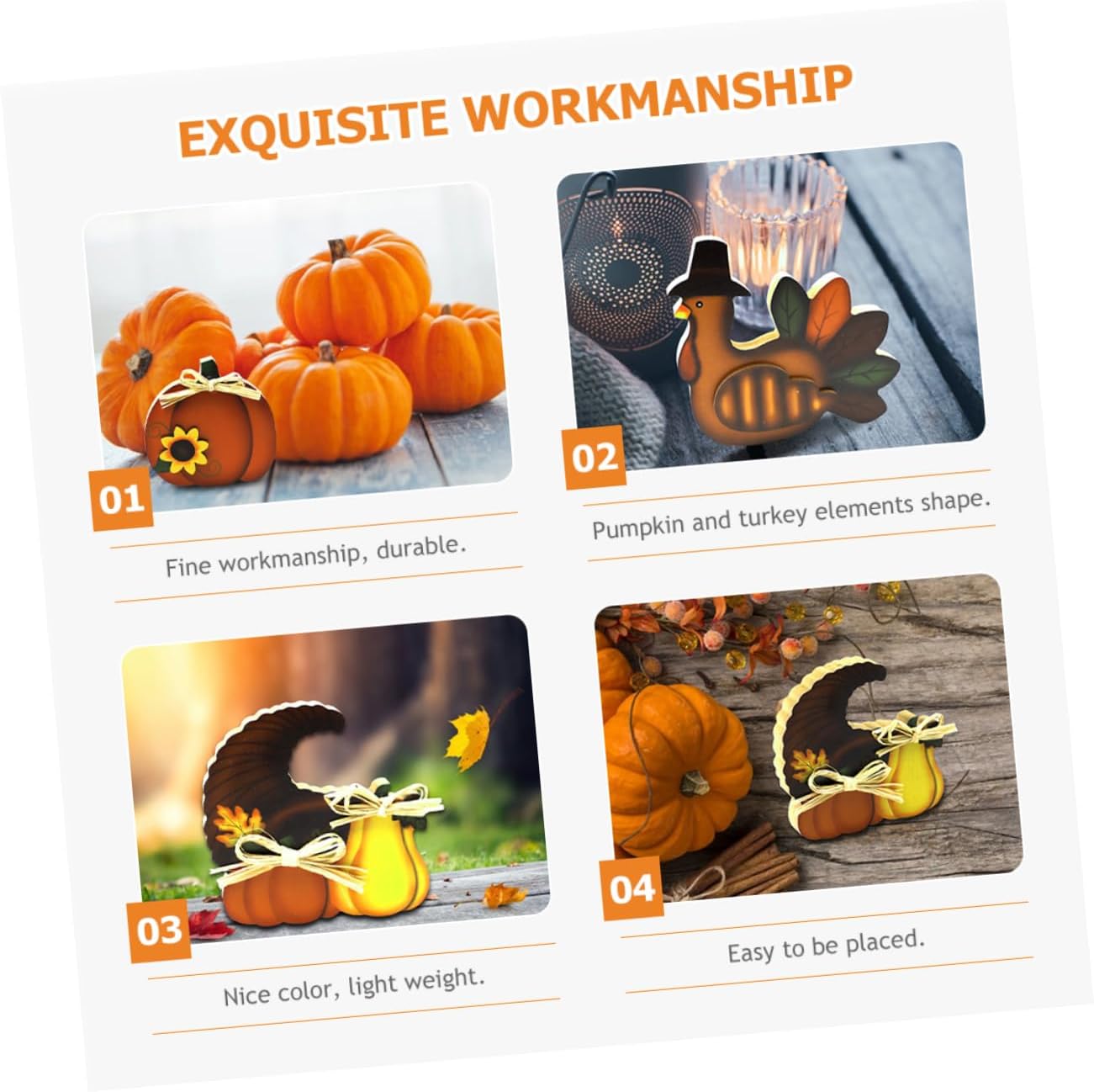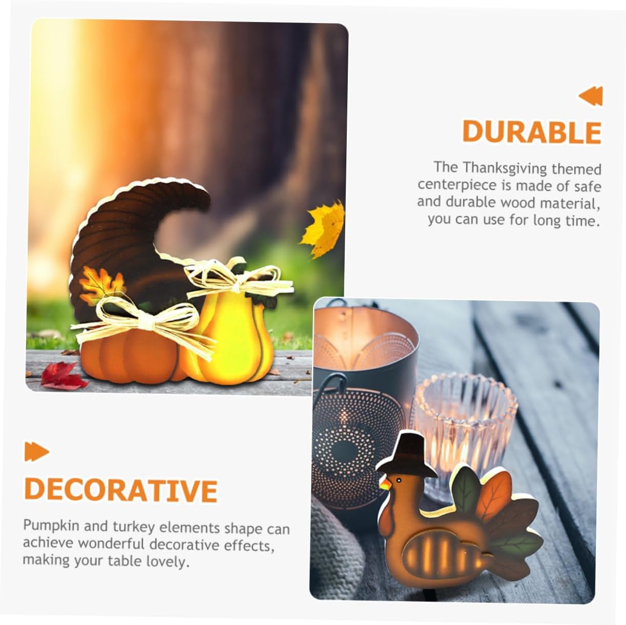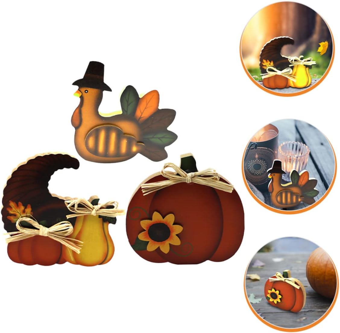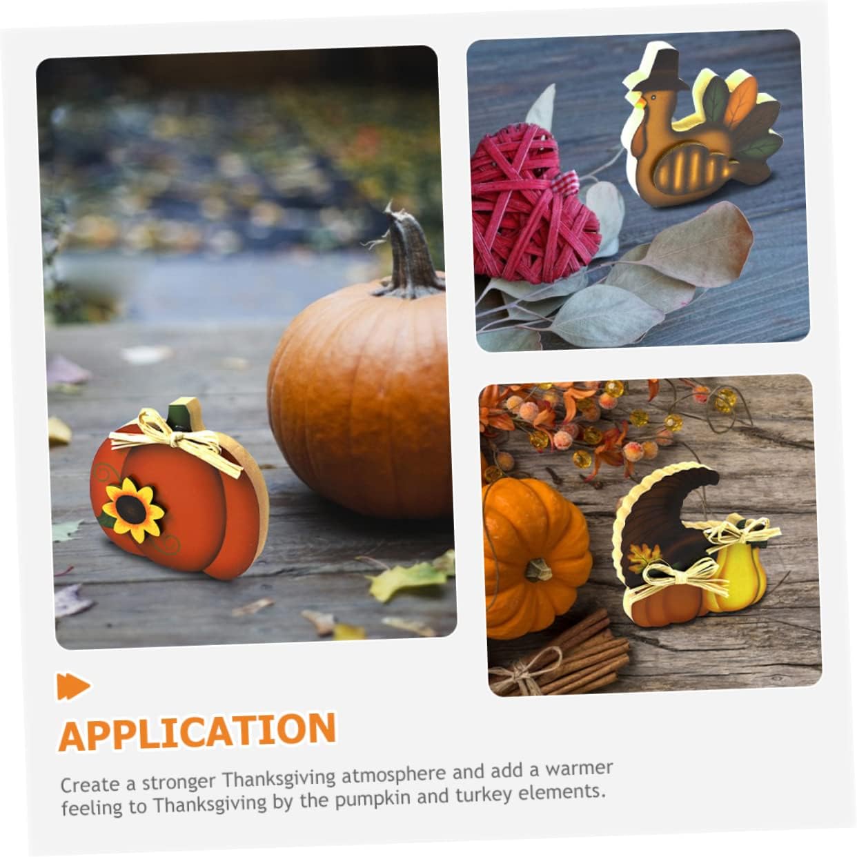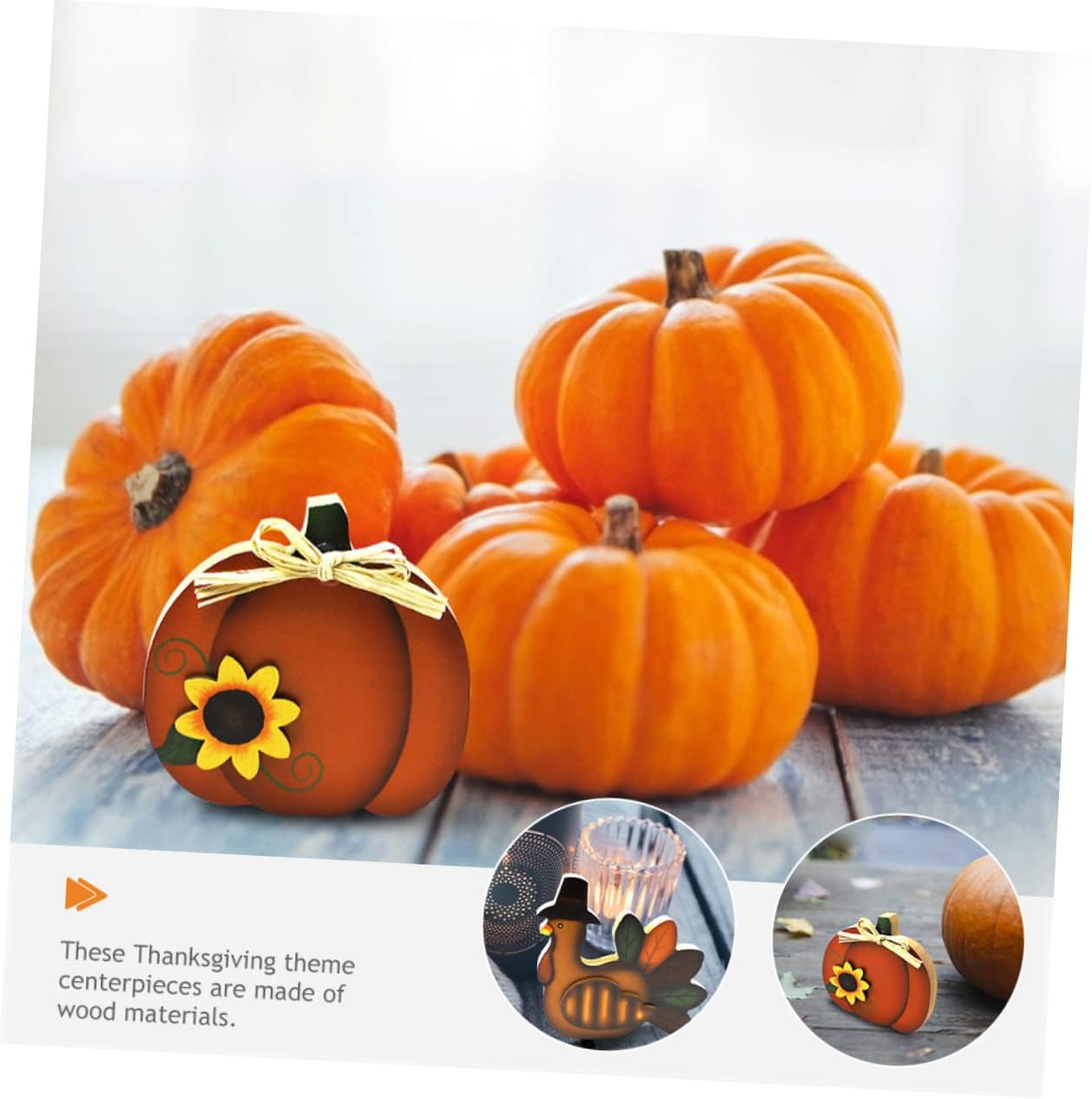 Ornamento del ringraziamento: l'arredamento della festa del raccolto può essere un meraviglioso supporto fotografico per i fotografi creativi, lasciando momenti più indimenticabili. Decorazioni tavolo per il ringraziamento: 3 ornamenti per la tavola del ringraziamento, l'esclusiva forma di tacchino e zucca sembra adorabile se esposta a casa tua. Ornamento desktop del ringraziamento: crea un'atmosfera più forte del ringraziamento, adatta per feste del ringraziamento, raccolto autunnale e così via. Fornitura per feste: questi centrotavola del ringraziamento utilizzano materiale in legno, resistente e sicuro per un uso a lungo termine. Decorazione del centrotavola: la forma degli elementi di zucca e tacchino può ottenere meravigliosi effetti decorativi, rendendo la tua tavola adorabile.