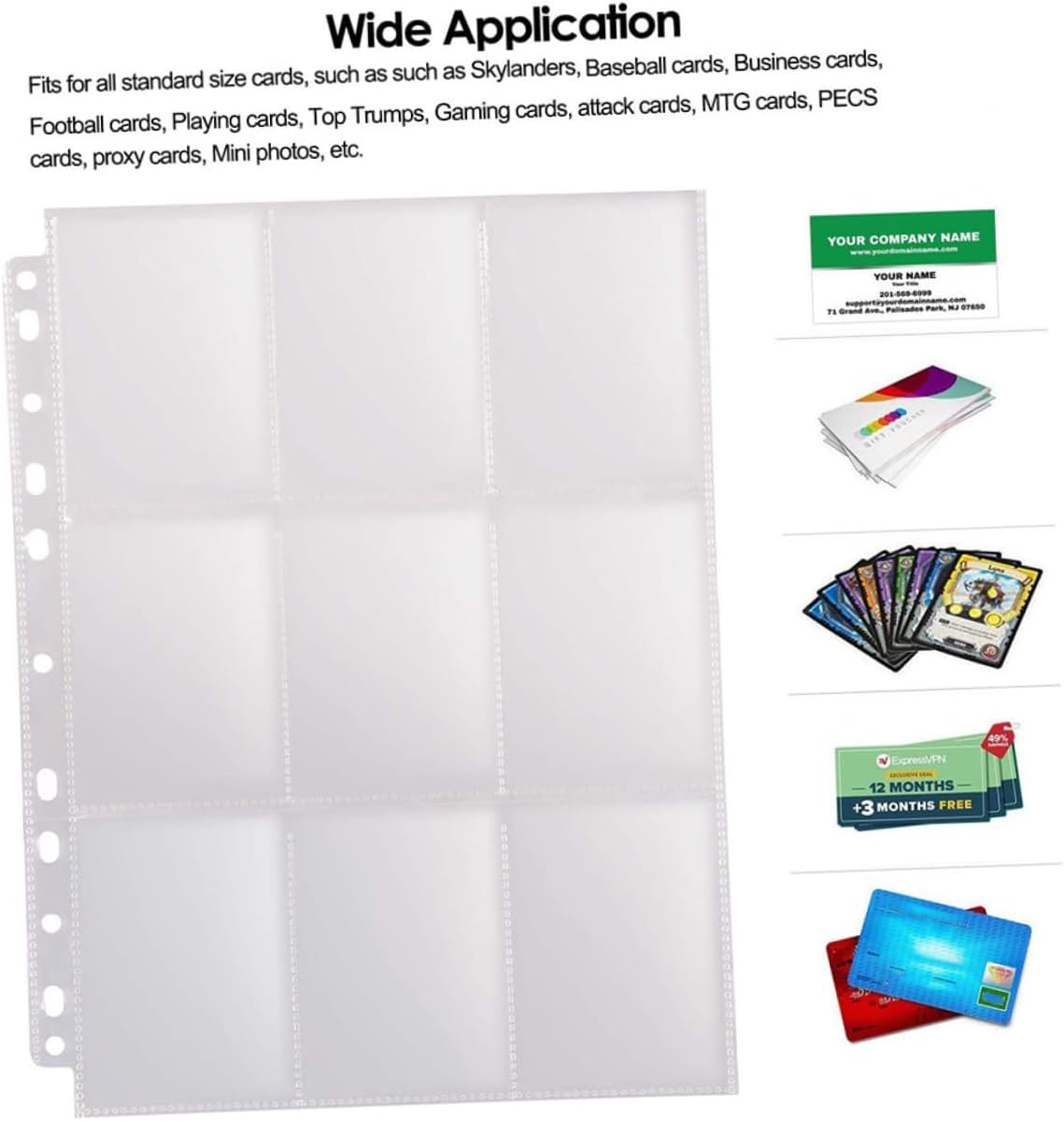 Maniche con tasca trasparente: cuciture rinforzate termosaldate per durare, capacità di organizzare bene le carte collezionabili, mini raccoglitori. Buste per carte sportive: anche per i tuoi bambini per organizzare carte da gioco, briscole, adesivi, francobolli per carte da gioco e altro ancora, protezioni per le pagine delle carte tascabili. Tasche protettive per carte: i sigilli delle pagine dei porta carte sono solidamente sigillati per un'elevata resistenza della tenuta e una migliore qualità distesa, protezione per carte trasparente. Porta carte portafoglio: tasche per carte collezionabili, maniche adatte per tutte le carte collezionabili di dimensioni standard, buste per biglietti da visita. Buste per carte da baseball: adattano a qualsiasi pagina con fori standard, plastica trasparente più comoda per gestire le tue carte, buste per carte collezionabili.