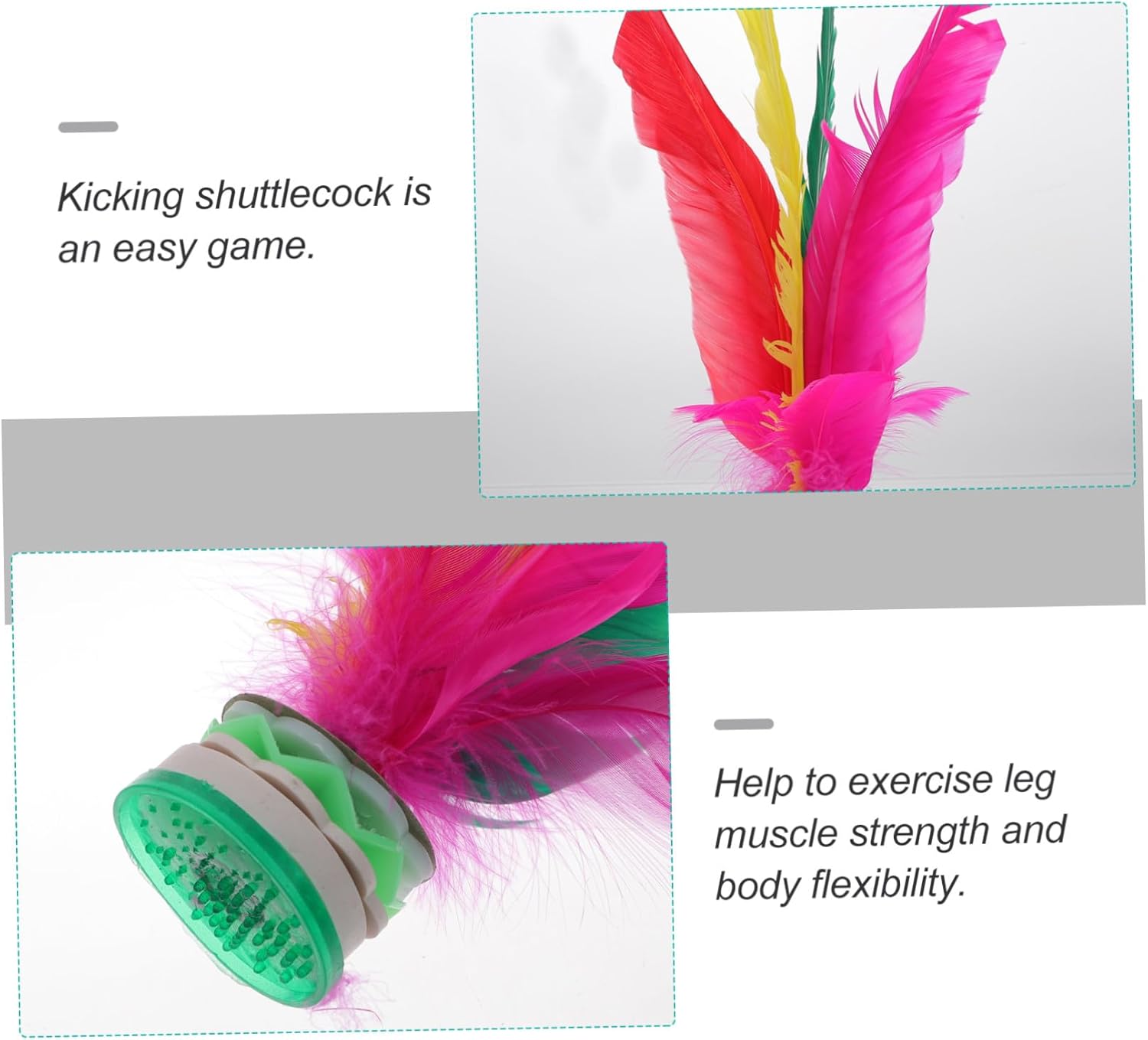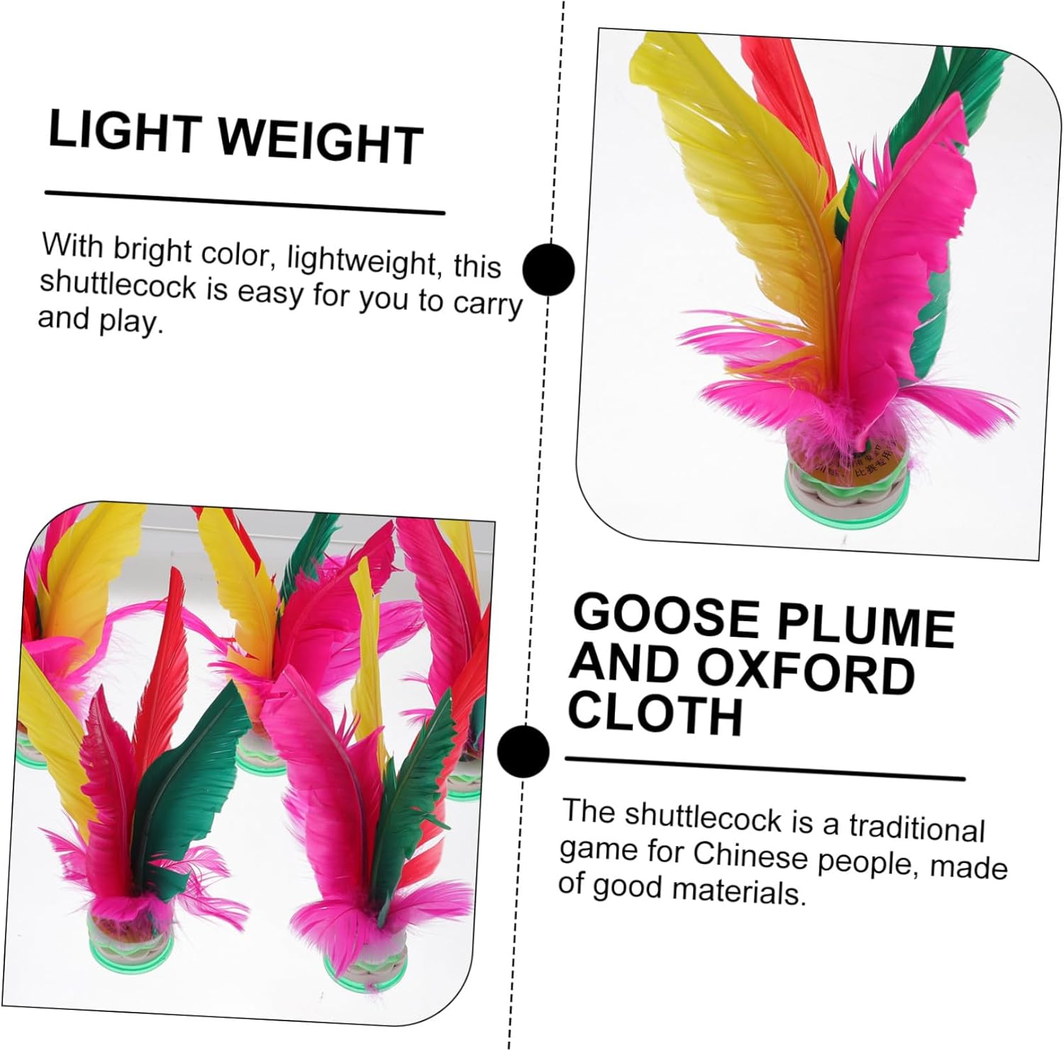 Volani con base oxford: questo calciato è solitamente giocato da una o più persone, che a tenerlo in aria il più a lungo possibile Con d'oca: con colori vivaci, leggero, questo è facile da trasportare e da giocare, colorato Giocattolo creativo per calciare: calciare il a lungo termine avrà un buon effetto, può esercitare la muscolare delle gambe e la flessibilità del corpo, giocattolo per calci plume Forniture sportive: basta usare un solo lato del piede per giocare e divertirsi, giocattolo per la protezione dell'ambiente Giocattolo da calciare: adatto per giocare all'interno che all'esterno, in particolare per le attività sportive di fitness a scuola, plume made kicking plaything