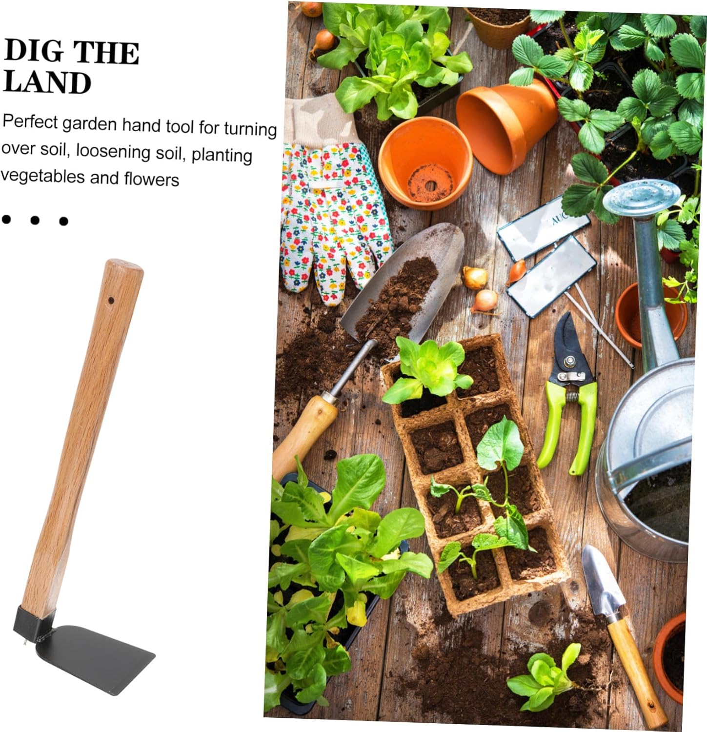 Strumento per diserbo da esterno: questa da giardino è per scavare, smuovere il terreno, trapiantare, ecc., pratico nelle forniture quotidiane per il giardinaggio, strumento per piantare Attrezzi manuali da giardinaggio: design leggero e portatile, questa con testa in ferro è più comoda da riporre e trasportare, attrezzo da giardinaggio per zappare Strumento agricolo: la da giardinaggio è una buona scelta per i tuoi amici intimi o le famiglie che amano il giardinaggio, portatile Strumento per piantare fiori: questa da giardinaggio ha un manico ergonomico in legno, rimuove facilmente rami ed indesiderati, piccola da giardino Piccola portatile: mostra le tue abilità di giardinaggio con questo pratico strumento per diserbare, scavare, coltivare e allentare il terreno