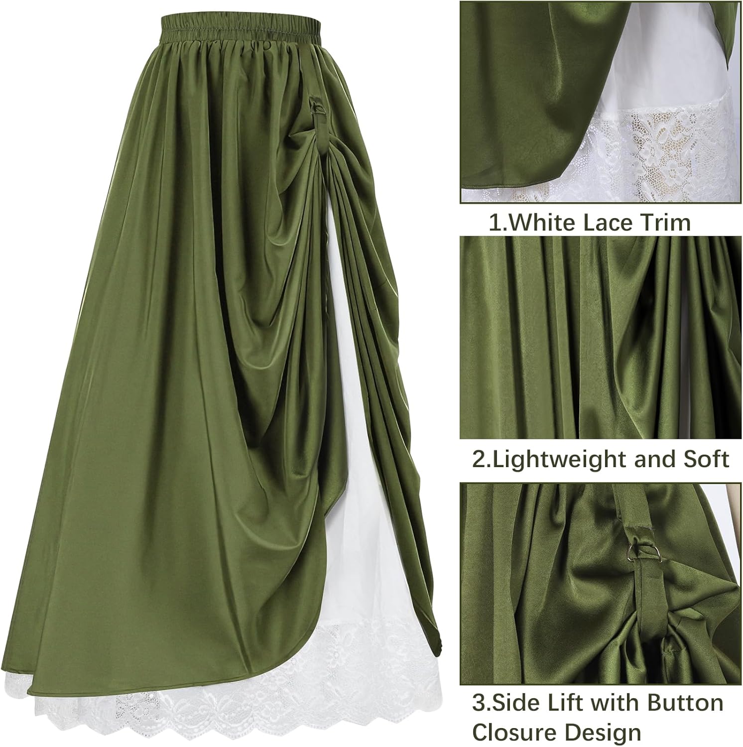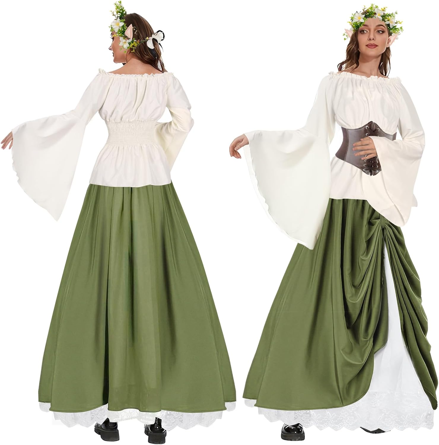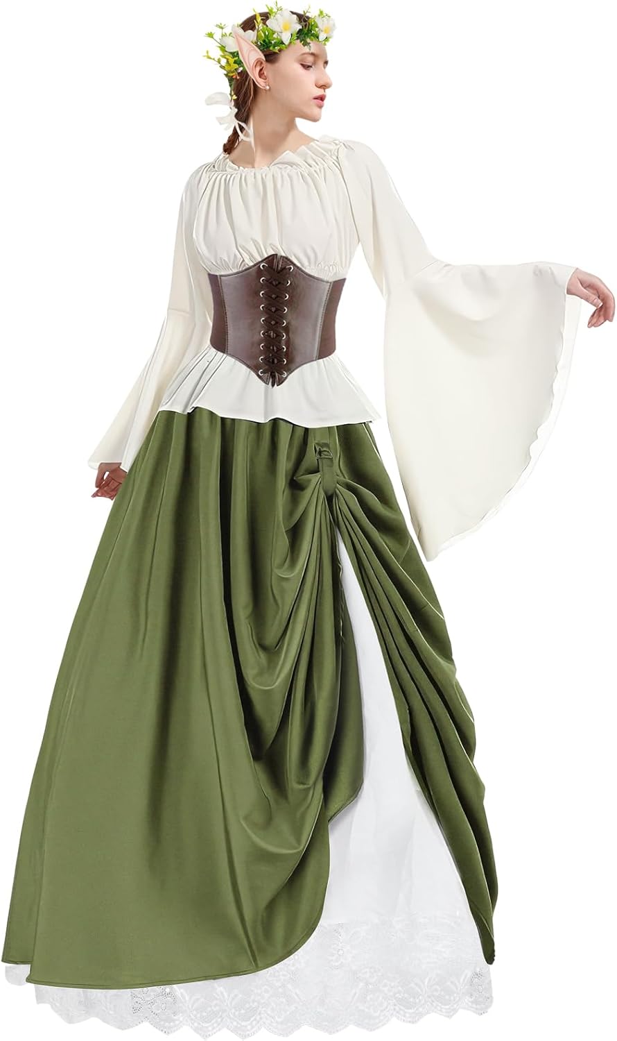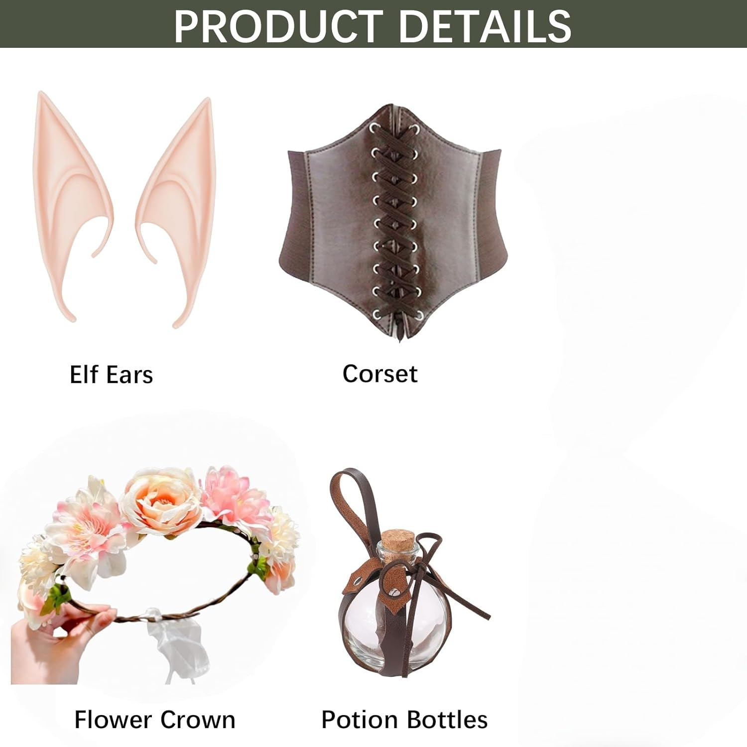 Descrizione prodotto Questo set è composto da 6 pezzi: top beige ×1, gonna lunga verde militare da donna, 1 corona di fiori × 1, 1 bicchiere di pozione magica, corsetto × 1, orecchie da elfo medievali × 1. Il costume da elfo medievale in stile vintage è stato progettato per chi lo ama e combina elementi vintage medievali in un outfit delicato e romantico. Abbiamo applicato l'idea del vintage medievale per progettare un costume da elfo in stile vintage medievale. L'elemento della foresta d'elfo ha la sensazione nebbiosa del misterioso sfondo medievale. La parte superiore ha maniche da principessa e design gonna, il bustino è realizzato in doppio pizzo, due orecchie da elfo aggiungono un senso di mistero e mostrano la bellezza. Questo set in poliestere di alta qualità offre un comfort morbido. A casa o in viaggio, questo vestito in due pezzi di ispirazione medievale offre comfort e libertà di movimento. Facile da pulire, basta lavare a mano o in lavatrice e lasciare asciugare all'aria. Adatto per molte occasioni speciali e tutte le stagioni. Che si tratti di un cosplay, feste a tema, Halloween, matrimonio in stile retrò medievale, evento a tema rinascimentale, travestimento di carnevale, ballo di fine anno o abbigliamento quotidiano, questa tuta può immergerti nel misterioso mondo del Medioevo. Classico e misterioso, vintage e moderno, vi porterà a vivere il misterioso mondo fantasy. Il costume da elfo in stile medievale retrò è ottimale e ideale sia per le feste che per l'uso quotidiano. Combina il passato con elementi moderni ed è un vero e proprio colpo d'occhio, alla moda e bello, letterario ed elegante. Il regalo perfetto per lei. Avviso di sicurezza no