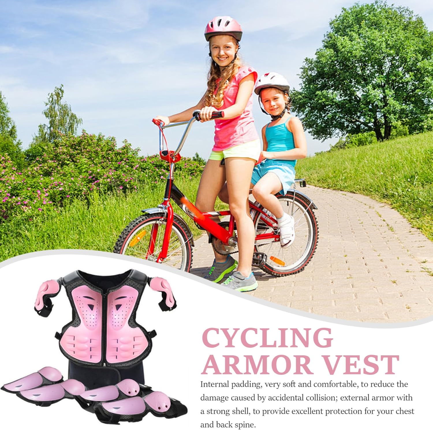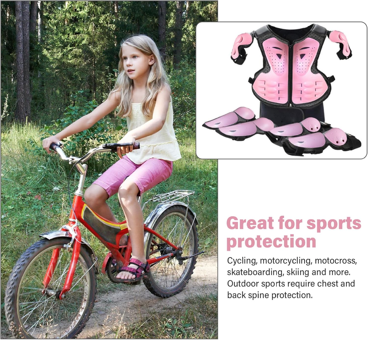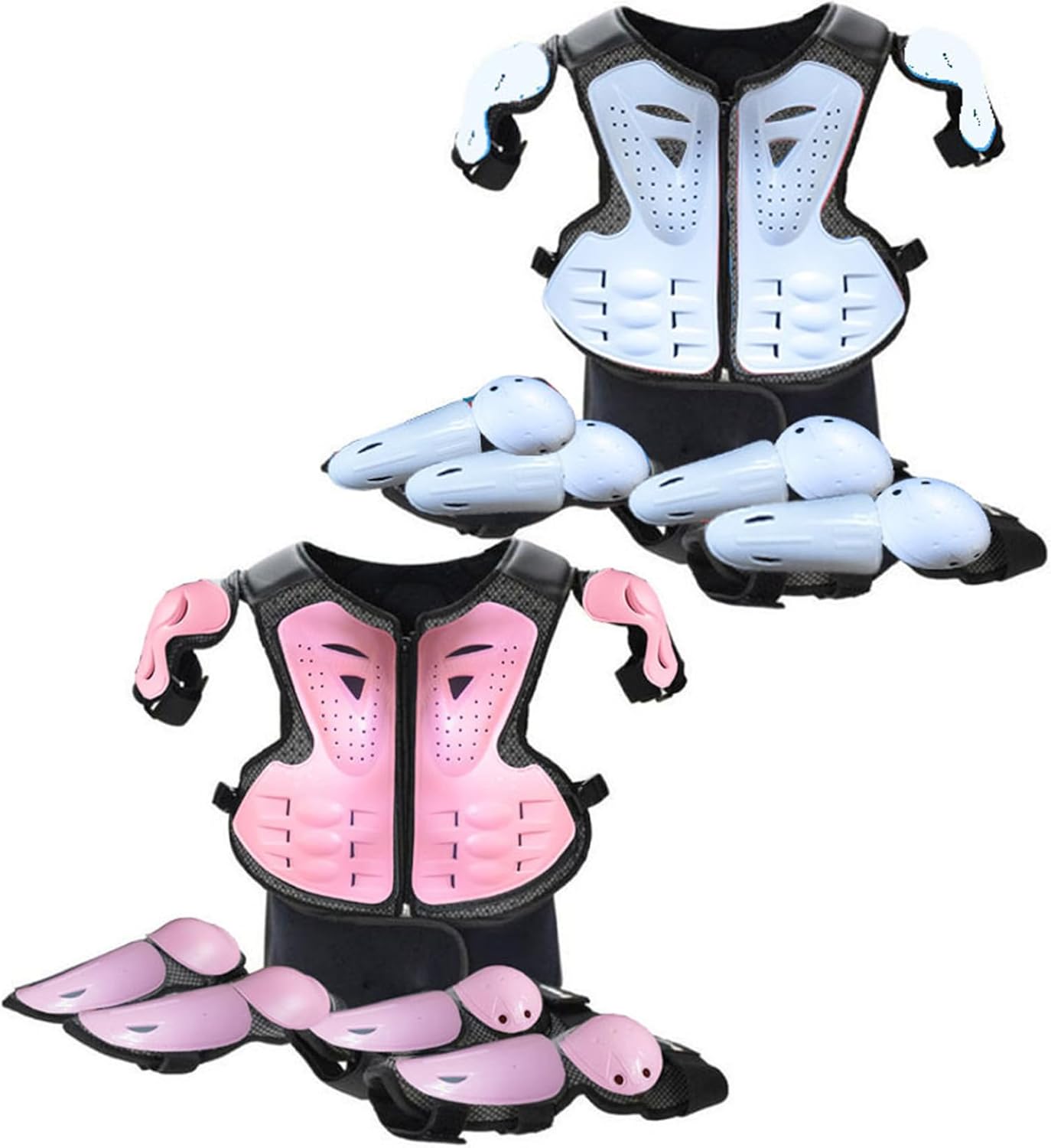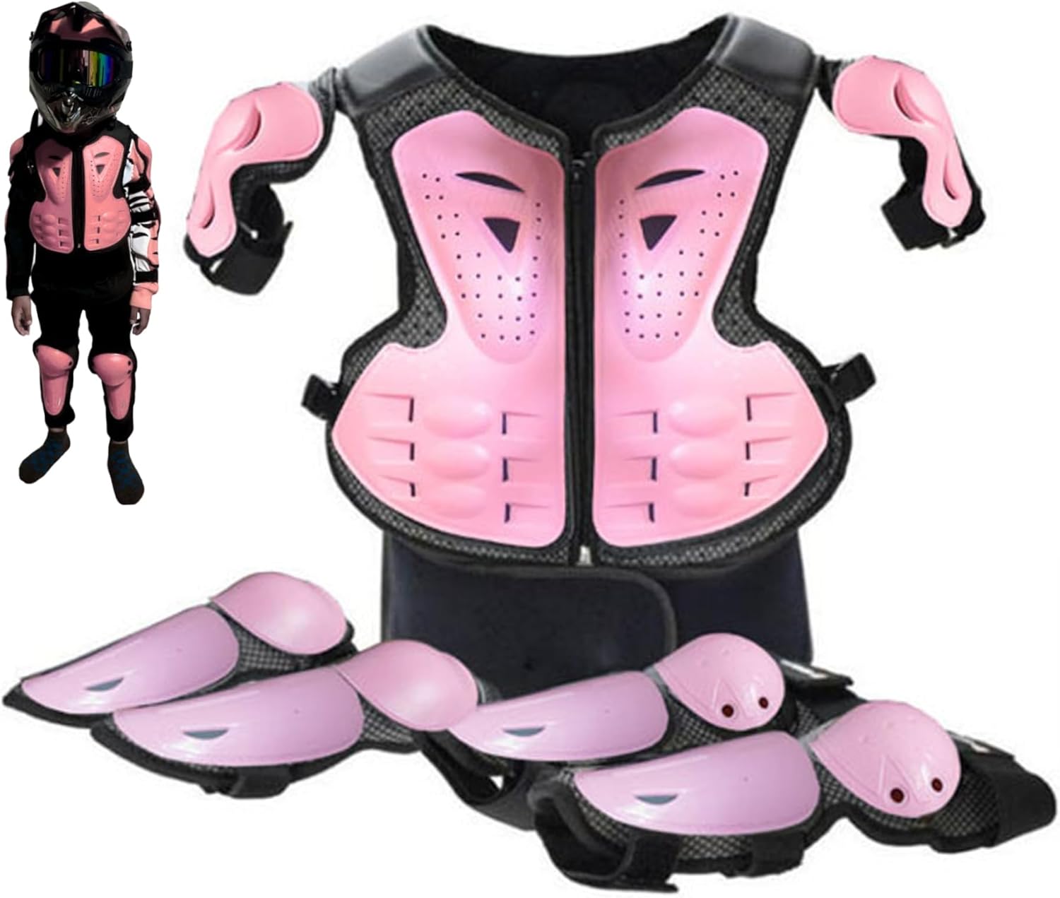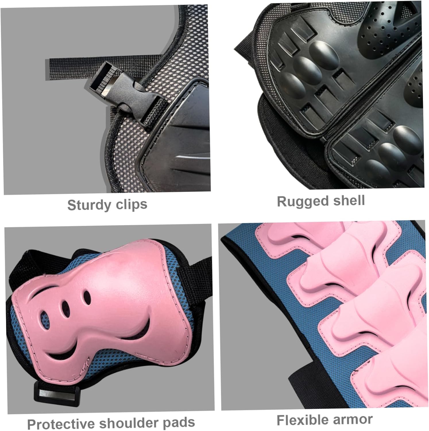 Robusta protezione dell'armatura: dotata di una superficie robusta e di un rivestimento interno, l'armatura fornisce una protezione affidabile dagli impatti per ginocchia, gomiti e spalle, proteggendo i bambini da cadute e collisioni con durata e standard di sicurezza migliorati. Caratteristiche di sicurezza complete: include protezioni per le spalle integrate e imbottiture di copertura estese che forniscono una protezione più completa, combinate con un'imbottitura interna traspirante che migliora il comfort e l'assorbimento degli urti per i bambini attivi. Design confortevole e traspirante: realizzato in tessuto a rete traspirante, questo abbigliamento da moto per bambini garantisce una circolazione dell'aria ottimale per mantenere i giovani ciclisti freschi e comodi durante attività intense come il ciclismo su sporcizia o il pattinaggio a rotelle, riducendo al minimo il sudore e l'irritazione anche nelle giornate calde. Costruzione flessibile e leggera: progettata con armatura posteriore flessibile e materiali leggeri, questa attrezzatura offre piena mobilità senza aggiungere volume. Ciò significa che i bambini possono muoversi liberamente e in sicurezza e allo stesso tempo godere di una protezione completa senza sentirsi limitati. Comodità a sgancio rapido: questo set di protezioni è caratterizzato da un design a sgancio rapido, che lo rende facile da indossare e da togliere. Ciò fa risparmiare tempo a bambini e genitori garantendo al tempo stesso una vestibilità sicura che non compromette la sicurezza durante le avventure.