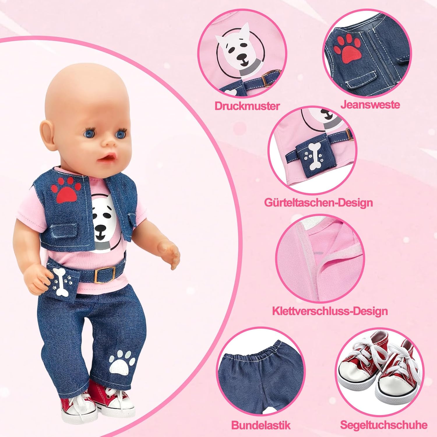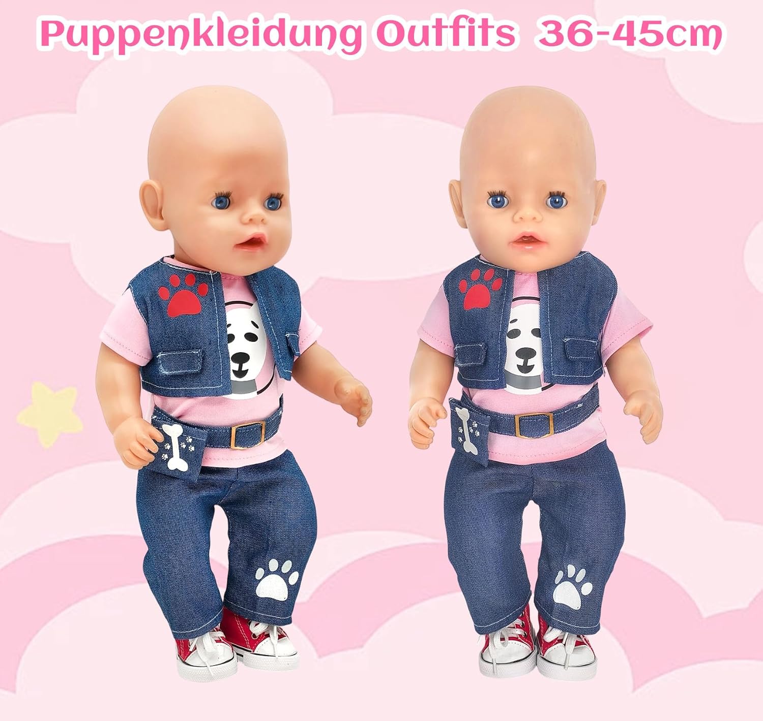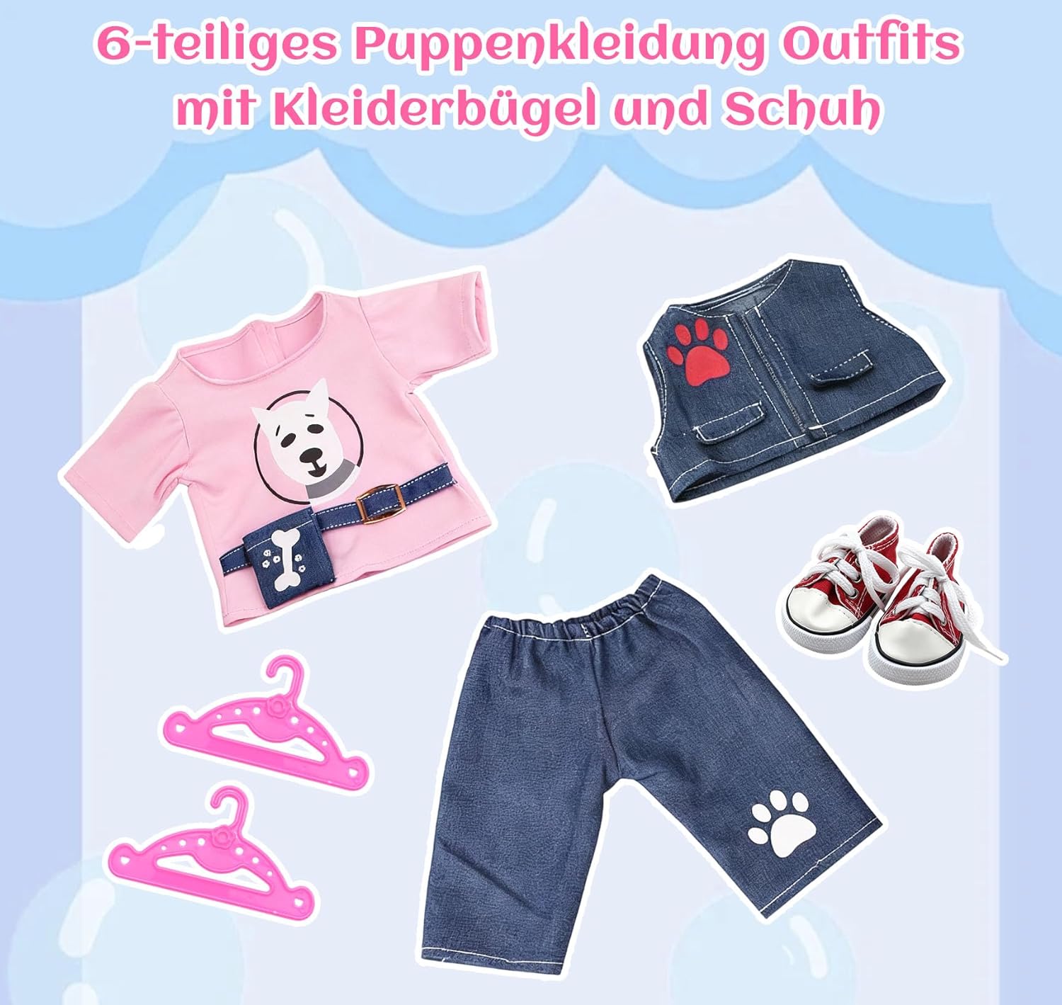 Elegante set di 3 pezzi: la maglia con simpatico motivo cane e design alla moda a marsupio combinato con gilet e pantaloni, aggiunge colore e fantasia alla cameretta dei bambini. Scarpe da ginnastica rosse alla moda: le scarpe da bambola rosso brillante completano l'outfit – alla moda e giocoso! Vestiti per bambole da 43 cm: questo set di vestiti per bambole da 6 pezzi è stato progettato appositamente per bambole con una dimensione di 35-43 cm, adatto per molte bambole di marca comune. Splendido regalo con 2 grucce rosa: include 2 grucce rosa. L'abbigliamento per bambole è perfetto come regalo per le piccole amanti delle bambole. Facile da indossare e da togliere con un effetto di apprendimento: grazie alla chiusura in e al design elastico, i vestiti sono facili da indossare e togliere dalle mani piccole, ideali per promuovere l'autonomia e le abilità motorie. Un regalo amorevole per ogni occasione: Natale, compleanno o semplicemente come piccola sorpresa di tanto in tanto, ideale per le piccole amanti delle bambole.