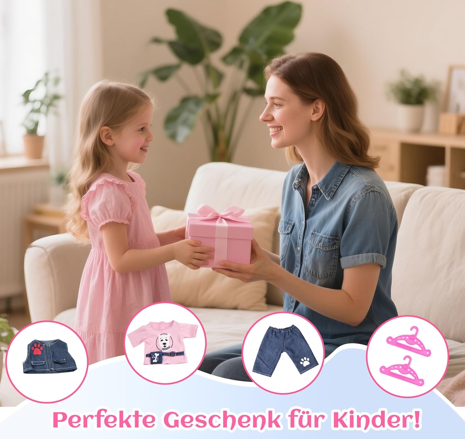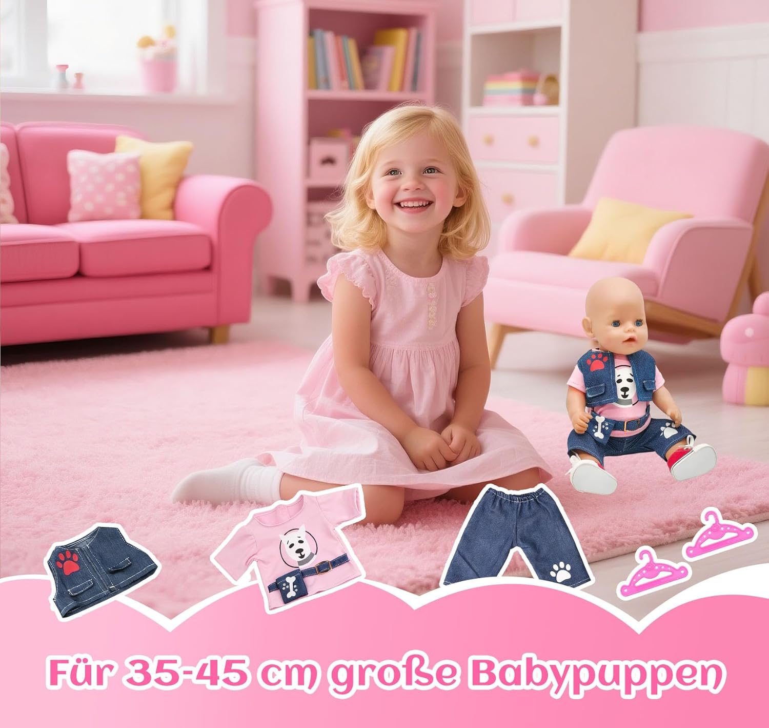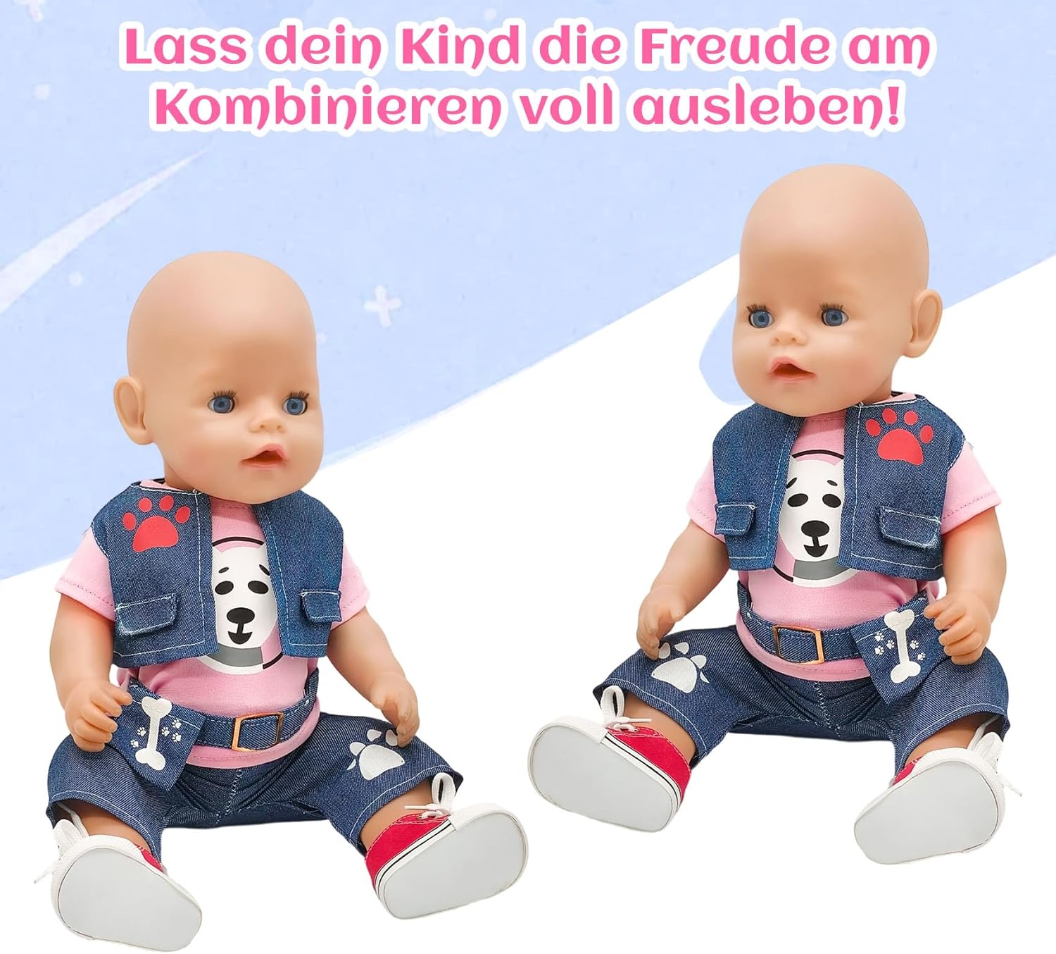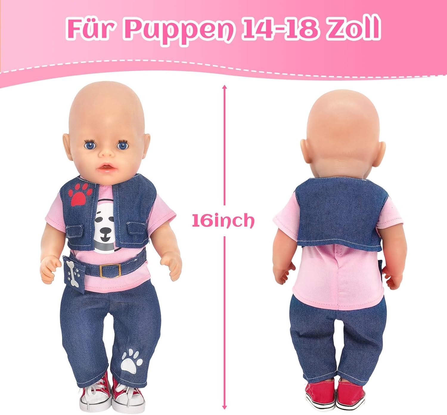 Elegante set di 3 pezzi: la maglia con simpatico motivo cane e design alla moda a marsupio combinato con gilet e pantaloni, aggiunge colore e fantasia alla cameretta dei bambini. Scarpe da ginnastica rosse alla moda: le scarpe da bambola rosso brillante completano l'outfit – alla moda e giocoso! Vestiti per bambole da 43 cm: questo set di vestiti per bambole da 6 pezzi è stato progettato appositamente per bambole con una dimensione di 35-43 cm, adatto per molte bambole di marca comune. Splendido regalo con 2 grucce rosa: include 2 grucce rosa. L'abbigliamento per bambole è perfetto come regalo per le piccole amanti delle bambole. Facile da indossare e da togliere con un effetto di apprendimento: grazie alla chiusura in e al design elastico, i vestiti sono facili da indossare e togliere dalle mani piccole, ideali per promuovere l'autonomia e le abilità motorie. Un regalo amorevole per ogni occasione: Natale, compleanno o semplicemente come piccola sorpresa di tanto in tanto, ideale per le piccole amanti delle bambole.