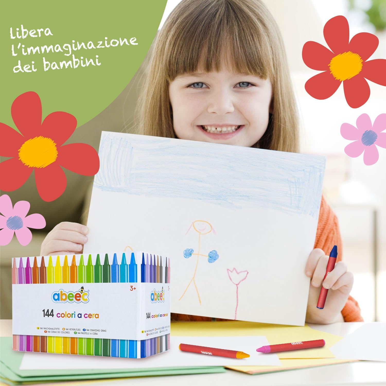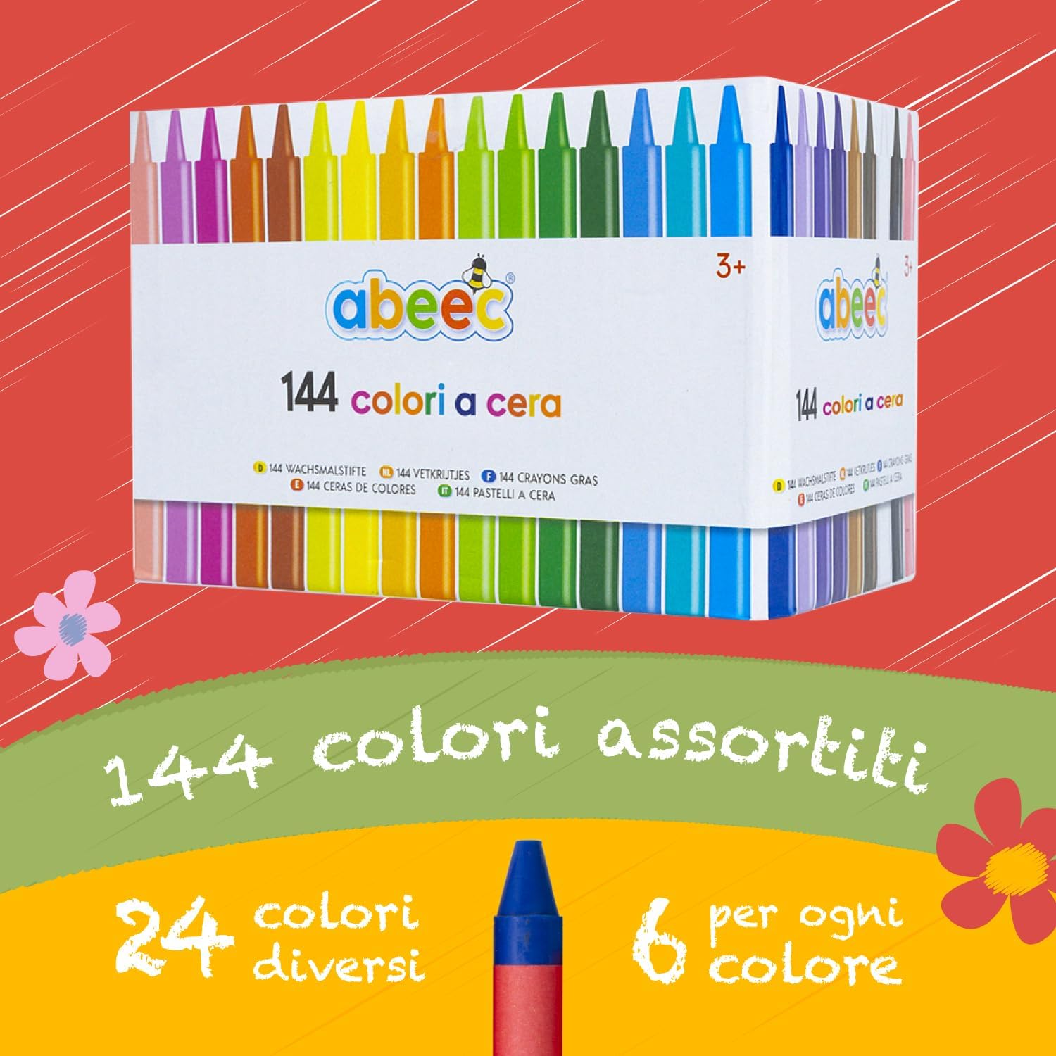 abeec 144 pastelli in colori assortiti Questi pastelli per bambini includono 144 pastelli a cera in una scatola di cartone che possono essere utilizzati come stoccaggio tra l'uso I pastelli da colorare sono disponibili in 24 diversi colori con 6 di ciascuno inclusi. Una gamma di sfumature di colore incluse: giallo, rosa, viola, blu, nero e molto altro ancora Pastelli con un diametro di 0,8 cm per supportare una vasta gamma di attività artigianali: i pastelli arrivano già affilati pronti per essere utilizzati subito Il gran numero di pastelli inclusi in questa confezione rende questi pastelli ideali per attività artigianali di famiglia o aule scolastiche