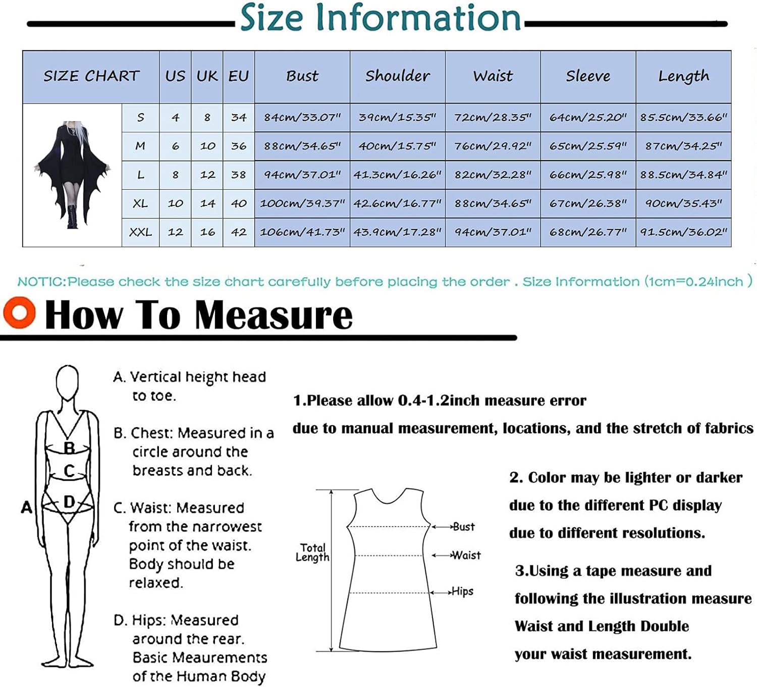 Questo abito gotico è realizzato con tessuti di alta qualità. Il tessuto principale dell'abito gotico è il poliestere. È delicato sulla pelle, leggero e ti fa sentire a tuo agio. Mini abito gotico: il design slim fit a vita alta modifica le linee della pancia e della vita, rendendo la vita più liscia e più bella. Questo abito aderente si adatta a tutte le forme ed è ideale per le donne che amano indossare abiti. I modelli divertenti possono rendervi la star della vostra festa di Halloween. Bastano un semplice make-up spettrale e un paio di tacchi alti per far risaltare questo vestito! Occasioni adatte: un costume perfetto per la festa, il costume di Halloween, il cosplay, la sfilata in discoteca, ecc. Consulta la tabella delle taglie prima di ordinare per trovare la vestibilità perfetta possibile.
