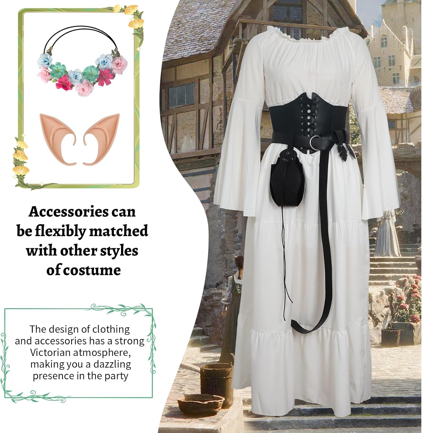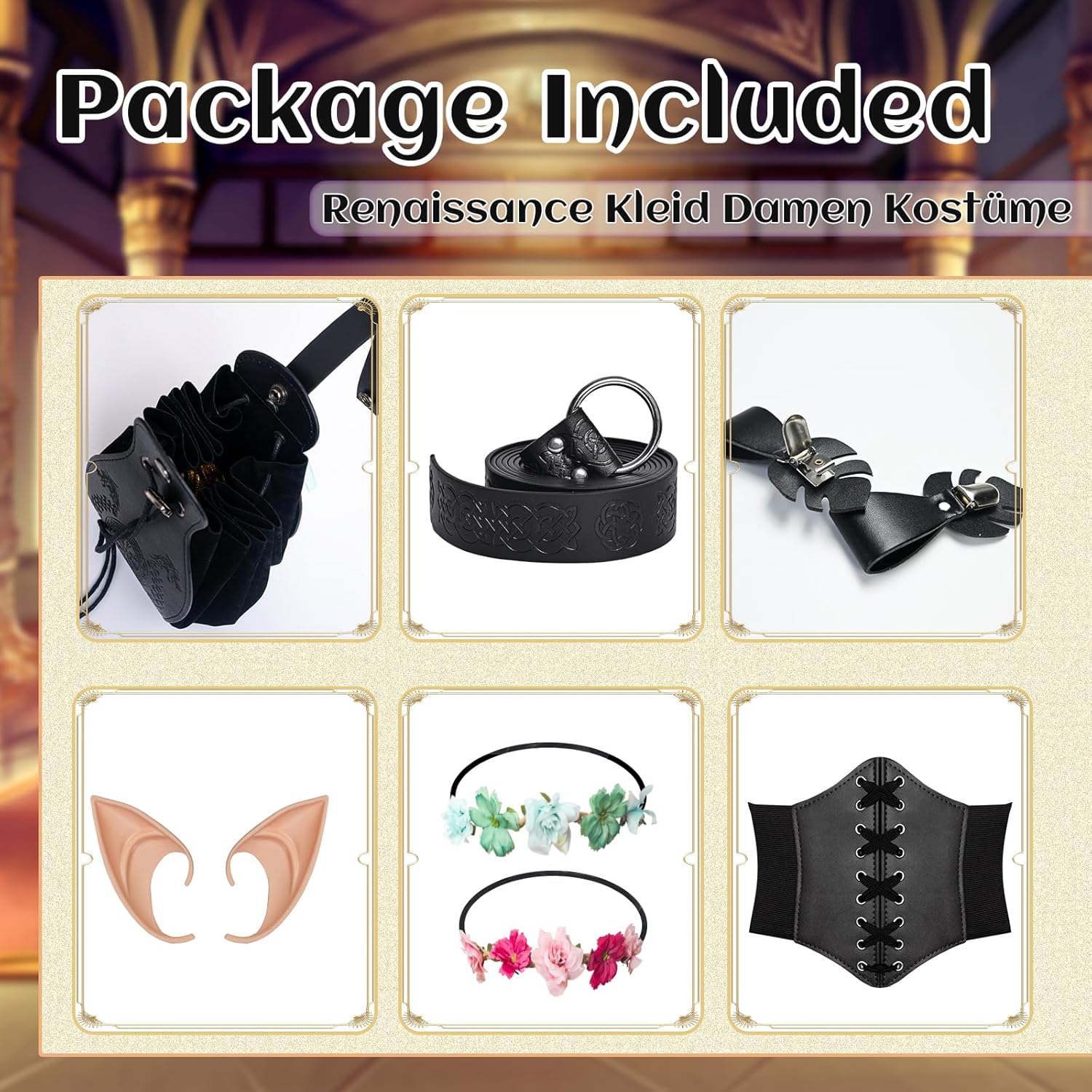 Meine Tochter (Gr. 164) trägt das Bild in Gr. S auf einer Halloweenparty. Normalerweise trägt sie XS und ich werde das Kleid am Saum etwas kürzen. Das Material des Kleides ist ein fester, aber dennoch leicht glatter Stoff, der nicht zu 100 % blickdicht ist. Die Nähte des Kleides sind versäubert und sehr ordentlich vernäht. Man könnte es auch als Sommerkleid oder auf Mittelaltermärkten tragen. Es sieht nicht unbedingt wie ein Kostüm aus. Die Korsage wird am Rücken mittels eines breiten und starkem Klettverschluss verschlossen. Es besteht ein kleiner Spielraum beim Umfang. Der zusätzliche Gürtel für den Beutel und die beiden Haken ist so lang, dass er fast 2x um den Körper passt und dadurch einen super Halt bietet. Der Beutel bietet Stauraum für Handy/Taschentücher/Schlüssel. Auch dieses Zubehör ist super verarbeitet und mit liebevollen Details bestückt. Die Elfenohren passen gut. Sie drücken nicht und verrutschen auch nicht. Die Haarkränze sind sehr schön, aber etwas stramm. Das Kostüm ist deutlich hochwertiger als die üblichen Kostüme aus dem Discounter. Ich habe schon überlegt, ob man es färben könnte, bin mir aber aufgrund des Stoffes nicht sicher, ob dieser Farbe annimmt. Der Preis ist noch im Rahmen für Kleid inkl. umfangreichem Zubehör.