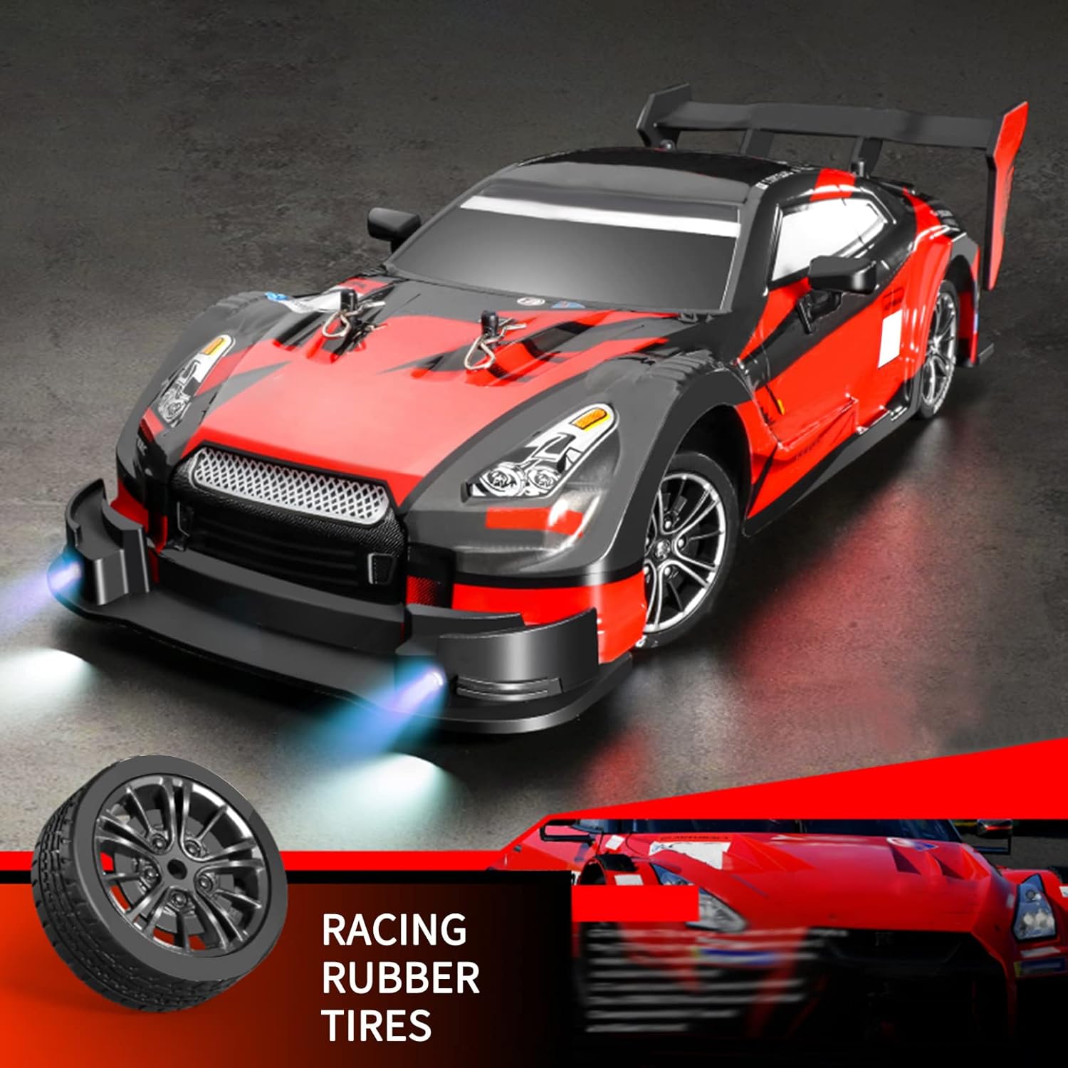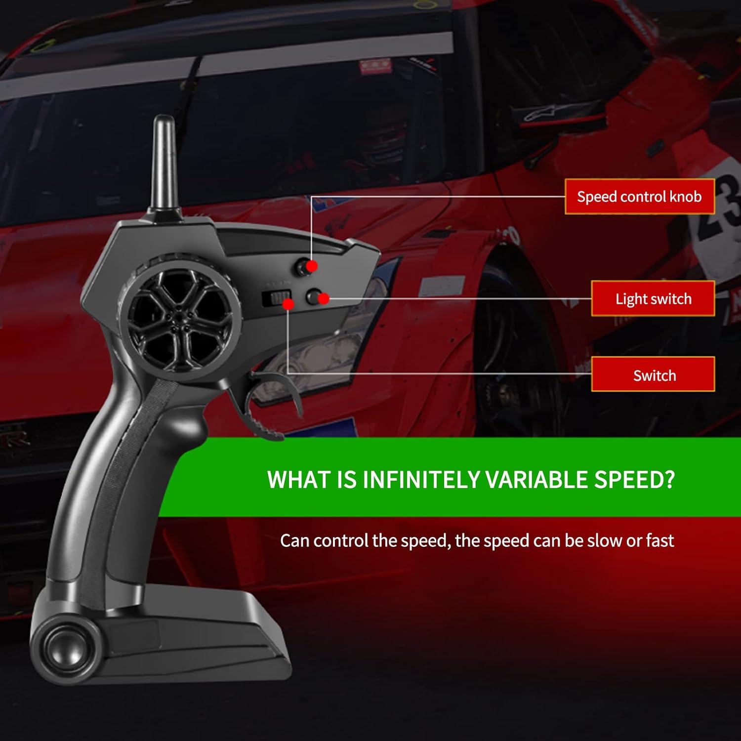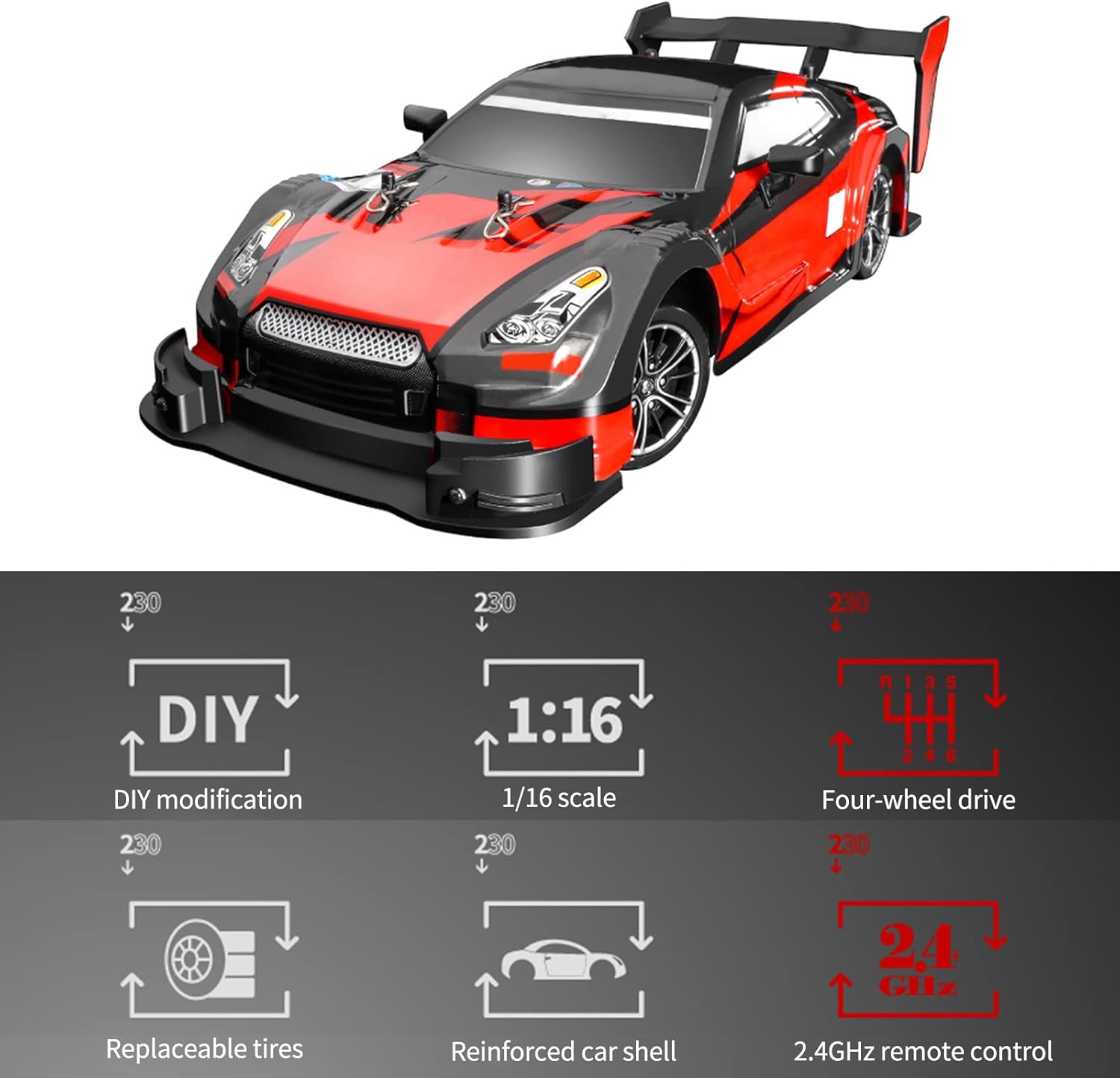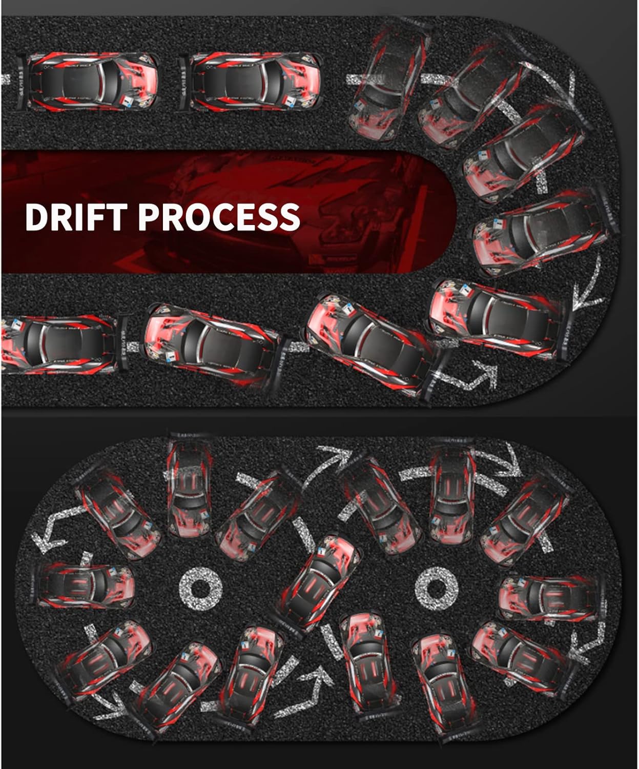 Funzioni: avanti, indietro, girare a sinistra e a destra, 4 WD, 40 km/h, aspetto fresco, sistema di trasmissione a 2,4 GHz, telecomando completo. Sistema di controllo del rapporto a 2,4 GHz: la distanza massima di controllo è superiore a 100 m, due o più veicoli RC possono viaggiare insieme senza confusione remota. Super Power System: il motore Superpower e il sistema di trazione integrale portano una velocità di oltre 40 km/h. Materiale solido: guscio auto di alta qualità realizzato in materiale PVC, come una vera auto, eccellente flessibilità per prevenire gli effetti di rotture. Pneumatici intercambiabili: dotato di un set di ruote drif (4 pezzi), puoi goderti il divertimento della deriva.