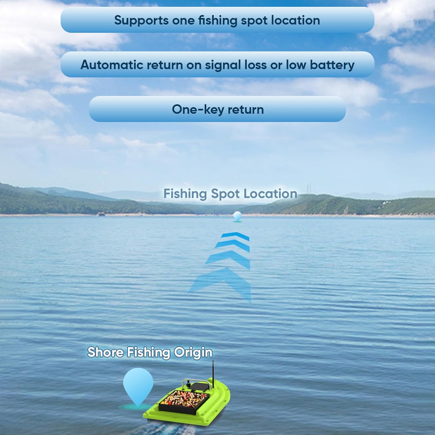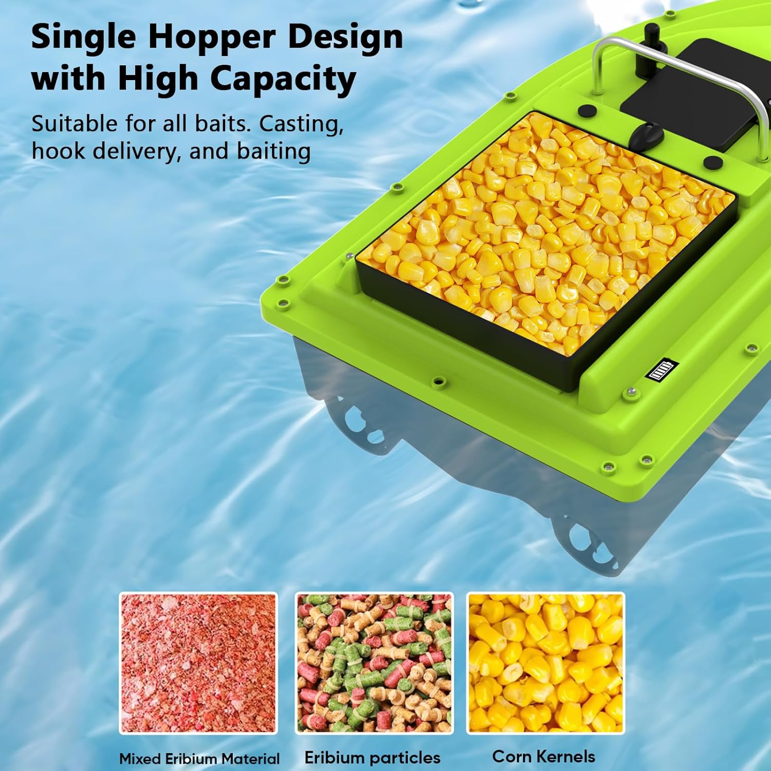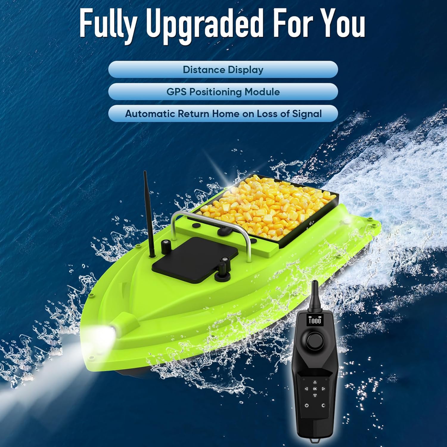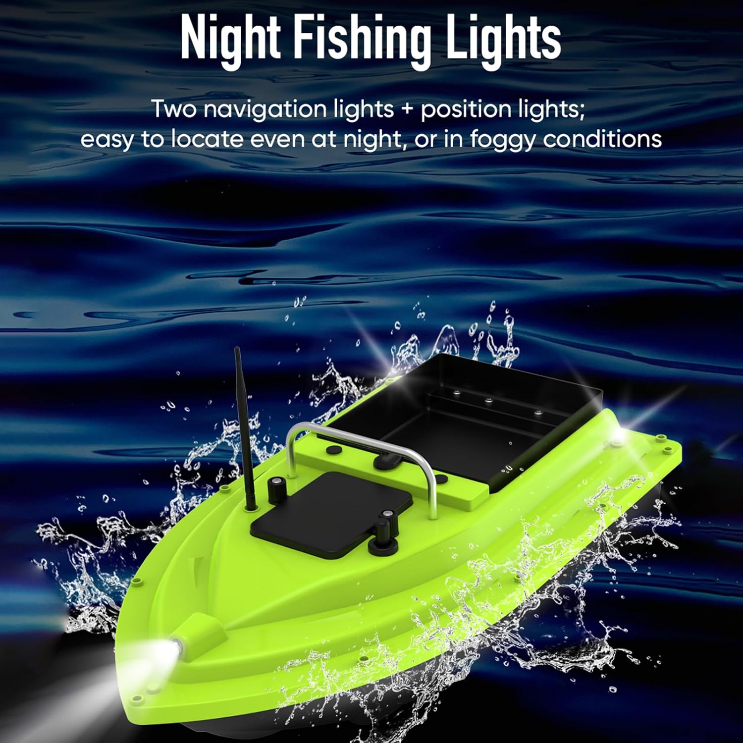 Doppia localizzazione: torna facilmente al punto di partenza o alla posizione di pesca con la funzione di ritorno con un solo pulsante e ritorno automatico in caso di perdita di segnale o batteria scarica. Controllo remoto: goditi il funzionamento a mani libere con il telecomando wireless fino a 500 metri. In questo modo puoi guidare a velocità costante e concentrarti completamente sulla pesca. Durata prolungata: grazie alla potente batteria, questo modulo offre un basso consumo energetico e una lunga durata, consentendo di pescare più a lungo senza interruzioni. Migliore visibilità: Rimani visibile e sicuro anche in condizioni difficili con due luci di navigazione e di posizione. Così troverai facilmente il tuo posto di pesca anche di notte o in caso di nebbia. Barca grande per esche: design a cabina singola con capacità di carico estremamente grande, adatto per tutti i tipi di lancio e ganci.