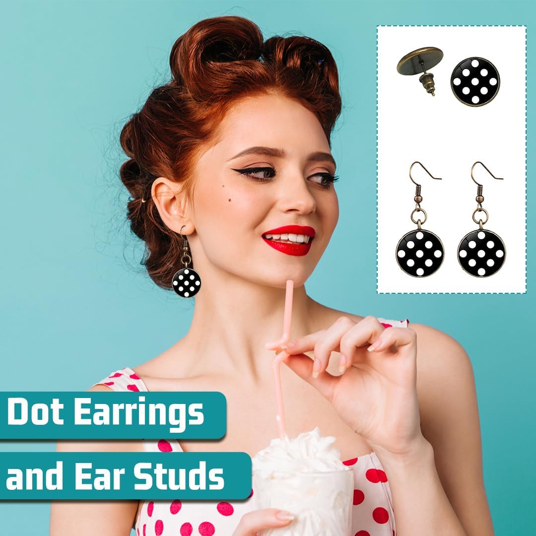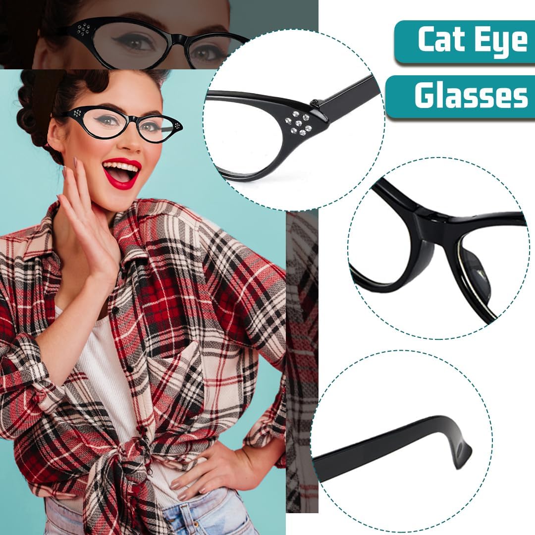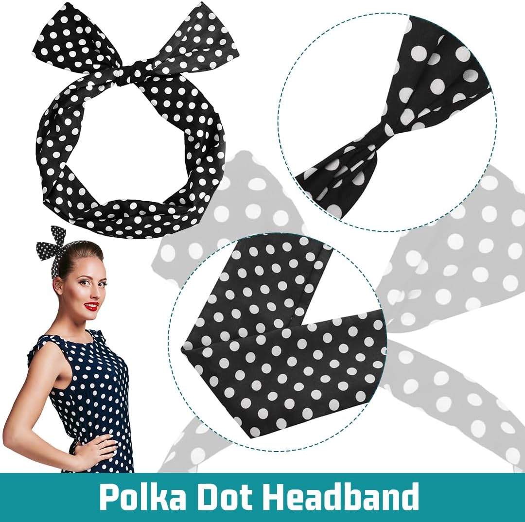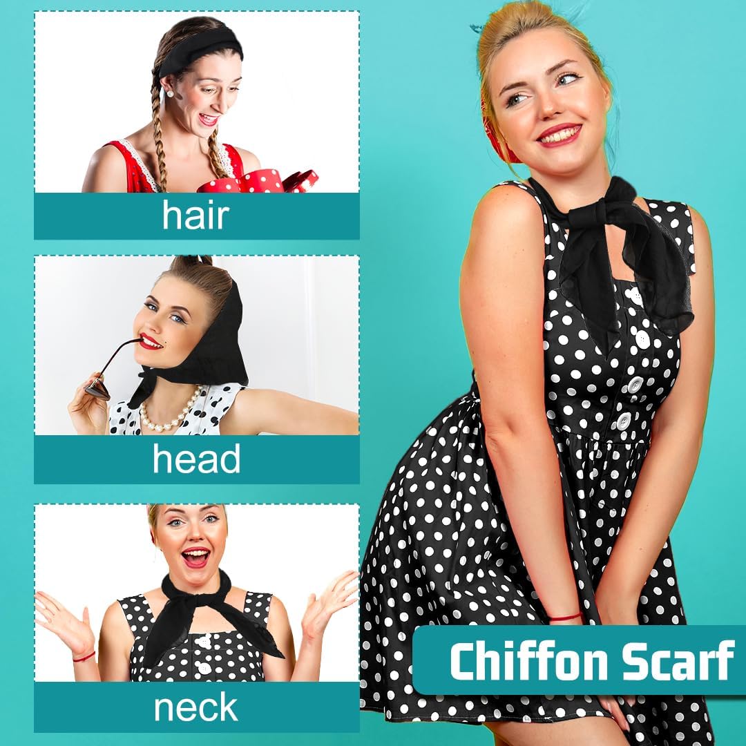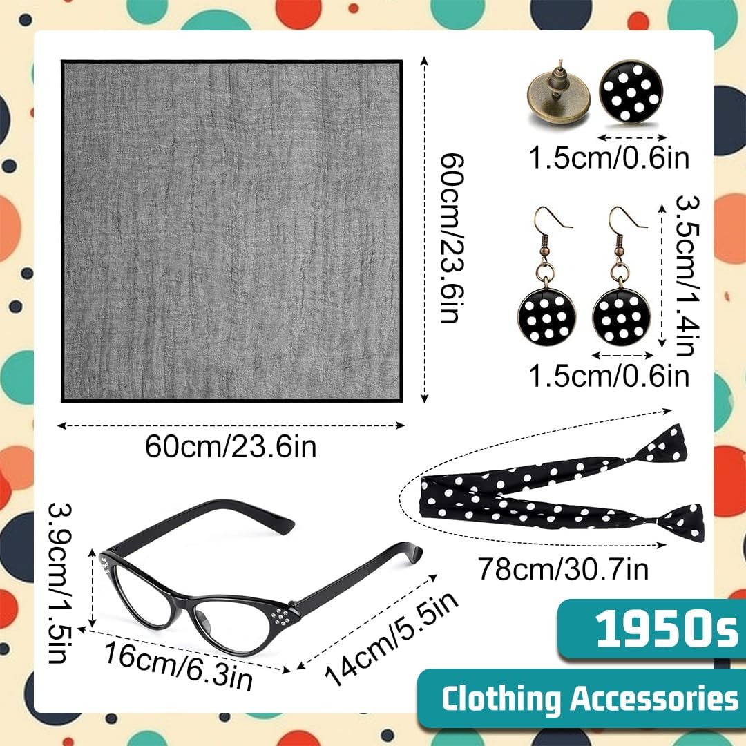 👸 Accessori Anni 50 Donna, 7 Pezzi Vintage Neri Set di Accessori per Costumi Anni '50 '60, Sciarpe in Chiffon + Fascia per Capelli Cerchietti a Pois + Occhiali di Gatto + Orecchini per Donna Ragazze Feste di Compleanno Carnevale Halloween 👸 👸 Specifiche: 👸 Prodotto: Accessori Anni 50 Donna Materiale: chiffon, plastica Colore: nero Dimensioni: come mostra l'immagine Quantità: set da 5 Peso: 70 g 👸 Caratteristiche: 👸 - Set di accessori completi per costumi da donna degli anni '50, non è necessario perdere tempo extra per coordinare i tuoi abiti. - Gli occhiali neri adottano un simpatico design cat eye, ornato con strass lucenti sulla montatura, pieno di fascino. - Fascia flessibile a pois, facile da annodare con un nodo morbido intorno alla testa, ideale per qualsiasi colore di capelli. - Due paia di orecchini a pois da indossare, ti fanno essere una donna elegante. - Sciarpa vintage in chiffon nero, è un accessorio ideale per donne e ragazze, può essere indossato intorno al collo, alla testa e ai capelli. - Si abbina bene a molte occasioni, tra cui feste a tema anni '50, feste di compleanno, feste rock, cosplay, balli da discoteca, carnevali, feste di Halloween e Natale, costumi anni '50 e spettacoli di danza, ecc. 👸 Accessori per Costume da Anni '50 Donna: 👸 1 x fascia per capelli a pois 1 x sciarpa di chiffon nero 1 x paio di occhiali a forma di occhio di gatto 2 x paia di orecchini a pois