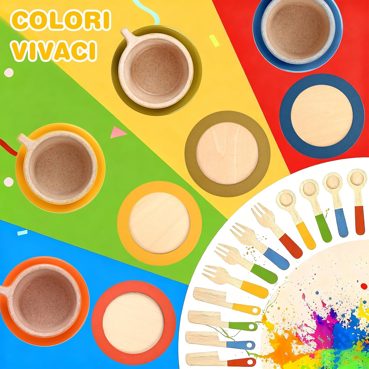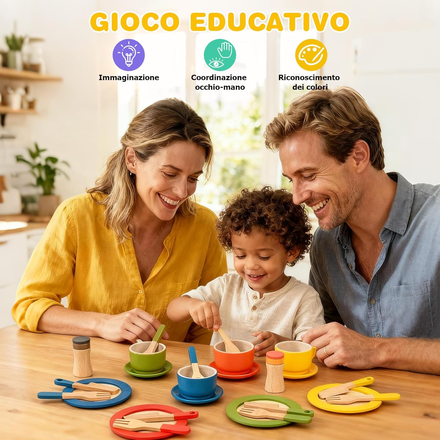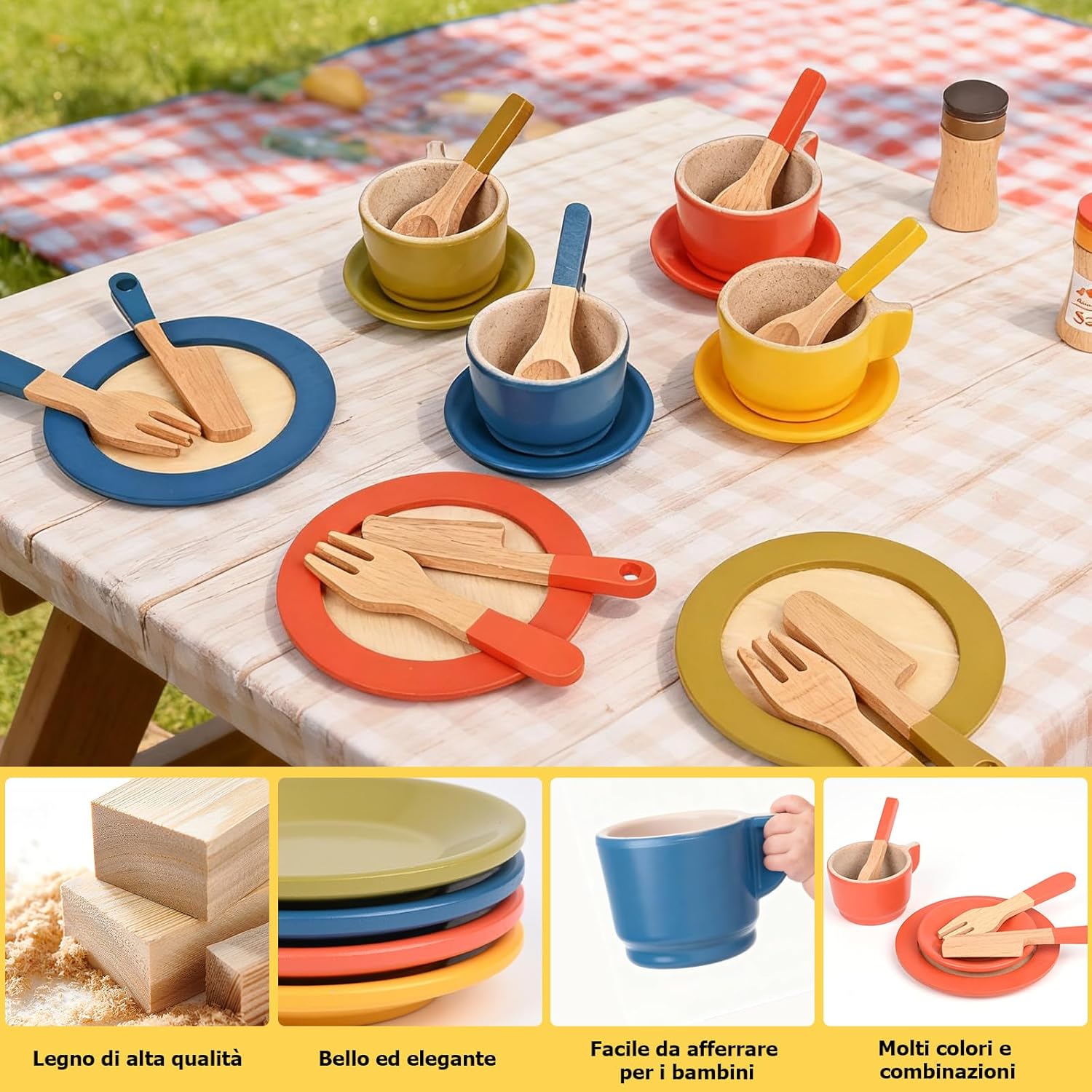 GIOCO SICURO PER I BAMBINI: Gli accessori cucina bambini sono realizzati in legno di alta qualità con vernice a base d'acqua atossica e inodore e bordi lisci. Prevengono le lesioni e sono più sicuri dei giocattoli di plastica, ideali per le mani sensibili dei bambini. PROMUOVE IL GIOCO E LO SVILUPPO FANTASTICO: Questo set cucina bambini incoraggia il gioco di ruolo fantasioso con colori vivaci e dettagli realistici, supportando in modo giocoso lo sviluppo del linguaggio e l'interazione sociale. Ideale per bambini dai 3 anni in su. RESISTENTE ED ECOLOGICO: Il robusto materiale in legno resiste al gioco intensivo ed è più sostenibile della plastica. Gli accessori cucina bambini sono resistenti all'usura e allo sporco, garantendo un uso prolungato e un bell'aspetto. COMPLETAMENTE ATTREZZATO: Include 4 sottobicchieri, 4 piatti, 4 forchette, 4 coltelli, 4 cucchiai, 4 tazze e 2 barattoli di spezie: tutto per autentiche esperienze culinarie e di servizio che delizieranno i piccoli chef. IDEA REGALO PERFETTA PER I BAMBINI: Questo accessorio da cucina è ideale come regalo per compleanni, Natale o altre occasioni. Incoraggia il gioco creativo ed è apprezzato dai bambini di tutte le età.