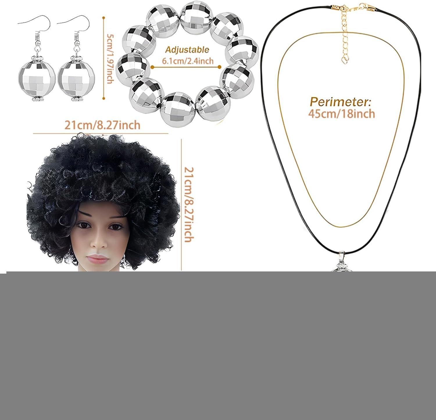 Questo set comprende una splendida collana palla discoteca e 1 paio di orecchini che sono sicuri di sotto qualsiasi palla da discoteca. Perfetti per qualsiasi festa in discoteca, i nostri gioielli presentano una forte lucentezza e una luce brillante che cattureranno l'attenzione di tutti. Inoltre, è un regalo squisito per quell'amante degli anni '70 nella tua vita. Specifiche tecniche: Nome: 1970 Donna Disco Accessori Set Materiale: fibra sintetica + polipropilene. Dimensioni del prodotto: come da immagine. Peso: circa 230 g. Contenuto della confezione: 1 x capelli corti ricci anni '70. 1 paio di orecchini a sfera da discotec 1 collana con palla da discoteca. 1 braccialetto con palla da discoteca. Occhiali da sole con montatura x1 Nota: 1. A causa delle diverse impostazioni degli schermi e degli effetti della luce, il colore reale del prodotto potrebbe essere leggermente diverso da quello mostrato nella foto. Grazie! 2. A causa della misurazione manuale, è possibile un margine di errore di 1-3 cm.