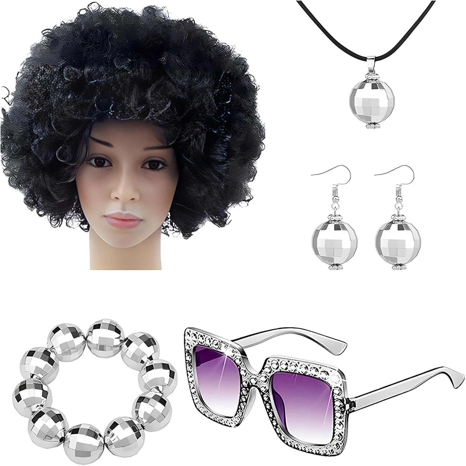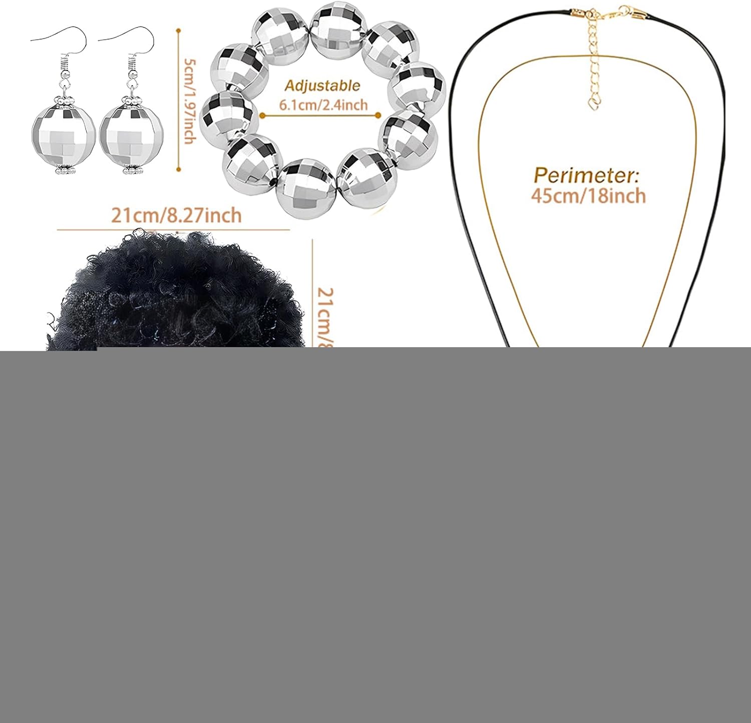 Questo set comprende una splendida collana palla discoteca e 1 paio di orecchini che sono sicuri di sotto qualsiasi palla da discoteca. Perfetti per qualsiasi festa in discoteca, i nostri gioielli presentano una forte lucentezza e una luce brillante che cattureranno l'attenzione di tutti. Inoltre, è un regalo squisito per quell'amante degli anni '70 nella tua vita. Specifiche tecniche: Nome: 1970 Donna Disco Accessori Set Materiale: fibra sintetica + polipropilene. Dimensioni del prodotto: come da immagine. Peso: circa 230 g. Contenuto della confezione: 1 x capelli corti ricci anni '70. 1 paio di orecchini a sfera da discotec 1 collana con palla da discoteca. 1 braccialetto con palla da discoteca. Occhiali da sole con montatura x1 Nota: 1. A causa delle diverse impostazioni degli schermi e degli effetti della luce, il colore reale del prodotto potrebbe essere leggermente diverso da quello mostrato nella foto. Grazie! 2. A causa della misurazione manuale, è possibile un margine di errore di 1-3 cm.