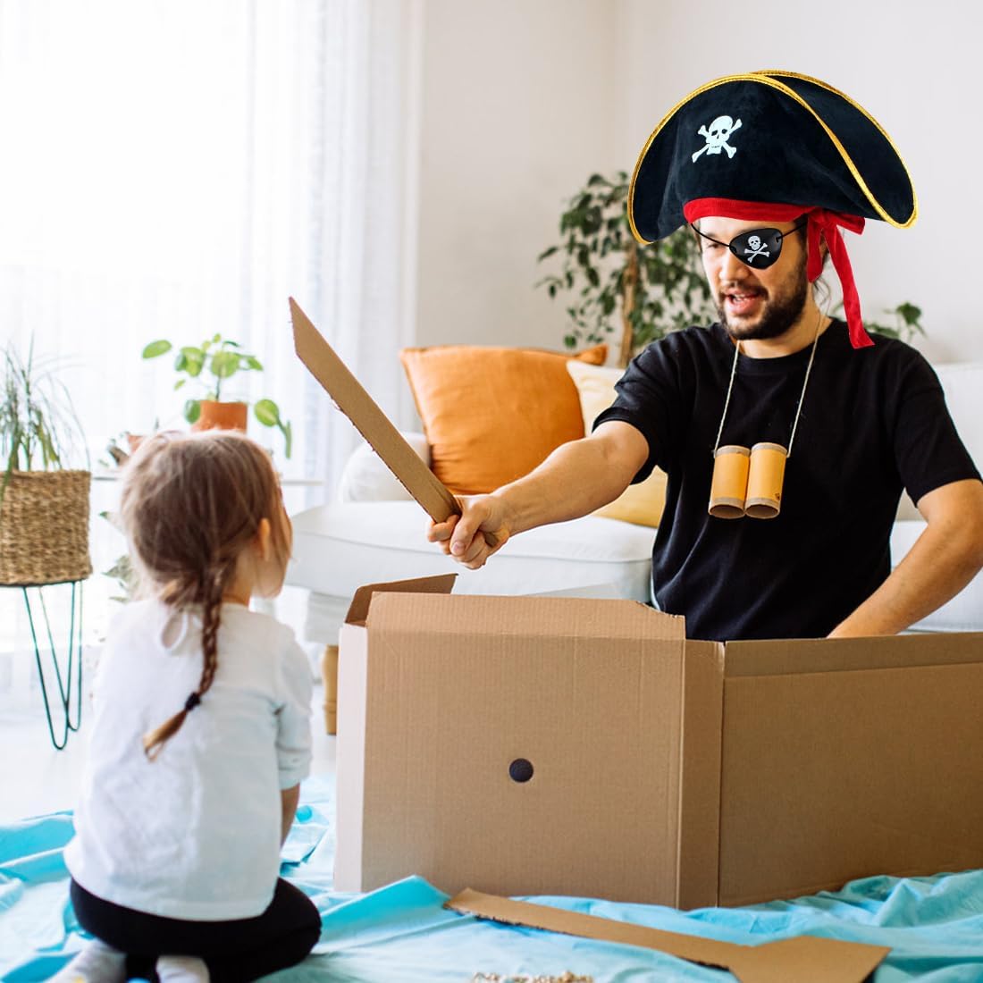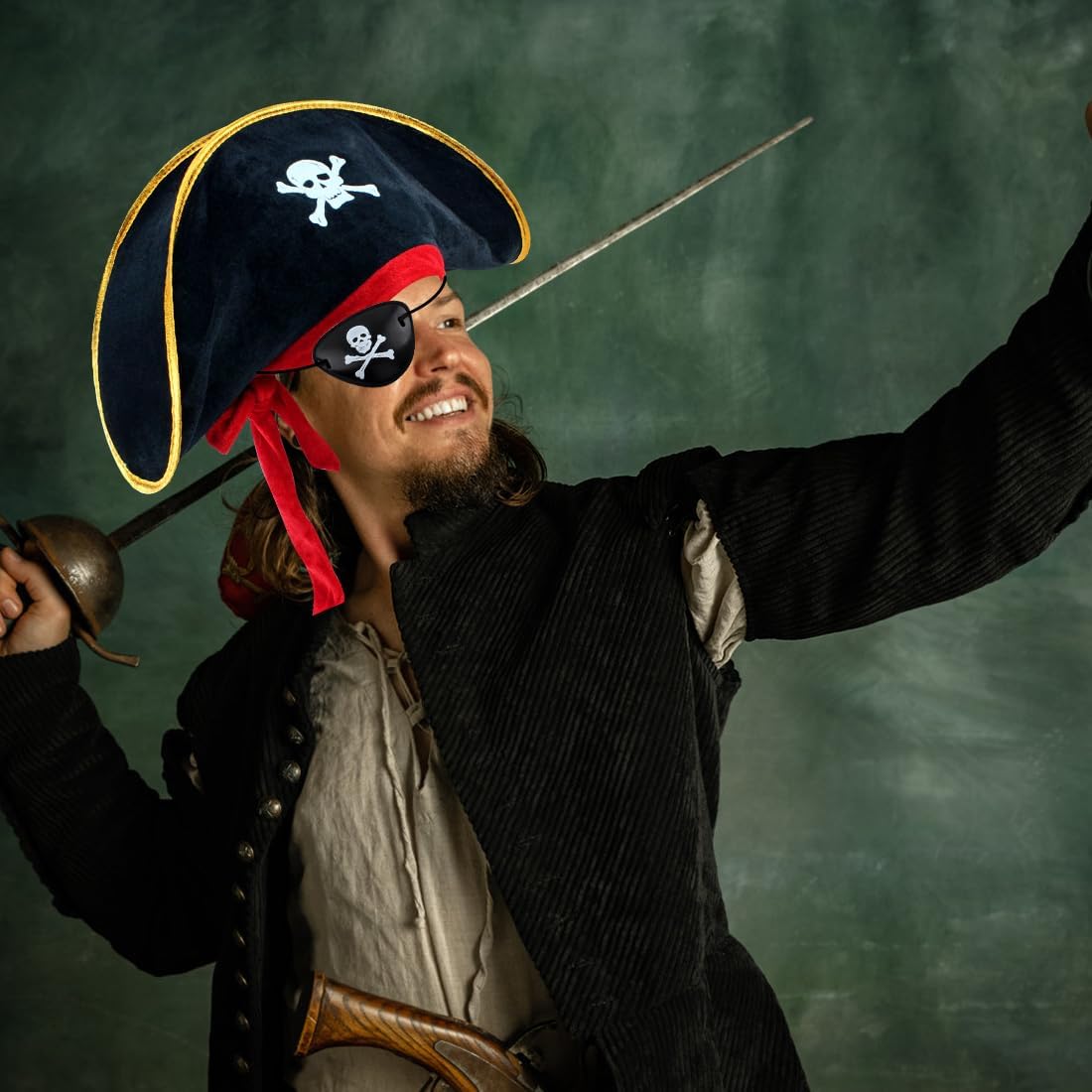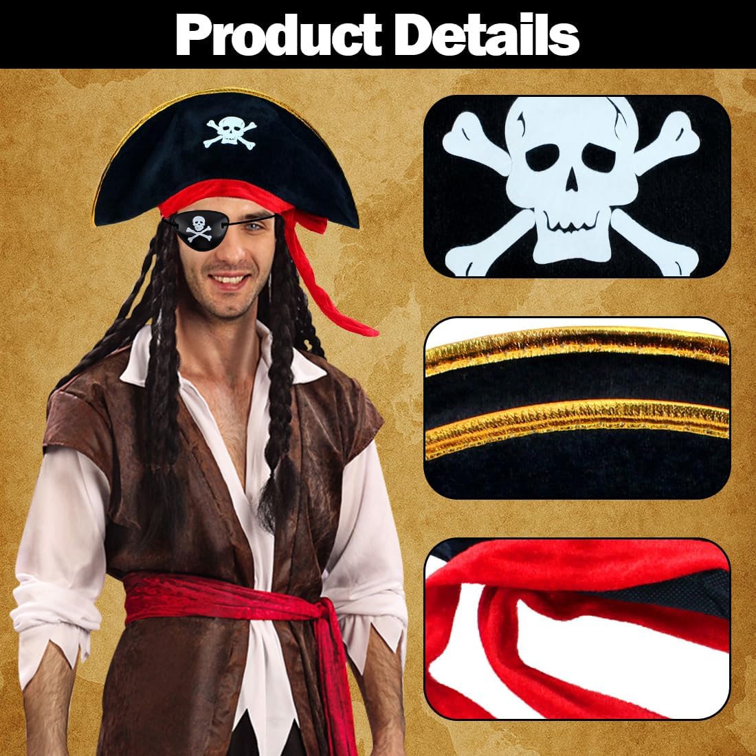 Descrizione del prodotto Accessori da pirata, Cappello da pirata, Benda da pirata per bambini e adulti, Stampa con teschio, Cappellino per costume da Capitano di Halloween, Oggetti di scena per feste, Articoli per feste in maschera caraibica Avviso di sicurezza No