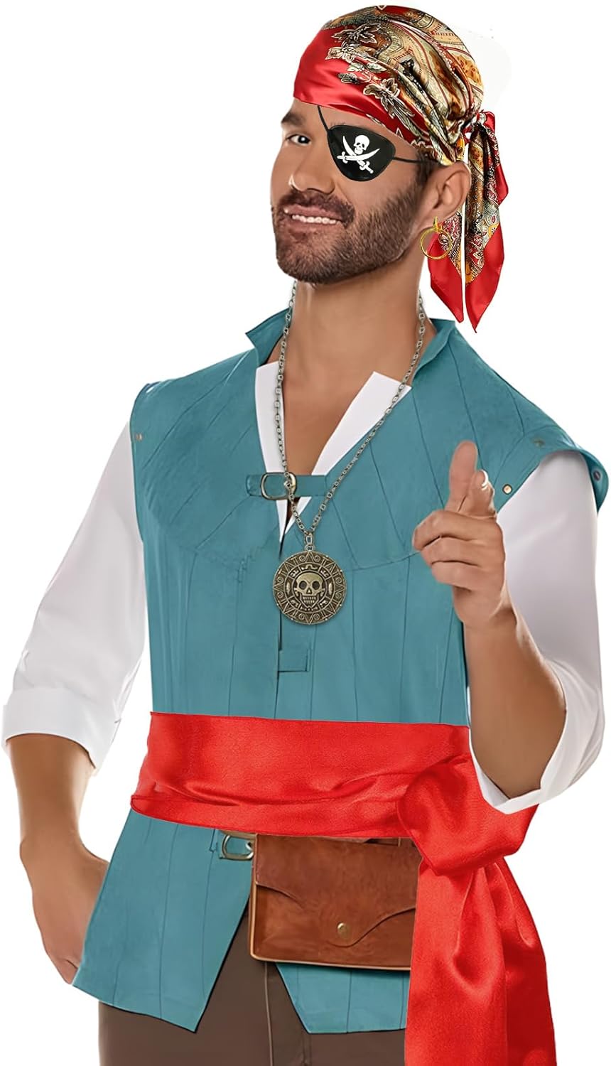 Questo set di 5 accessori da pirata include 1 bandana con stampa vintage, una cintura in raso rosso*1, una benda pirata*1, orecchini*1 e una collana con teschio pirata*1. L'intero look da pirata è molto vintage e alla moda, si adatta a qualsiasi costume da pirata e soddisfa le tue esigenze per feste e feste. Questo set di accessori da pirata che ha una taglia unica è adatto per la maggior parte delle persone e può essere indossato sia da uomini che da donne. Il foulard ha una dimensione di circa 90 (L) x 90 (W)CM/35.43(L)*35.43(W)IN.Die Länge des Gürtels beträgt ca. 100 (L)*10(W)CM/78.74(L)*3.93(W)IN.Sie können die Größe des Bandes des Kopftuches und des Gürtels an Ihre Bedürfnisse anpassen. La maschera per gli occhi viene fornita con un cordino elastico per una facile regolazione, rendendola comoda da indossare. Il foulard e la cintura di questo accessorio pirata sono realizzati in raso, colori stampati vivaci, lisci e confortevoli, belli e traspiranti. La collana a disco dei pirati è realizzata in lega di alta qualità, robusta e durevole, non facile da sbiadire, fresca e alla moda da indossare. Si consiglia di ridurre al minimo il risciacquo dell'acqua e la macchia acida per evitare graffi. Il nostro foulard pirata ha un design vintage stampato su sfondo rosso per aggiungere un'estetica unica. La benda per gli occhi dei pirati ha un motivo a teschio pirata. La collana ha anche un motivo pirata e uno stile retrò gotico. Gli accessori vintage a pirata sono perfetti per carnevale, carnevale, Halloween, feste a tema cosplay, feste a tema pirata, servizi fotografici, spettacoli, sfilate di mardi, feste di compleanno, feste di crociera e molte altre occasioni. Sottolineate il vostro fascino unico con gli accessori pirati.